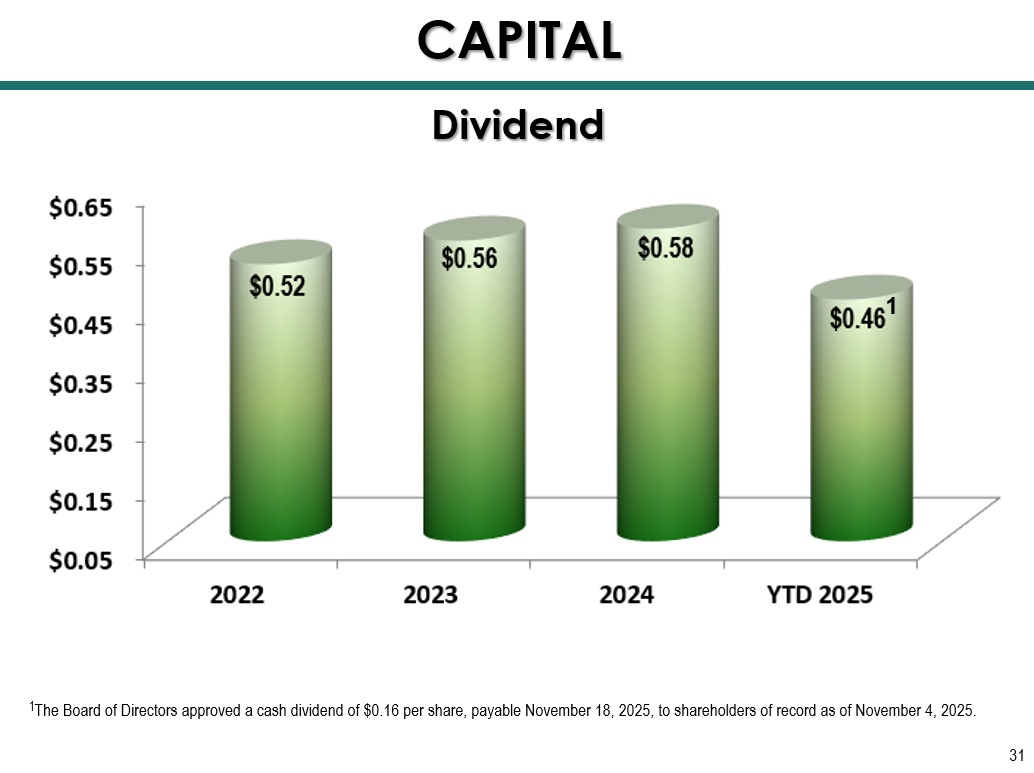 30 Tangible Book Value CAPITAL Tangible Common Equity Dividend 31 CAPITAL 1 The Board of Directors approved a cash dividend of $0.16 per share, payable November 18, 2025, to shareholders of record as o f N ovember 4, 2025.