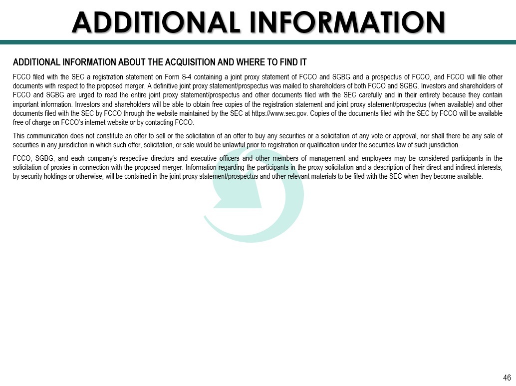 ADDITIONAL INFORMATION 46 ADDITIONAL INFORMATION ABOUT THE ACQUISITION AND WHERE TO FIND IT FCCO filed with the SEC a registration statement on Form S - 4 containing a joint proxy statement of FCCO and SGBG and a prospectus of FCCO, and FCCO will file other documents with respect to the proposed merger . A definitive joint proxy statement/prospectus was mailed to shareholders of both FCCO and SGBG . Investors and shareholders of FCCO and SGBG are urged to read the entire joint proxy statement/prospectus and other documents filed with the SEC carefully and in their entirety because they contain important information . Investors and shareholders will be able to obtain free copies of the registration statement and joint proxy statement/prospectus (when available) and other documents filed with the SEC by FCCO through the website maintained by the SEC at https : //www . sec . gov . Copies of the documents filed with the SEC by FCCO will be available free of charge on FCCO’s internet website or by contacting FCCO . This communication does not constitute an offer to sell or the solicitation of an offer to buy any securities or a solicitation of any vote or approval, nor shall there be any sale of securities in any jurisdiction in which such offer, solicitation, or sale would be unlawful prior to registration or qualification under the securities law of such jurisdiction . FCCO, SGBG , and each company’s respective directors and executive officers and other members of management and employees may be considered participants in the solicitation of proxies in connection with the proposed merger . Information regarding the participants in the proxy solicitation and a description of their direct and indirect interests, by security holdings or otherwise, will be contained in the joint proxy statement/prospectus and other relevant materials to be filed with the SEC when they become available .