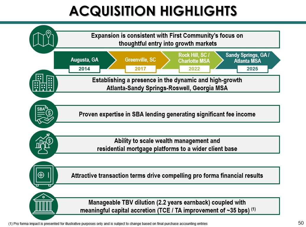 (2) Reflects fully phased - in cost savings ■ Signature Bank of Georgia to merge with and into First Community Bank ■ 100% stock consideration (options to be cashed out) ■ Each SGBG share exchanged for stock to receive 0.6410x shares of FCCO common stock ■ Pro forma ownership: 82.3% FCCO / 17.7% SGBG ■ Two FCCO board seats for existing SGBG board members Structure and Consideration ■ Implied Aggregate Transaction Value: $41.6 million or $15.92 per SGBG common share ■ Price / Tangible Book Value per Share: 120.8% ■ Pay - to - Trade Ratio: 85.4% ■ Price / LTM Earnings: 24.5x ■ Price / 2026E Earnings + Cost Saves (2) : 7.3x ■ Core Deposit Premium: 3.8% Transaction Value and Multiples (1) ■ Employment agreements in place for key personnel ■ Voting agreements in place with directors, executive officers, and 10%+ shareholders ■ Well - capitalized post acquisition to support further growth Execution KEY PRO FORMA FINANCIAL ASSUMPTIONS 56 ■ Pre - tax merger costs of $7.6 million ■ Cost savings equal to 30.9% of SGBG’s non - interest expense base anticipated ■ No branch or office closings are planned with this acquisition One - Time Merger Expenses and Cost Savings ■ Total gross credit mark of $2.1 million pre - tax, or 1.1% of SGBG’s loan portfolio ■ $1.0 (~47%) million non - PCD loans credit mark (~0.5% of total loans) accreted into earnings over time ■ $1.1 (~53%) million PCD loans credit mark recorded as allowance for credit losses ■ Additional estimated $1.0 million for Day 2 CECL Provision for non - PCD loans Credit Assumptions (1) ■ $1.4 million loan interest rate write - down, accreted into earnings over time ■ Core deposit intangible assumed to be 3.5% of SGBG’s core deposits, amortized SYD over 10 years ■ OREO markdown of $0.3 million ■ Deferred tax asset markdown of $0.2 million Other Purchase Accounting Adjustments ■ Anticipated closing in early Q1 ‘2026 ■ Subject to FCCO and SGBG shareholder approvals and customary regulatory approvals Timing and Approvals Note: As of July 11, 2025 (1) Pro forma impact is presented for illustrative purposes only and is subject to change based on final purchase accounting ent ries STRATEGICALLY COMPELLING ACQUISITION 57 (1) Estimated pro forma capital ratios at close; Based on FCCO’s closing price of $24.84 on July 11, 2025 (2) Pro forma impact is presented for illustrative purposes only and is subject to change based on final purchase accounting ent ries ■ Gaining foothold in the Atlanta MSA — a demographically attractive and economically robust region ■ Capital accretive to tangible common equity ■ Right - sized acquisition supports efficient and high - synergy integration ■ Enables broader distribution of existing wealth management capabilities ■ Established SBA platform offers entry into government - backed lending with expansion potential in legacy markets ■ Combining with an institution grounded in similar principles and relationship - driven culture ■ Significant revenue synergies and operating leverage created by the following: ■ Net interest income growth driven by enhanced liquidity and a larger legal lending limit and therefore, larger potential commercial relationships ■ Fee income growth created by scaling the SBA, Investment Advisory, and Residential Mortgage lines of business across a wider footprint ■ Proven and experienced acquirer Strategic Rationale ~14.0% Total RBC Ratio ~12.1% CET1 Capital Ratio ~9.0% Leverage Ratio ~7.5% TCE / TA Strong Pro Forma Capital Position (1) Desirable Earnings Profile Attractive Earnings and TBV Impact (2) ~3.5% 2026E NIM ~4.4% 2026E EPS Accretion 2.2 Years TBVPS Earnback ~2.6% TBVPS Dilution at Close 27.6% Internal Rate of Return 6WDQGDORQH 3UR )RUPD ( 52$$ 6WDQGDORQH 3UR )RUPD ( 52$7&(