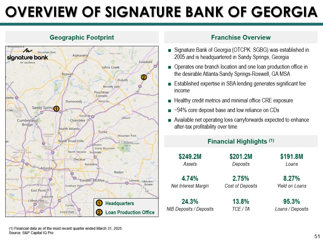 Establishing a presence in the dynamic and high - growth Atlanta - Sandy Springs - Roswell, Georgia MSA Attractive transaction terms drive compelling pro forma financial results Proven expertise in SBA lending generating significant fee income Manageable TBV dilution (2.2 years earnback ) coupled with meaningful capital accretion (TCE / TA improvement of ~35 bps) (1) Ability to scale wealth management and residential mortgage platforms to a wider client base ACQUISITION HIGHLIGHTS 50 Expansion is consistent with First Community’s focus on thoughtful entry into growth markets Augusta, GA Greenville, SC Rock Hill, SC / Charlotte MSA Sandy Springs, GA / Atlanta MSA 2014 2017 2022 2025 (1) Pro forma impact is presented for illustrative purposes only and is subject to change based on final purchase accounting ent ries OVERVIEW OF SIGNATURE BANK OF GEORGIA 51 (1) Financial data as of the most recent quarter ended March 31, 2025 Source: S&P Capital IQ Pro Geographic Footprint Franchise Overview Financial Highlights (1) ■ Signature Bank of Georgia (OTCPK: SGBG) was established in 2005 and is headquartered in Sandy Springs, Georgia ■ Operates one branch location and one loan production office in the desirable Atlanta - Sandy Springs - Roswell, GA MSA ■ Established expertise in SBA lending generates significant fee income ■ Healthy credit metrics and minimal office CRE exposure ■ ~94% core deposit base and low reliance on CDs ■ Available net operating loss carryforwards expected to enhance after - tax profitability over time 1 2 Headquarters Loan Production Office 1 2 $191.8M Loans $201.2M Deposits $249.2M Assets 8.27% Yield on Loans 2.75% Cost of Deposits 4.74% Net Interest Margin 95.3% Loans / Deposits 13.8% TCE / TA 24.3% NIB Deposits / Deposits