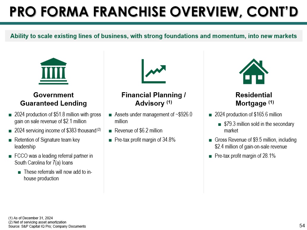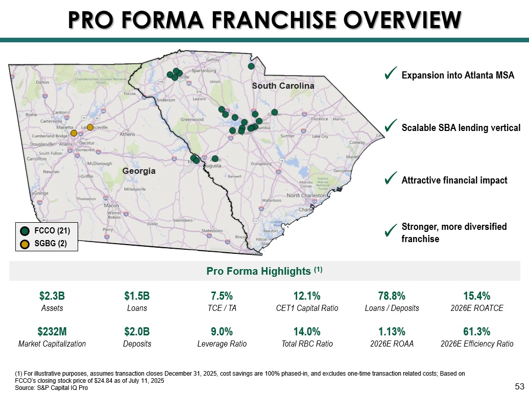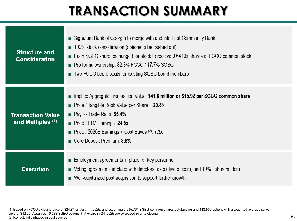 Expansion into Atlanta MSA x Scalable SBA lending vertical x Attractive financial impact x Stronger, more diversified franchise x PRO FORMA FRANCHISE OVERVIEW 53 (1) For illustrative purposes, assumes transaction closes December 31, 2025, cost savings are 100% phased - in, and excludes one - t ime transaction related costs; Based on FCCO’s closing stock price of $24.84 as of July 11, 2025 Source: S&P Capital IQ Pro FCCO (21) SGBG (2) Georgia South Carolina Pro Forma Highlights (1) 15.4% 2026E ROATCE 78.8% Loans / Deposits 12.1% CET1 Capital Ratio 7.5% TCE / TA $1.5B Loans $2.3B Assets 61.3% 2026E Efficiency Ratio 1.13% 2026E ROAA 14.0% Total RBC Ratio 9.0% Leverage Ratio $2.0B Deposits $232M Market Capitalization PRO FORMA FRANCHISE OVERVIEW, CONT’D 54 (1) As of December 31, 2024 (2) Net of servicing asset amortization Source: S&P Capital IQ Pro; Company Documents Ability to scale existing lines of business, with strong foundations and momentum, into new markets Government Guaranteed Lending Financial Planning / Advisory (1) Residential Mortgage (1) ■ 2024 production of $51.8 million with gross gain on sale revenue of $2.1 million ■ 2024 servicing income of $383 thousand (2) ■ Retention of Signature team key leadership ■ FCCO was a leading referral partner in South Carolina for 7(a) loans ■ These referrals will now add to in - house production ■ Assets under management of ~$926.0 million ■ Revenue of $6.2 million ■ Pre - tax profit margin of 34.8% ■ 2024 production of $165.6 million ■ $79.3 million sold in the secondary market ■ Gross Revenue of $9.5 million, including $2.4 million of gain - on - sale revenue ■ Pre - tax profit margin of 28.1% TRANSACTION SUMMARY 55 (1) Based on FCCO’s closing price of $24.84 on July 11, 2025, and assuming 2,585,764 SGBG common shares outstanding and 118,5 00 options with a weighted average strike price of $12.20.