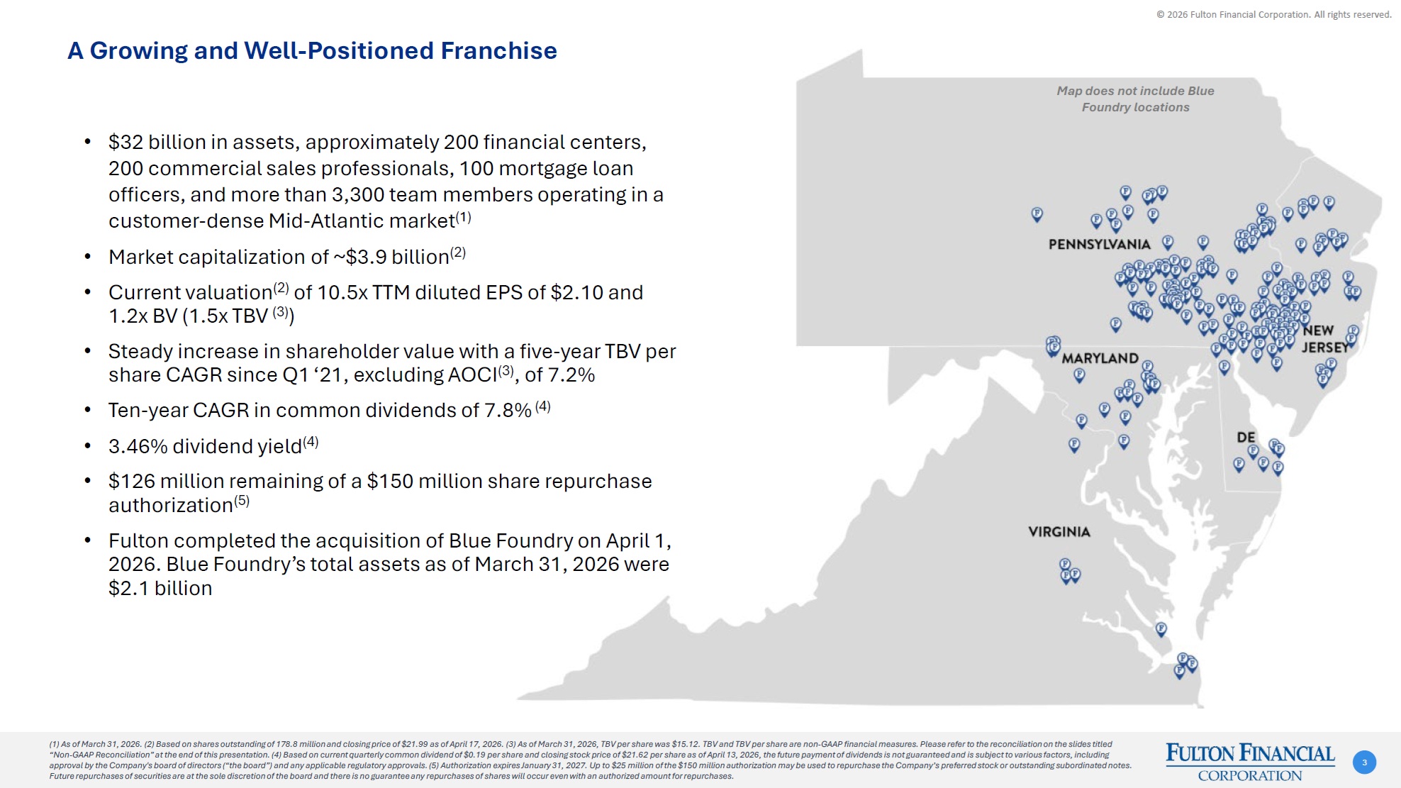 © 2026 Fulton Financial Corporation. All rights reserved. Forward Looking Statements & Non-GAAP Disclaimers As used in this presentation, the terms “Fulton", "the Company", "registrant", "we", "us", and "our" mean Fulton Financial Corporation and its subsidiaries, on a consolidated basis, unless the context indicates otherwise. This presentation contains estimates, predictions, opinions, projections and other "forward-looking statements" as that phrase is defined in the Private Securities Litigation Reform Act of 1995. Such statements include, without limitation, references to the Company’s predictions or expectations of future business or financial performance as well as its goals and objectives for future operations, financial and business trends, business prospects, and management's outlook or expectations for earnings, revenues, expenses, capital levels, liquidity levels, asset quality or other future financial or business performance, strategies, federal reserve projected actions, or expectations. The words “believe,” “expect,” “anticipate,” “plan,” “estimate,” “target,” “project” and similar expression or the negative version of such expressions, among others, generally identify forward-looking statements. Such forward-looking statements are based on various assumptions (some of which may be beyond the Company's control) and are subject to significant risks and uncertainties (which change over time) and other factors, including, but not limited to, volatile market conditions and uncertain economic trends in the United States generally and in financial markets, particularly in the markets in which the Company operates and in which its loans are concentrated, including potential recessionary and other unfavorable conditions and trends related to housing markets, costs of living, unemployment levels, trade, monetary and fiscal policies, interest rates, supply chain issues, inflation, economic growth, the uncertain effects of geopolitical instability, armed conflicts, public health crises, inflation, interest rates and actions taken in response thereto on our business, results of operations, capital and liquidity, the possibility that revenue or expense synergies and other expected benefits of the Company's acquisition ("the Transaction") of Blue Foundry Bancorp ("Blue Foundry"), including anticipated cost savings and strategic gains, are not realized when expected or at all, including as a result of the impact of, or challenges arising from, the integration of Blue Foundry into the Company or as a result of the strength of the economy, competitive factors in the areas where the Company and Blue Foundry do business, or as a result of other unexpected factors or events; reputational risks and potential adverse reactions or changes to business or employee relationships, including those resulting from the completion of the Transaction; diversion of management’s attention and time from ongoing business operations and other opportunities on matters relating to the Transaction; unanticipated challenges or delays in the integration of Blue Foundry’s business into the Company's business and/or the conversion of Blue Foundry’s operating systems and customer data onto the Company’s, which could cause actual results to differ materially from those currently anticipated. Such risks and uncertainties are discussed in detail in the Company’s Form 10-K for the year ended December 31, 2025 and other documents filed by the Company with the Securities and Exchange Commission (“SEC”) from time to time. We caution readers not to place undue reliance on any such forward-looking statements, which speak only as of the date on which they are made, and the Company disclaims any duty to revise or update any forward-looking statement, whether written or oral, that may be made from time to time by or on behalf of the Company for any reason, except as specifically required by law. 2 Forward Looking Statements: This presentation contains financial measures determined by methods other than in accordance with accounting principles generally accepted in the United States (“GAAP”). The Company’s management believes that these non-GAAP financial measures provide a greater understanding of ongoing operations, enhance comparability of results of operations with prior periods and show the effects of significant gains and charges in the periods presented. The Company’s management believes these non-GAAP financial measures are useful measures for management and investors to analyze the Company’s financial performance without the impact of unusual items or events that may obscure trends in the Company’s underlying performance. You should not rely on these non-GAAP financial measures as a substitute for, or as superior to, GAAP results. Non-GAAP financial measures have inherent limitations, are not uniformly applied and are not audited. Because non-GAAP financial measures are not standardized, it may not be possible to compare these financial measures with other companies’ non-GAAP financial measures having the same or similar names. For a reconciliation of these non-GAAP financial measures to their most directly comparable GAAP measures, see the Appendix. Non-GAAP Financial Measures: This presentation has been prepared by the Company solely for informational purposes and information contained herein constitutes confidential information and is provided to you on the condition that you will hold it in strict confidence and not reproduce, disclose, forward or distribute it to any third party in whole or in part without the prior written consent of the Company. This presentation is not an offer to sell securities and the Company is not soliciting an offer to buy securities in any jurisdiction where such offer or sale is not permitted. Neither the SEC, Federal Deposit Insurance Corporation, nor any state securities commission has approved or disapproved of the securities