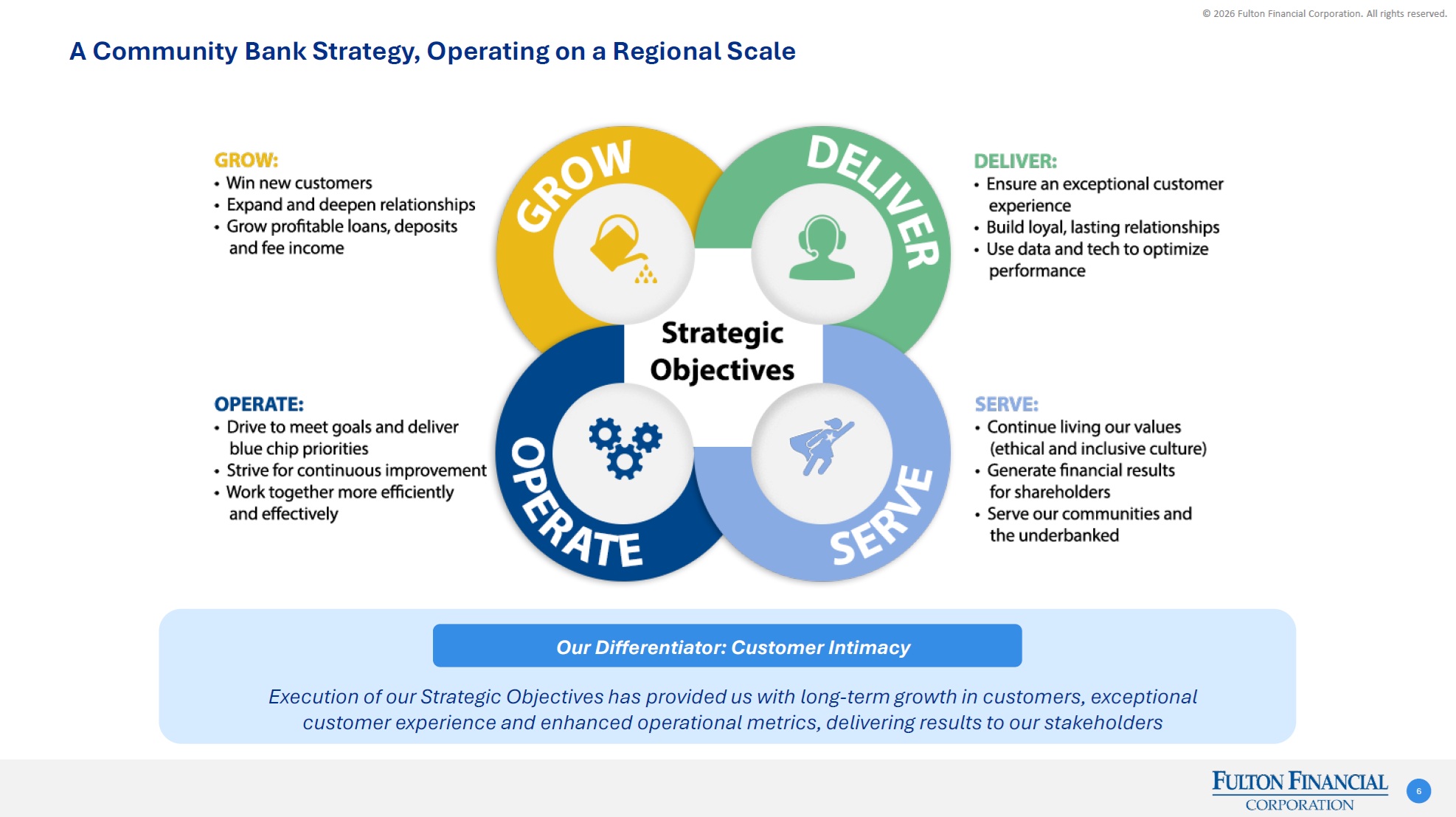 © 2026 Fulton Financial Corporation. All rights reserved. Robust and Scalable Product Suite 5 Commercial Banking Consumer Banking Business Banking TreasuryManagement Wealth andTrust InternationalServices CapitalMarkets MortgageBanking •Significant technology spend over the past six years •Focus on digital enablement as a driver of growth, efficiency and service Well positioned to compete in and serve our market ROBUSTPRODUCTS AND SERVICES INDUSTRY-LEADINGTECHNOLOGYPLATFORMS NIMBLECOMPETITIVEPOSITION