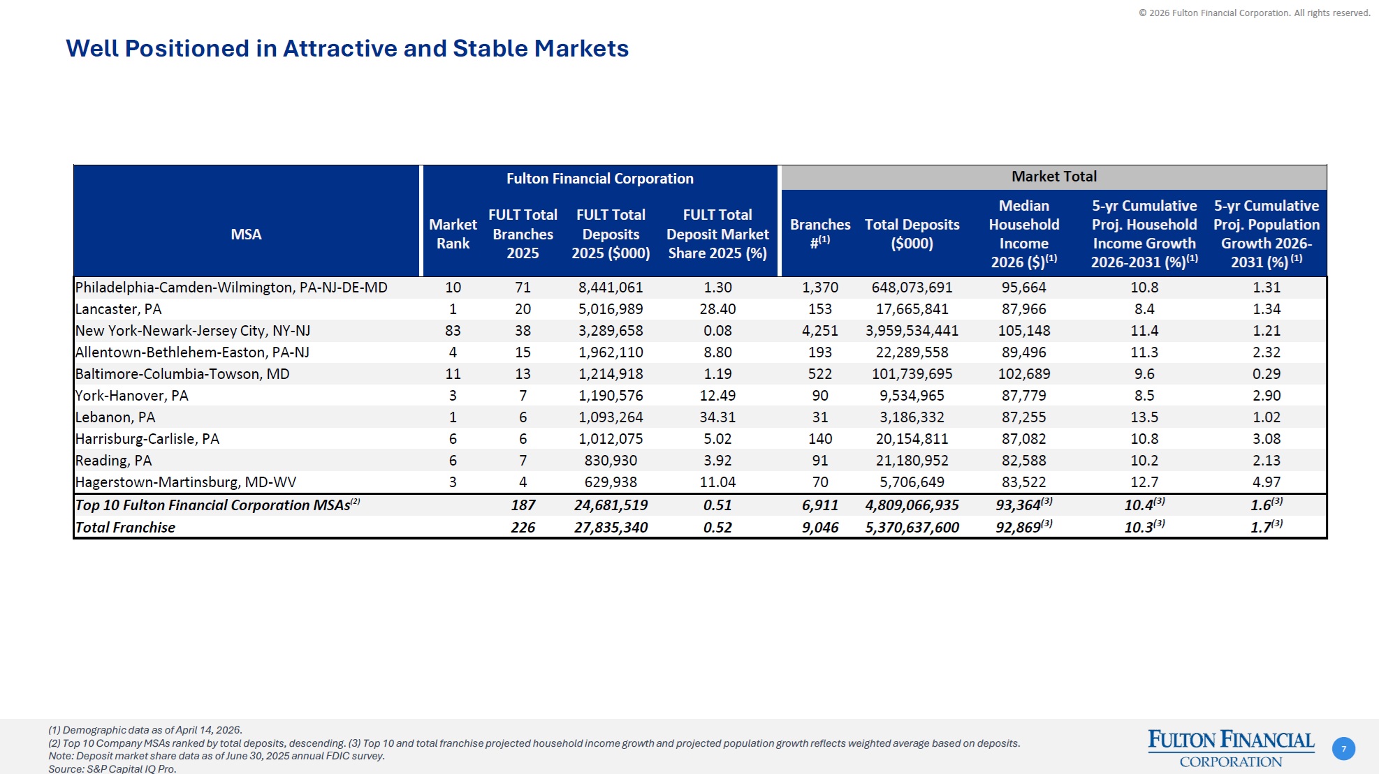 © 2026 Fulton Financial Corporation. All rights reserved. A Community Bank Strategy, Operating on a Regional Scale 6 Execution of our Strategic Objectives has provided us with long-term growth in customers, exceptional customer experience and enhanced operational metrics, delivering results to our stakeholders Our Differentiator: Customer Intimacy