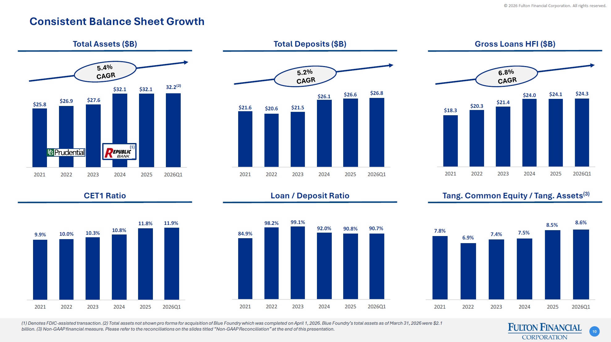 © 2026 Fulton Financial Corporation. All rights reserved. 1Q264Q251Q264Q25Net Income Available to Common Shareholders (dollars in millions)$92.2$96.4$99.7$99.4ROAA (annualized)1.20%1.23%1.30%1.27%ROATCE (annualized)----14.76%14.86%Efficiency Ratio ----56.7%60.0%Non-Interest Expense / Total Average Assets (annualized)2.54%2.64%2.42%2.53%Diluted EPS$0.51$0.53$0.55$0.55Operating PPNR ----$141.0$131.8Operating PPNR / Average Assets ----1.79%1.64%GAAP ReportedOperating(1) First Quarter 2026 Financial Highlights 9 Focus: •Strong Balance Sheet and Liquidity •Benefits Realization from Strategic Initiatives •Ongoing Commitment to Organizational Efficiency Productivity: •Disciplined and Profitable Growth •Solid Operating Profitability Metrics •Operating Net Income Available to Common Shareholders(1) of $99.7 million or $0.55 per Diluted Share (1) (1) All operating figures represent Non-GAAP financial data. Please refer to the reconciliations on the slides titled “Non-GAAP Reconciliation” at the end of this presentation. Note: Dashes represent Non-GAAP data that is not applicable to the GAAP Reported table.