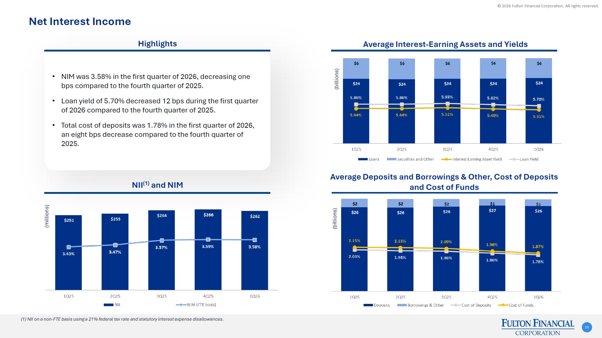 © 2026 Fulton Financial Corporation. All rights reserved. 9.9%10.0%10.3%10.8%11.8%11.9%202120222023202420252026Q184.9%98.2%99.1%92.0%90.8%90.7%202120222023202420252026Q17.8%6.9%7.4%7.5%8.5%8.6%202120222023202420252026Q1 Consistent Balance Sheet Growth 10 Total Assets ($B) Total Deposits ($B) Gross Loans HFI ($B)$25.8$26.9$27.6$32.1$32.132.2(2)202120222023202420252026Q1 CET1 Ratio$21.6 $20.6 $21.5 $26.1 $26.6 $26.8 202120222023202420252026Q1$18.3 $20.3 $21.4 $24.0 $24.1 $24.3 202120222023202420252026Q1 Loan / Deposit Ratio Tang. Common Equity / Tang. Assets(3) (1) (1) Denotes FDIC-assisted transaction. (2) Total assets not shown pro forma for acquisition of Blue Foundry which was completed on April 1, 2026. Blue Foundry’s total assets as of March 31, 2026 were $2.1 billion. (3) Non-GAAP financial measure. Please refer to the reconciliations on the slides titled “Non-GAAP Reconciliation” at the end of this presentation.
