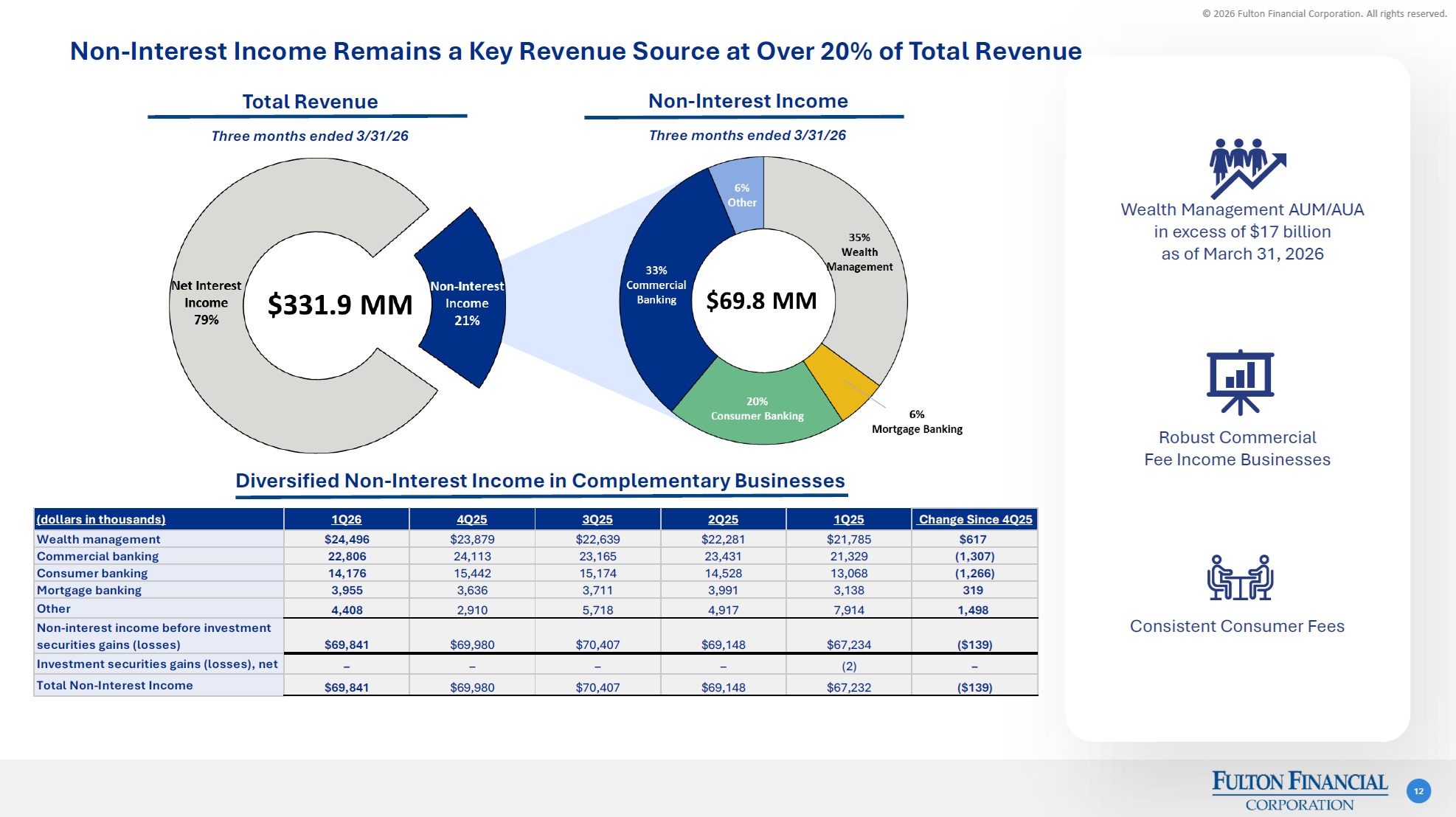 © 2026 Fulton Financial Corporation. All rights reserved. Net Interest Income 11 •NIM was 3.58% in the first quarter of 2026, decreasing one bps compared to the fourth quarter of 2025. •Loan yield of 5.70% decreased 12 bps during the first quarter of 2026 compared to the fourth quarter of 2025. •Total cost of deposits was 1.78% in the first quarter of 2026, an eight bps decrease compared to the fourth quarter of 2025. Average Interest-Earning Assets and Yields Highlights Average Deposits and Borrowings & Other, Cost of Deposits and Cost of Funds NII(1) and NIM (millions) (billions) (billions) (1) NII on a non-FTE basis using a 21% federal tax rate and statutory interest expense disallowances.
