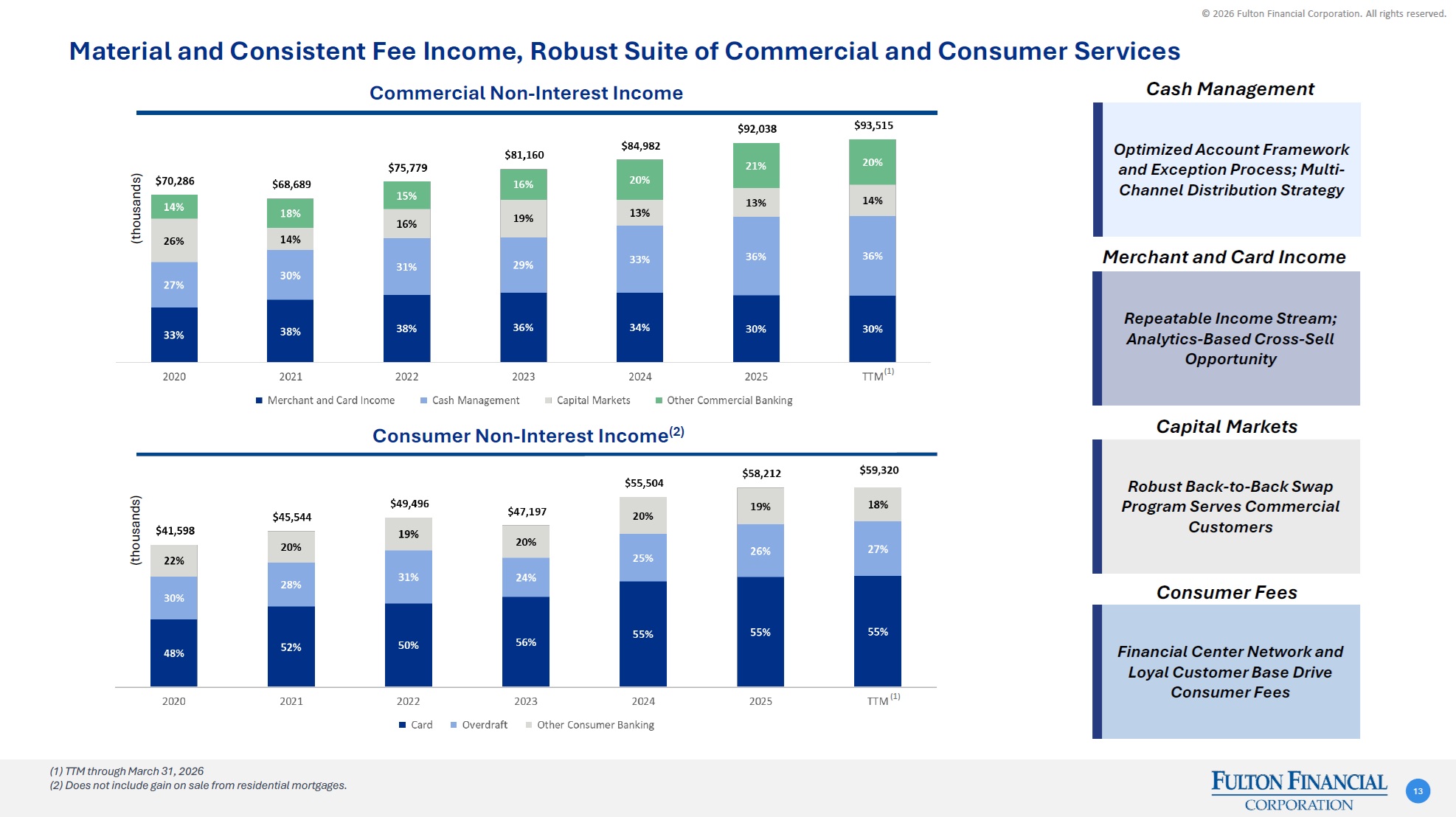 © 2026 Fulton Financial Corporation. All rights reserved. Non-Interest Income Remains a Key Revenue Source at Over 20% of Total Revenue 12 Wealth Management AUM/AUA in excess of $17 billion as of March 31, 2026 Robust Commercial Fee Income Businesses Consistent Consumer Fees Three months ended 3/31/26 Three months ended 3/31/26 Total Revenue Non-Interest Income Diversified Non-Interest Income in Complementary Businesses Wealth management$24,496$23,879$22,639$22,281$21,785$617Commercial banking22,80624,11323,16523,43121,329(1,307)Consumer banking14,17615,44215,17414,52813,068(1,266)Mortgage banking3,9553,6363,7113,9913,138319Other4,4082,9105,7184,9177,9141,498Non-interest income before investment securities gains (losses)$69,841$69,980$70,407$69,148$67,234($139)Investment securities gains (losses), net––––(2)–Total Non-Interest Income$69,841$69,980$70,407$69,148$67,232($139) Change Since 4Q251Q26(dollars in thousands)4Q253Q252Q251Q25