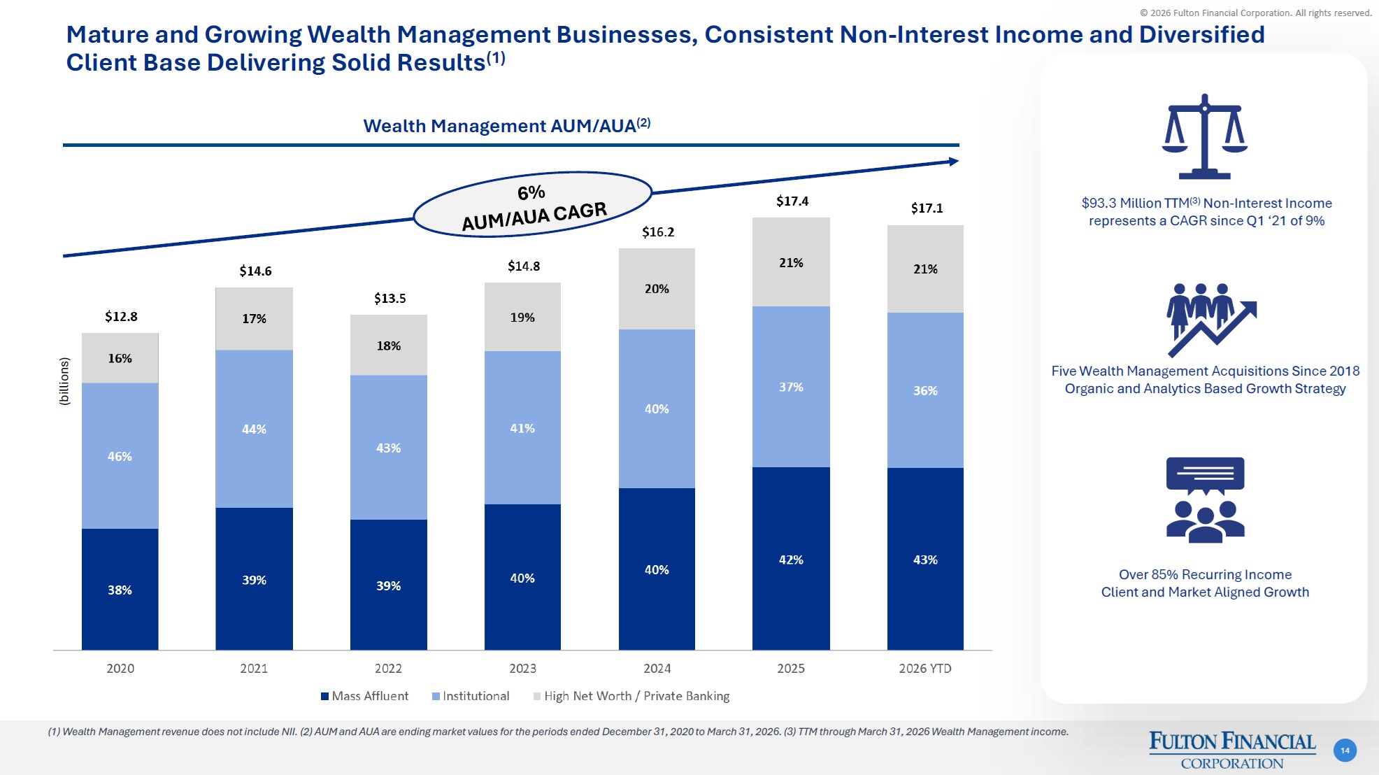 © 2026 Fulton Financial Corporation. All rights reserved. Material and Consistent Fee Income, Robust Suite of Commercial and Consumer Services 13 Repeatable Income Stream; Analytics-Based Cross-Sell Opportunity Optimized Account Framework and Exception Process; Multi-Channel Distribution Strategy Robust Back-to-Back Swap Program Serves Commercial Customers Financial Center Network and Loyal Customer Base Drive Consumer Fees Merchant and Card Income Cash Management Capital Markets Consumer Fees Commercial Non-Interest Income Consumer Non-Interest Income(2) (thousands) (thousands) (1) (1) (1) TTM through March 31, 2026 (2) Does not include gain on sale from residential mortgages.