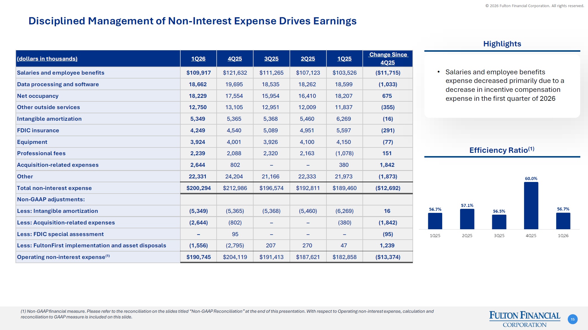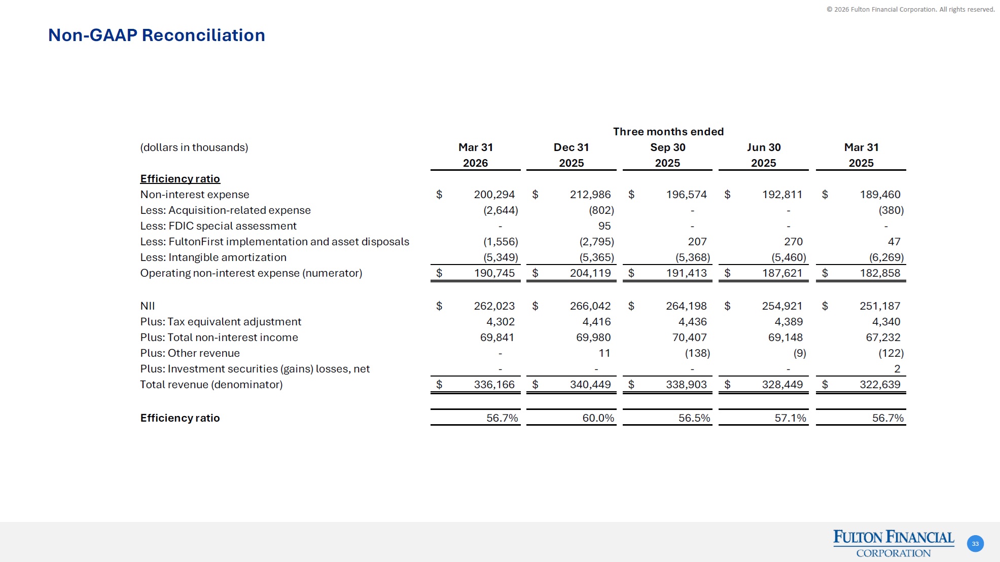 © 2026 Fulton Financial Corporation. All rights reserved. Three months ended(dollars in thousands)Mar 31Dec 31Sep 30Jun 30Mar 3120262025202520252025Efficiency ratioNon-interest expense200,294$ 212,986$ 196,574$ 192,811$ 189,460$ Less: Acquisition-related expense(2,644) (802) - - (380) Less: FDIC special assessment- 95 - - - Less: FultonFirst implementation and asset disposals(1,556) (2,795) 207 270 47 Less: Intangible amortization(5,349) (5,365) (5,368) (5,460) (6,269) Operating non-interest expense (numerator)190,745$ 204,119$ 191,413$ 187,621$ 182,858$ NII262,023$ 266,042$ 264,198$ 254,921$ 251,187$ Plus: Tax equivalent adjustment4,302 4,416 4,436 4,389 4,340 Plus: Total non-interest income69,841 69,980 70,407 69,148 67,232 Plus: Other revenue- 11 (138) (9) (122) Plus: Investment securities (gains) losses, net- - - - 2 Total revenue (denominator)336,166$ 340,449$ 338,903$ 328,449$ 322,639$ Efficiency ratio56.7%60.0%56.5%57.1%56.7% Non-GAAP Reconciliation 33