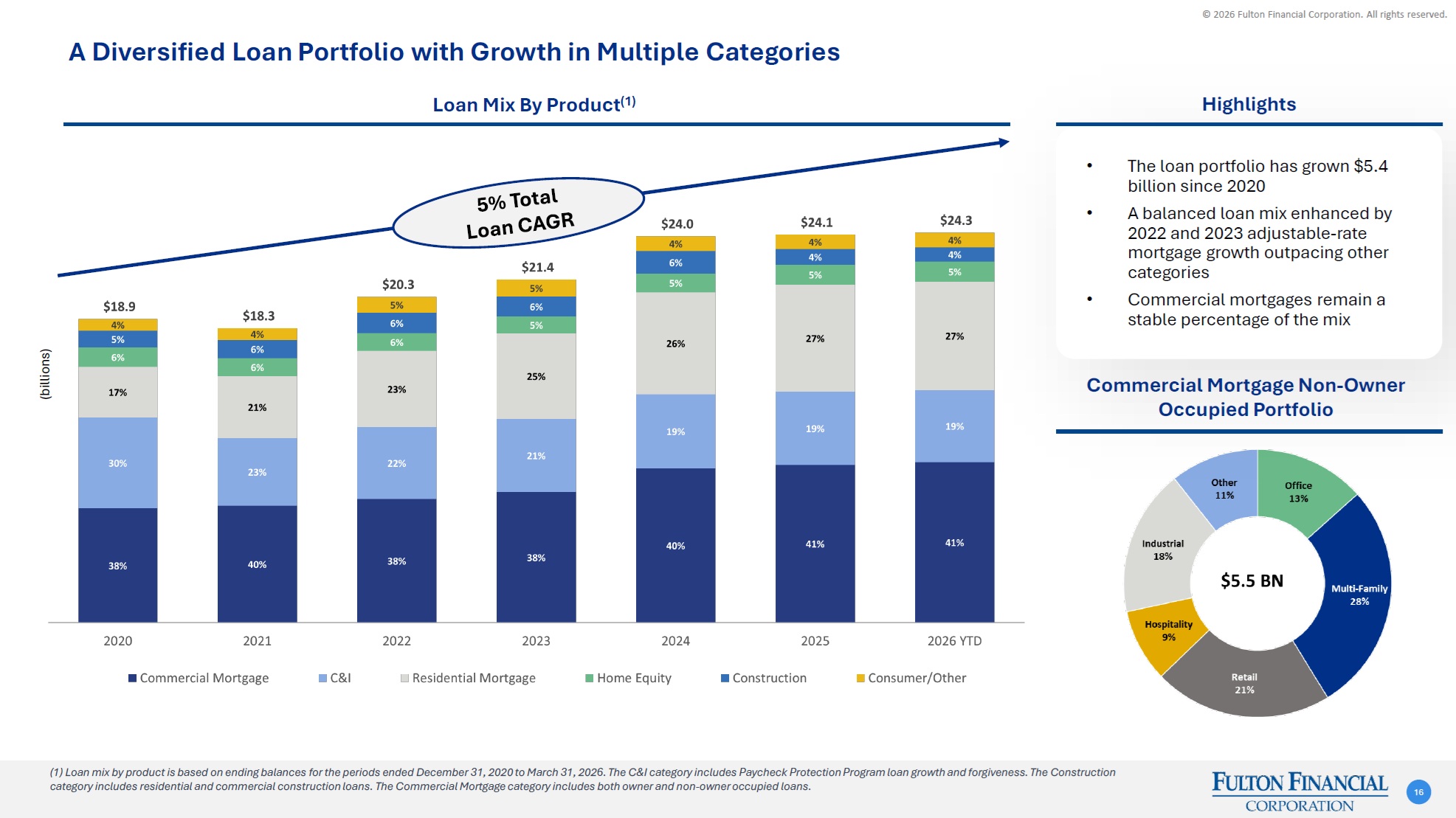 © 2026 Fulton Financial Corporation. All rights reserved. A Diversified Loan Portfolio with Growth in Multiple Categories 16 Loan Mix By Product(1) Highlights • The loan portfolio has grown $5.4 billion since 2020 •A balanced loan mix enhanced by 2022 and 2023 adjustable-rate mortgage growth outpacing other categories •Commercial mortgages remain a stable percentage of the mix Commercial Mortgage Non-Owner Occupied Portfolio 16 (billions) (1) Loan mix by product is based on ending balances for the periods ended December 31, 2020 to March 31, 2026. The C&I category includes Paycheck Protection Program loan growth and forgiveness. The Construction category includes residential and commercial construction loans. The Commercial Mortgage category includes both owner and non-owner occupied loans.