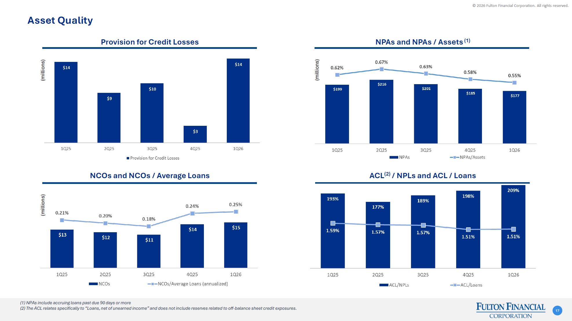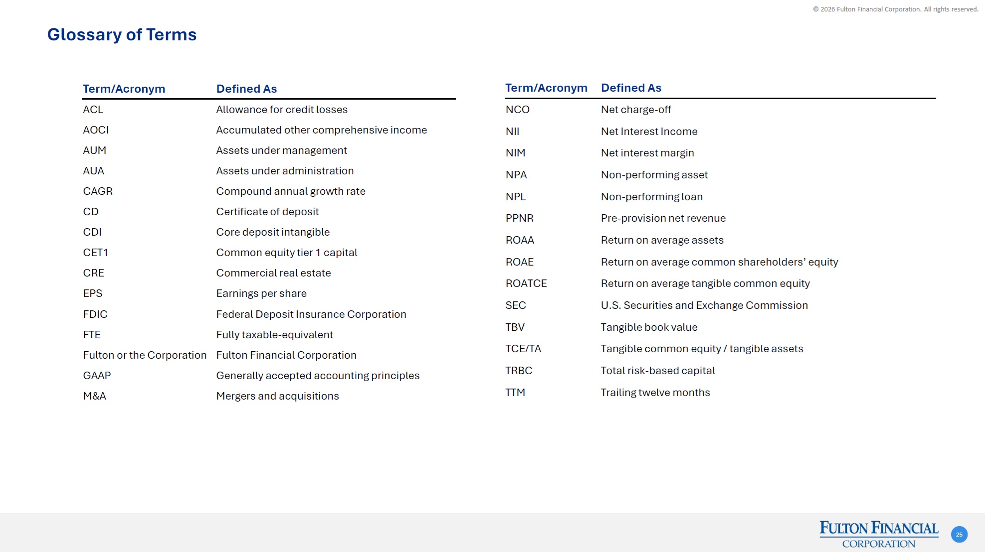 © 2026 Fulton Financial Corporation. All rights reserved. Glossary of Terms 25 Term/Acronym Defined As ACL Allowance for credit losses AOCI Accumulated other comprehensive income AUM Assets under management AUA Assets under administration CAGR Compound annual growth rate CD Certificate of deposit CDI Core deposit intangible CET1 Common equity tier 1 capital CRE Commercial real estate EPS Earnings per share FDIC Federal Deposit Insurance Corporation FTE Fully taxable-equivalent Fulton or the Corporation Fulton Financial Corporation GAAP Generally accepted accounting principles M&A Mergers and acquisitions Term/Acronym Defined As NCO Net charge-off NII Net Interest Income NIM Net interest margin NPA Non-performing asset NPL Non-performing loan PPNR Pre-provision net revenue ROAA Return on average assets ROAE Return on average common shareholders’ equity ROATCE Return on average tangible common equity SEC U.S. Securities and Exchange Commission TBV Tangible book value TCE/TA Tangible common equity / tangible assets TRBC Total risk-based capital TTM Trailing twelve months