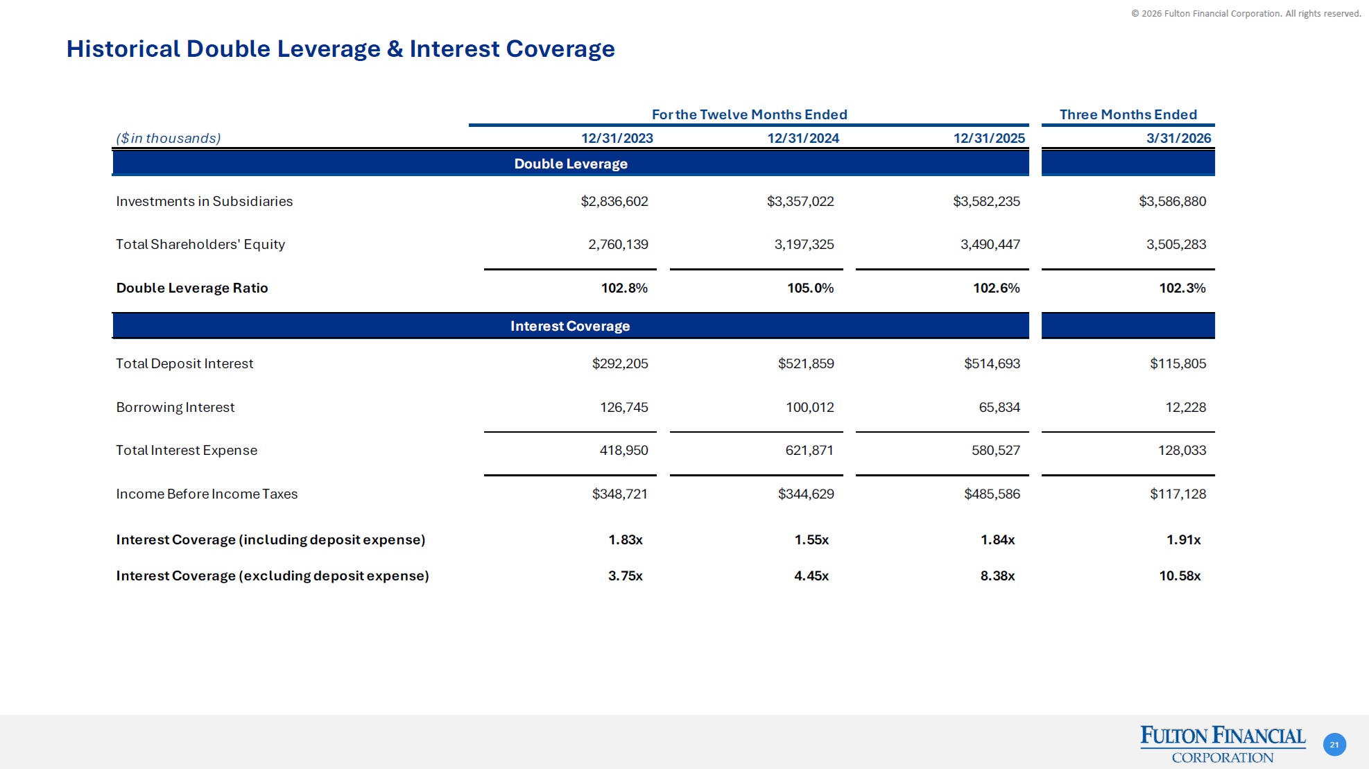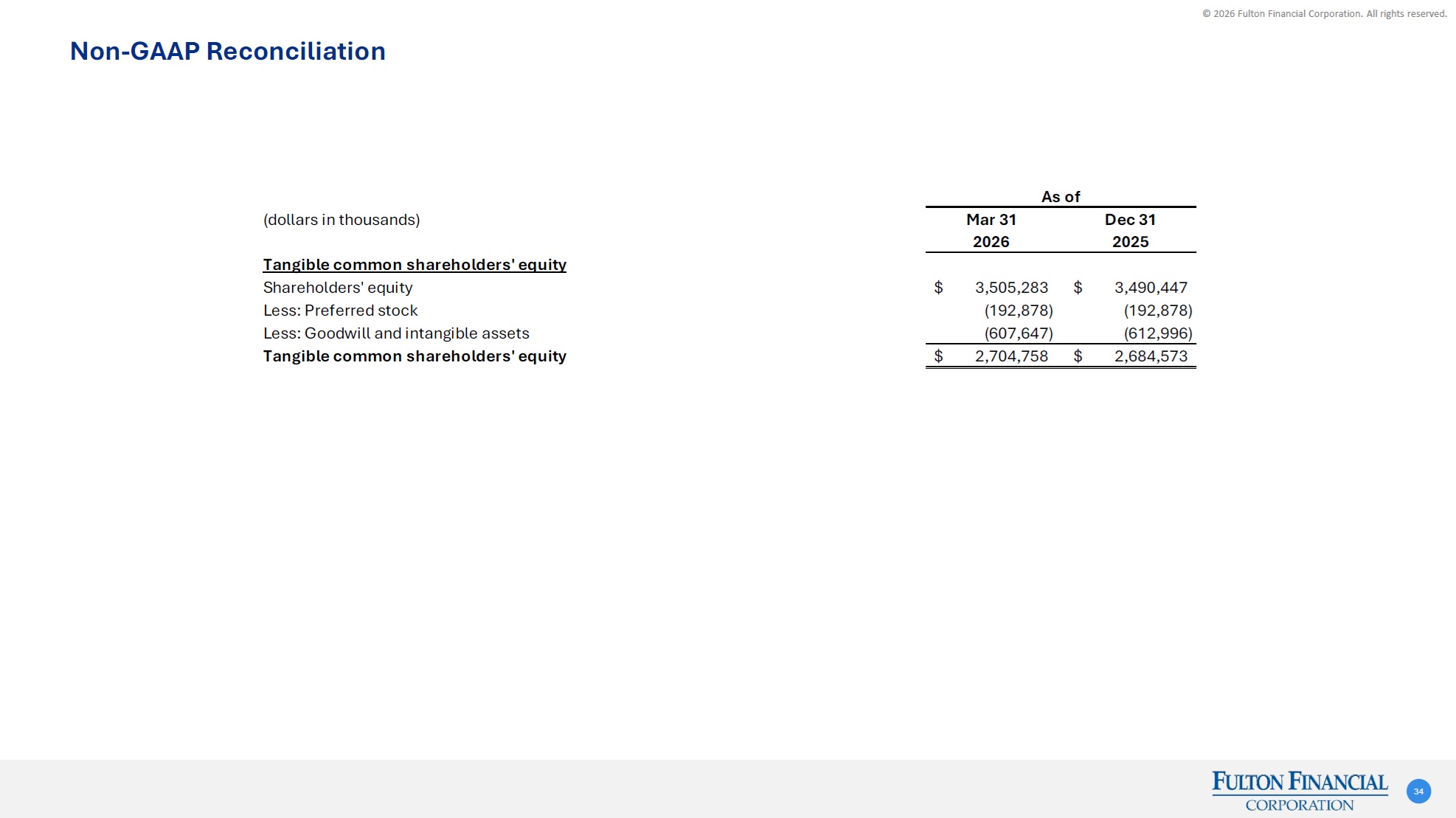 © 2026 Fulton Financial Corporation. All rights reserved. (dollars in thousands)Mar 31Dec 31Dec 31Dec 31Dec 31Dec 31202620252024202320222021Tangible Common Shareholders' EquityShareholders equity3,505,283$ 3,490,447$ 3,197,325$ 2,760,139$ 2,579,757$ 2,712,680$ Less: Preferred Stock(192,878)(192,878)(192,878)(192,878)(192,878)(192,878)Less: Goodwill and intangible assets(607,647)(612,996)(635,458)(560,687)(560,824)(538,053)Tangible Common Shareholders' Equity2,704,758$ 2,684,573$ 2,368,989$ 2,006,574$ 1,826,055$ 1,981,749$ Tangible AssetsTotal Assets32,237,438$ 32,118,400$ 32,071,810$ 27,571,915$ 26,931,702$ 25,796,398$ Less: Goodwill and intangible assets(607,647)(612,996)(635,458)(560,687)(560,824)(538,053)Tangible Assets31,629,791$ 31,505,404$ 31,436,352$ 27,011,228$ 26,370,878$ 25,258,345$ Tangible Common Equity / Tangible Assets8.6%8.5%7.5%7.4%6.9%7.8% Non-GAAP Reconciliation 28