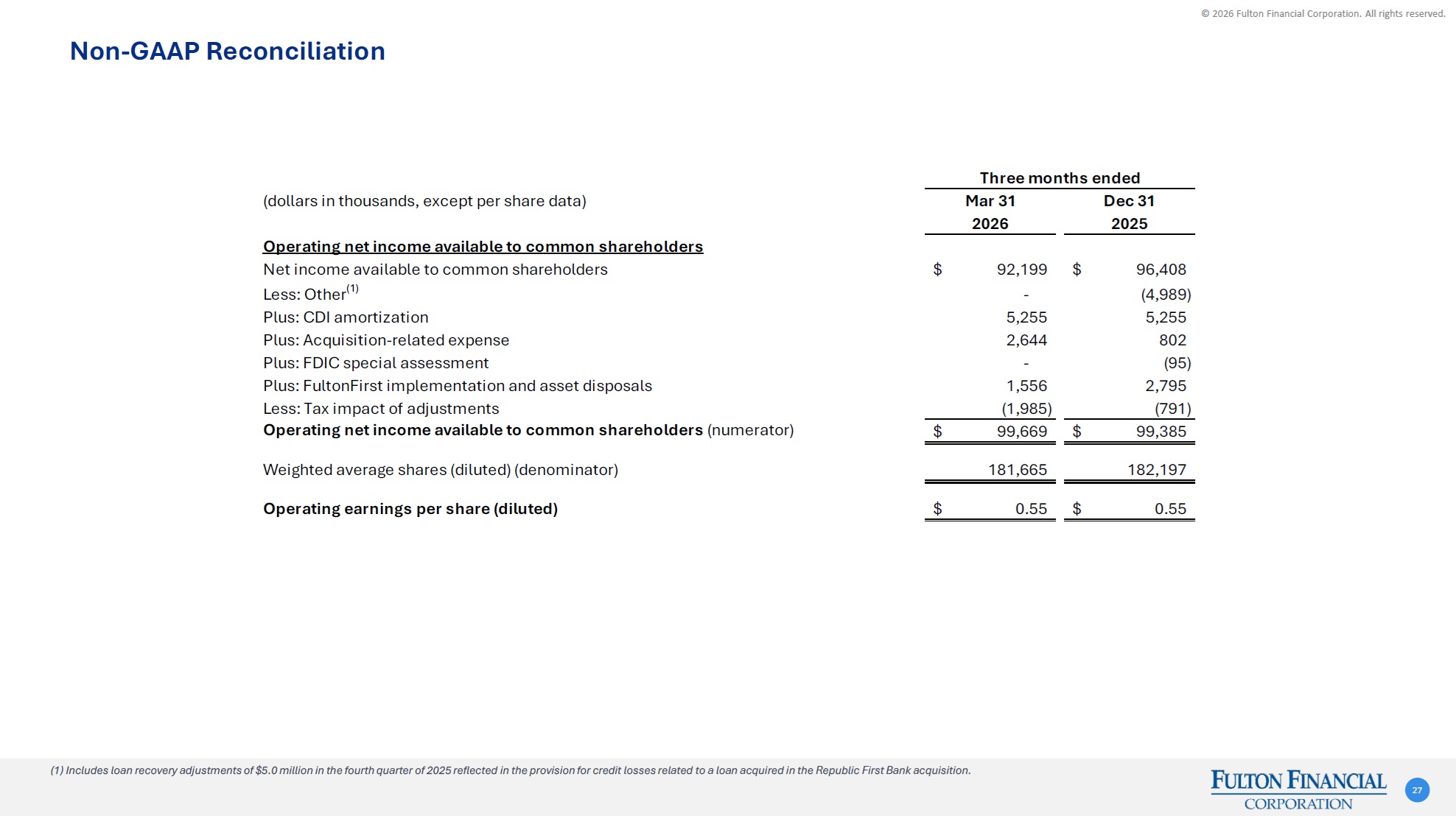 © 2026 Fulton Financial Corporation. All rights reserved. Three months ended(dollars in thousands)Mar 31Dec 3120262025Operating ROATCE(1)Net income available to common shareholders92,199$ 96,408$ Less: Other(2)- (4,989) Plus: Intangible amortization5,349 5,365 Plus: Acquisition-related expense2,644 802 Plus: FDIC special assessment- (95) Plus: FultonFirst implementation and asset disposals1,556 2,795 Less: Tax impact of adjustments(2,005) (814) Adjusted net income available to common shareholders (numerator)99,743$ 99,472$ Average shareholders' equity3,543,911$ 3,464,539$ Less: Average preferred stock(192,878) (192,878) Less: Average goodwill and intangible assets(610,262) (615,600) Average tangible common shareholders' equity (denominator)2,740,771$ 2,656,061$ Operating ROATCE14.76%14.86% Non-GAAP Reconciliation 30 (1) Annualized. (2) Includes loan recovery adjustments of approximately $5.0 million in the fourth quarter of 2025 reflected in the provision for credit losses related to a loan acquired in the Republic First Bank acquisition.