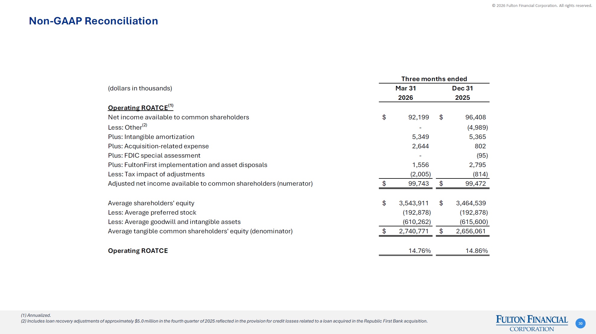 © 2026 Fulton Financial Corporation. All rights reserved. Three months ended(dollars in thousands)Mar 31Dec 3120262025Operating ROAA(1)Net income94,761$ 98,970$ Less: Other(2)- (4,989) Plus: CDI amortization5,255 5,255 Plus: Acquisition-related expense2,644 802 Plus: FDIC special assessment- (95) Plus: FultonFirst implementation and asset disposals1,556 2,795 Less: Tax impact of adjustments(1,985) (791) Operating net income (numerator)102,231$ 101,947$ Total average assets31,999,228$ 32,013,163$ Less: Average net CDI(54,629) (60,726) Total operating average assets (denominator)31,944,599$ 31,952,437$ Operating ROAA1.30%1.27% Non-GAAP Reconciliation 29 (1) Annualized. (2) Includes loan recovery adjustments of approximately $5.0 million in the fourth quarter of 2025 reflected in the provision for credit losses related to a loan acquired in the Republic First Bank acquisition.