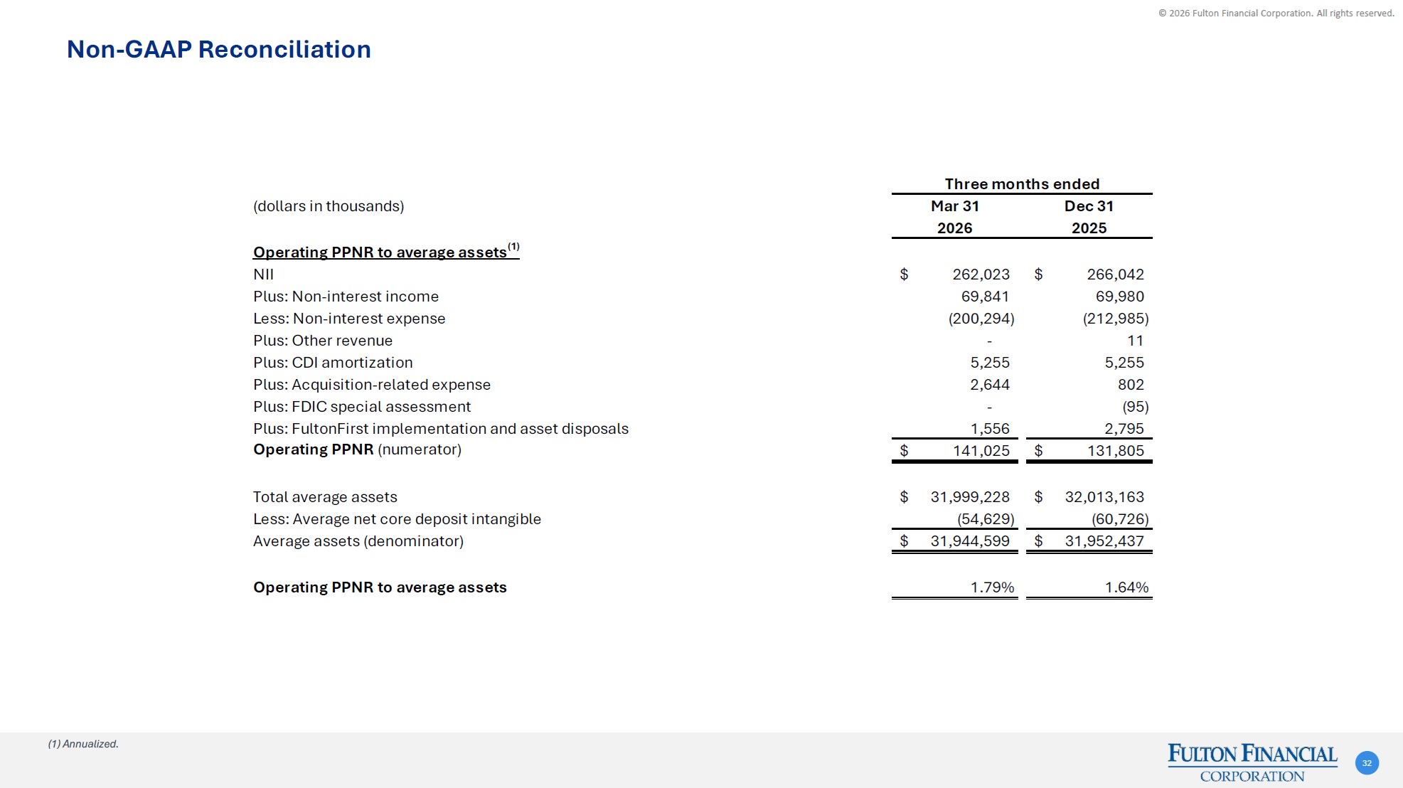 © 2026 Fulton Financial Corporation. All rights reserved. Three months ended(dollars in thousands)Mar 31Dec 3120262025Operating non-interest expense to total average assets(1)Non-interest expense200,294$ 212,986$ Less: Intangible amortization(5,349) (5,365) Less: Acquisition-related expense(2,644) (802) Less: FDIC special assessment- 95 Less: FultonFirst implementation and asset disposals(1,556) (2,795) Operating non-interest expense (numerator)190,745$ 204,119$ Total average assets (denominator)31,999,228$ 32,013,163$ Operating non-interest expense to total average assets2.42%2.53% Non-GAAP Reconciliation 31 (1) Annualized.