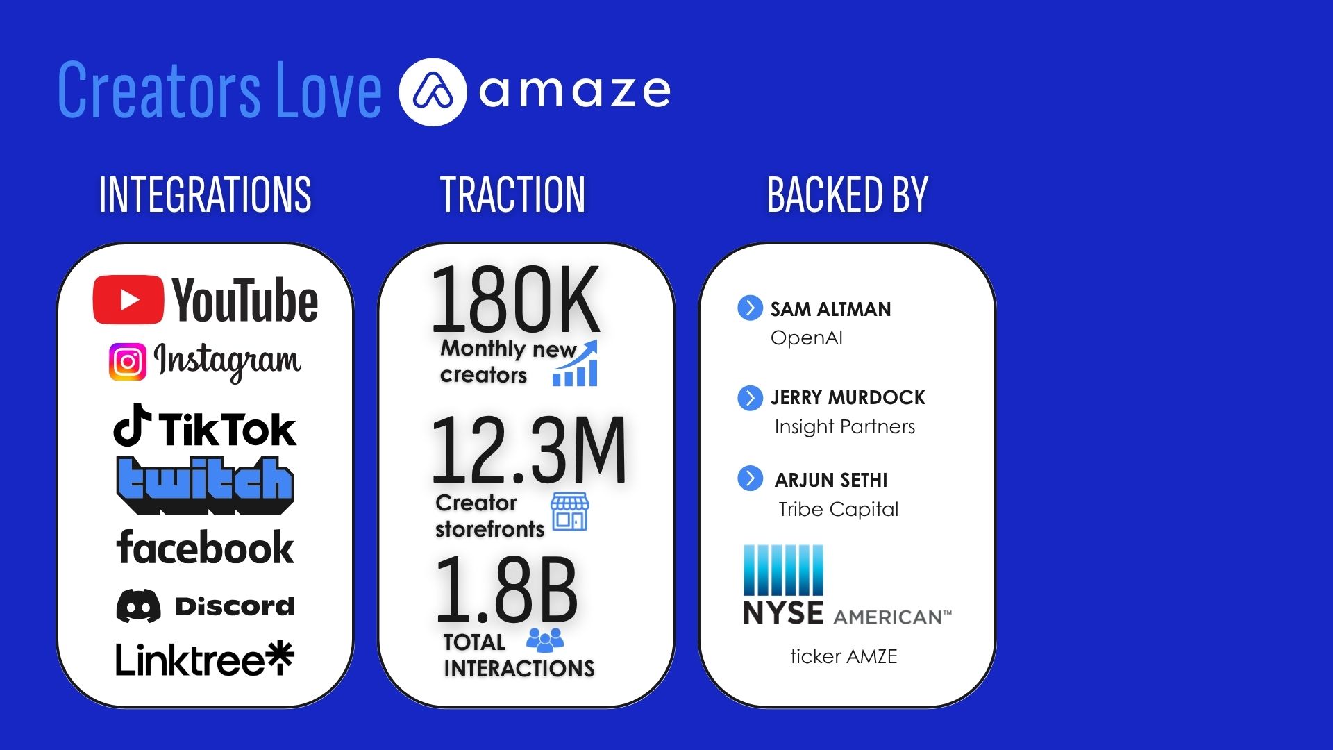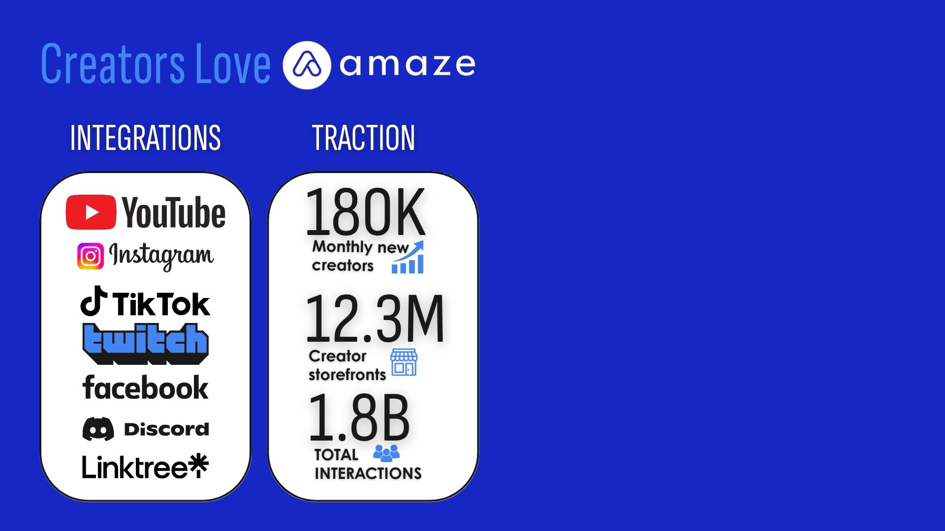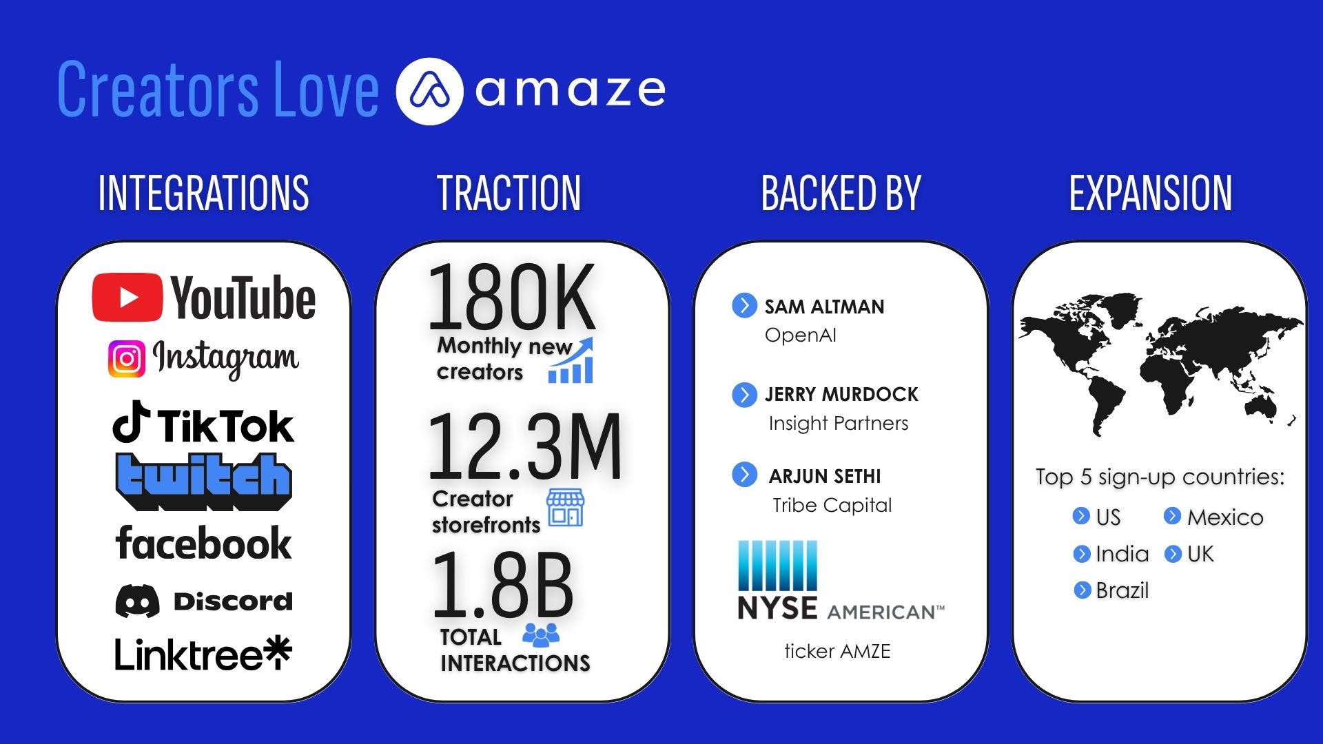 With the creator economy projected to reach $480 billion by 2027, Amaze is scaling to meet global demand. Its platform simplifies the process for creators to launch products, monetize their content, and grow their businesses — all while integrating directly with the social platforms where creators already engage their audiences.
