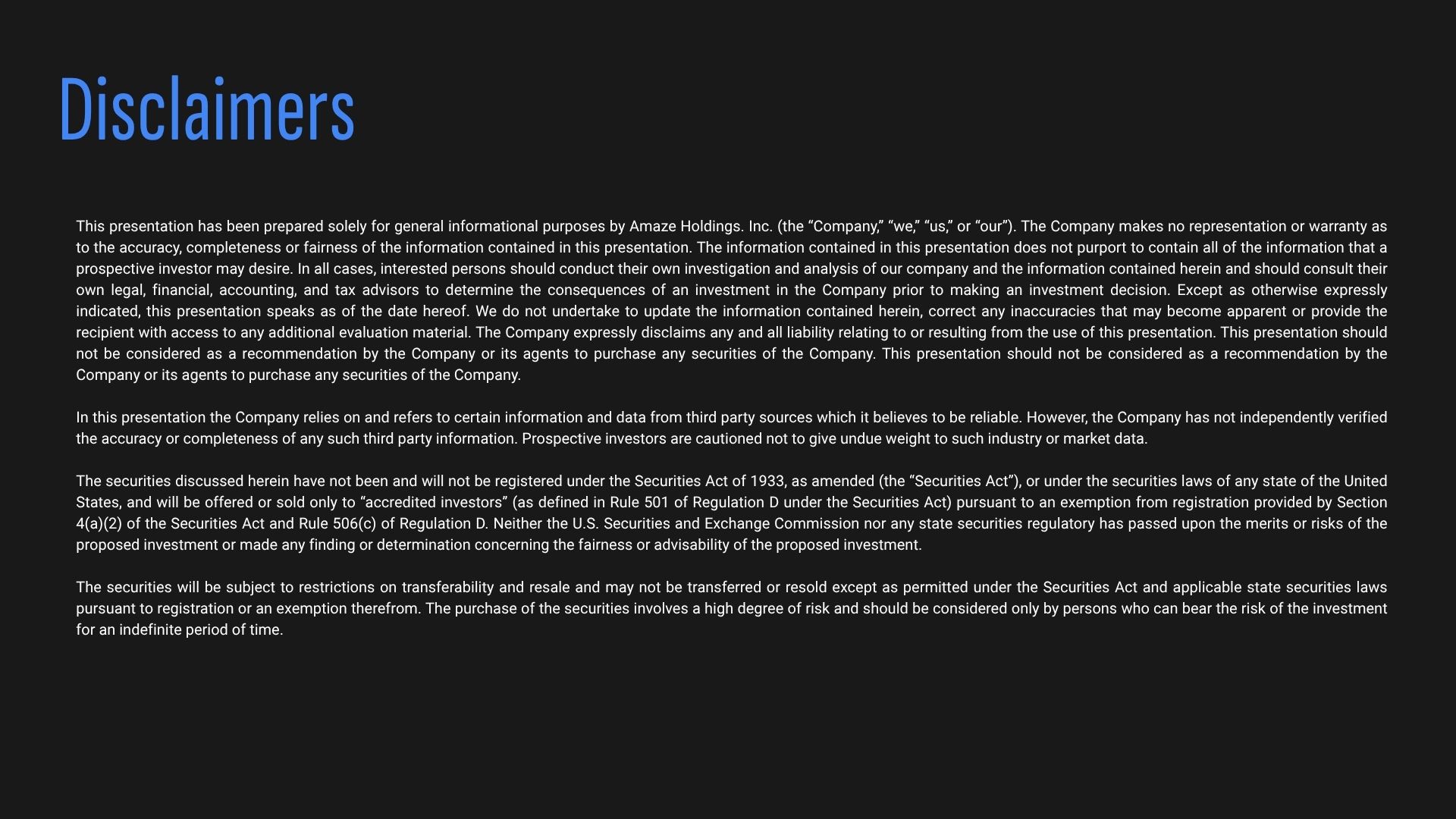 The first event will take place virtually on Thursday, June 5, 2025, at 9:00 a.m. PDT. To register for the webinar, please visit Amaze.co/invest. The webinar series will continue every Tuesday and Thursday throughout June, with the exception of the Juneteenth market holiday.