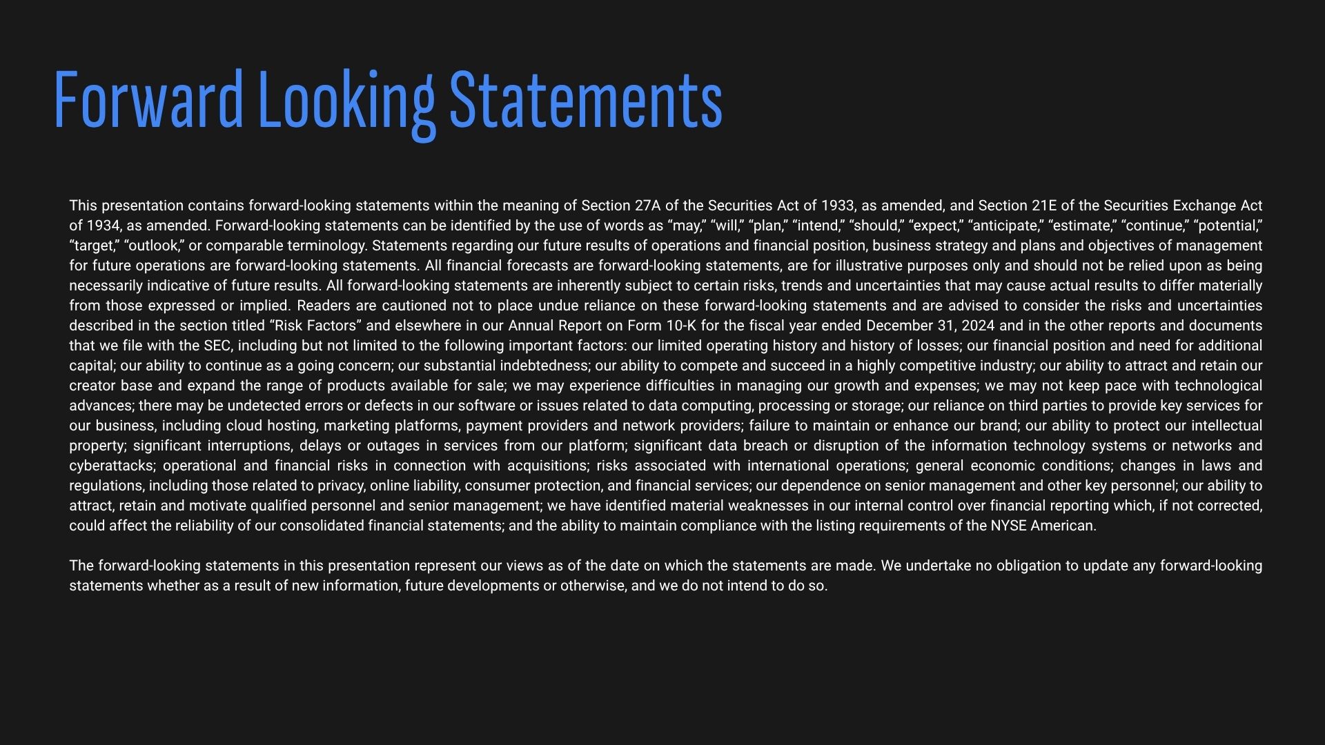 These statements are subject to known and unknown risks, uncertainties and assumptions that could cause actual results to differ materially from those projected or otherwise implied by the forward-looking statement. These risks include: our ability to execute our plans and strategies; our limited operating history and history of losses; our financial position and need for additional capital; our ability to attract and retain our creator base and expand the range of products available for sale; we may experience difficulties in managing our growth and expenses; we may not keep pace with technological advances; there may be undetected errors or defects in our software or issues related to data computing, processing or storage; our reliance on third parties to provide key services for our business, including cloud hosting, marketing platforms, payment providers and network providers; failure to maintain or enhance our brand; our ability to protect our intellectual property; significant interruptions, delays or outages in services from our platform; significant data breach or disruption of the information technology systems or networks and cyberattacks; risks associated with international operations; general economic and competitive factors affecting our business generally; changes in laws and regulations, including those related to privacy, online liability, consumer protection, and financial services; our dependence on senior management and other key personnel; and our ability to attract, retain and motivate qualified personnel and senior management.