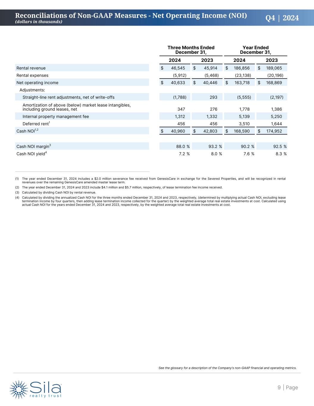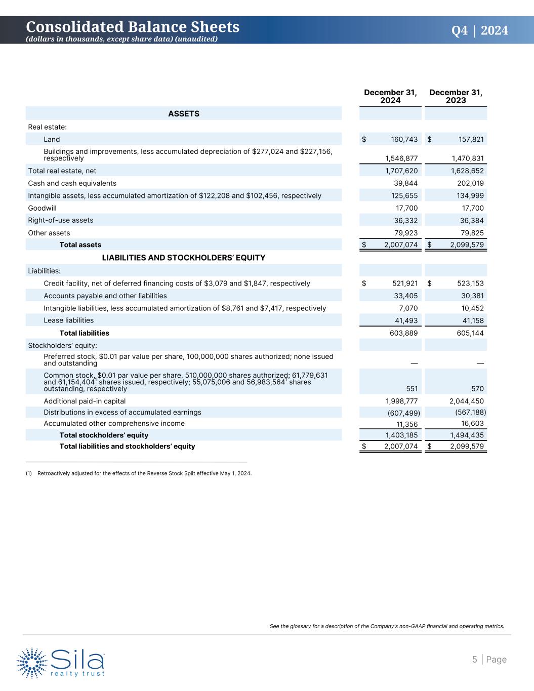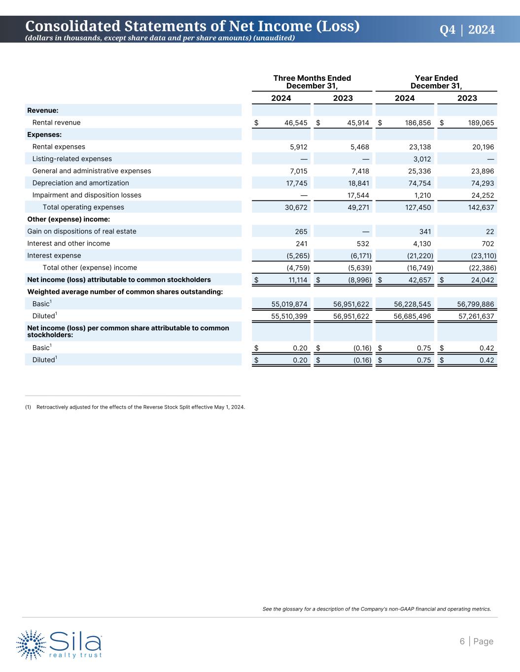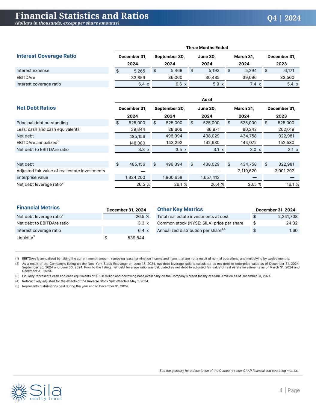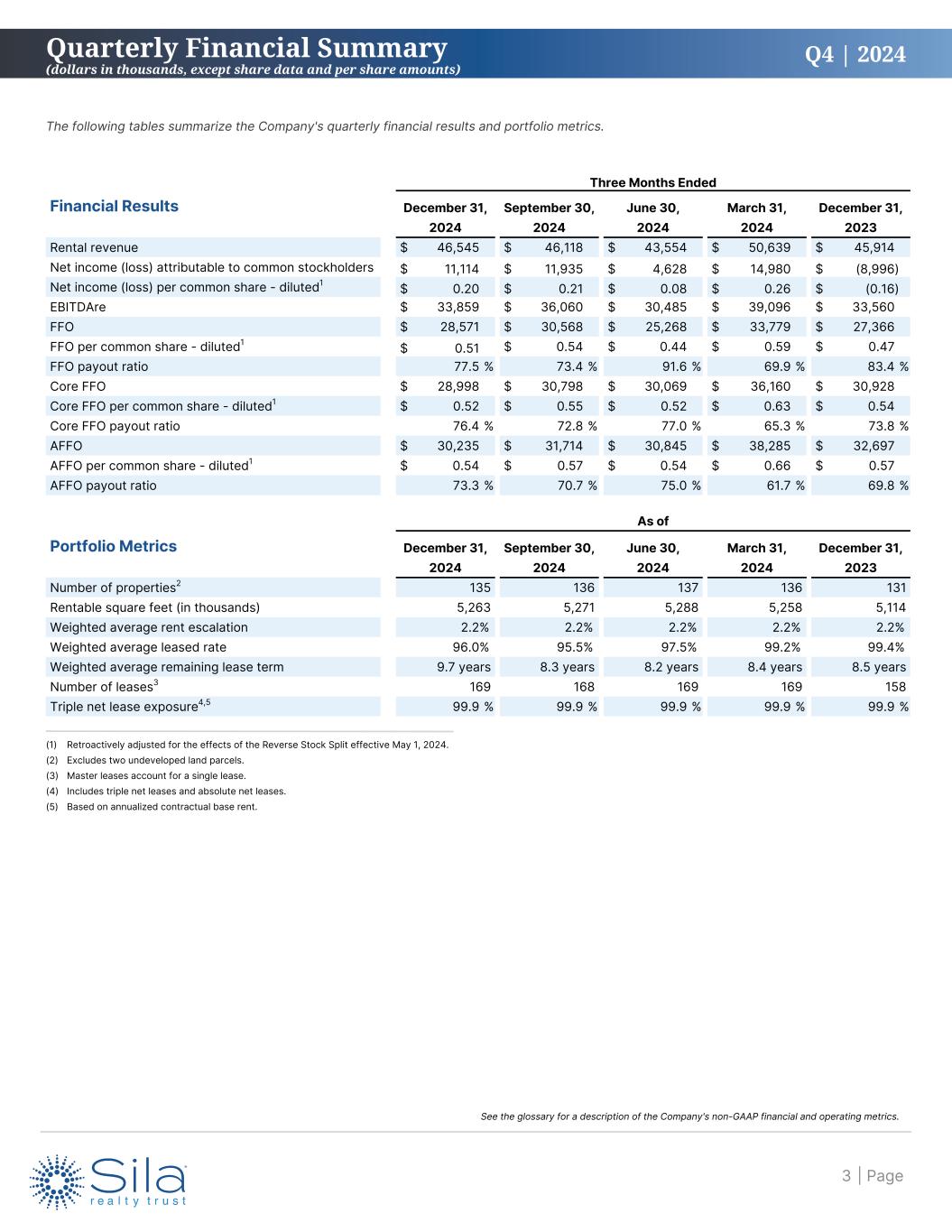 フロリダ州タンパシラ・リアルティ・トラスト・インク(NYSE: SILA)(以下「シラ」、「当社」、または「当社」)は、成長性と回復力のあるヘルスケア分野への投資に戦略的な重点を置くネットリース不動産投資信託(以下「REIT」)であり、本日、2024 年第 4 四半期および 12 月 31 日をもって終了した年度の営業成績を発表しました。