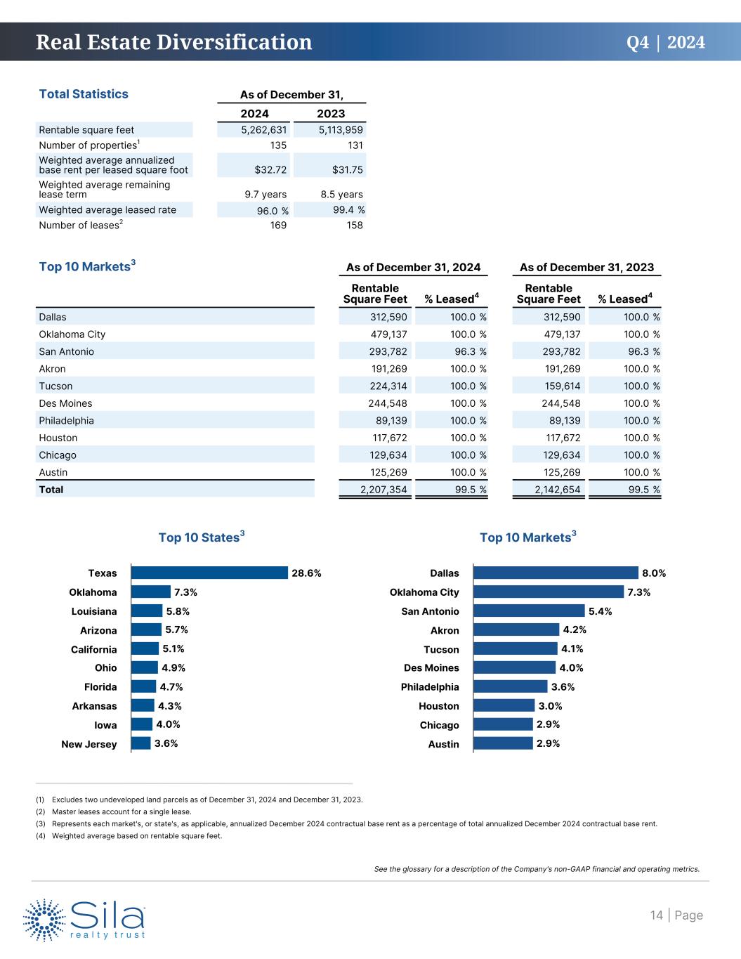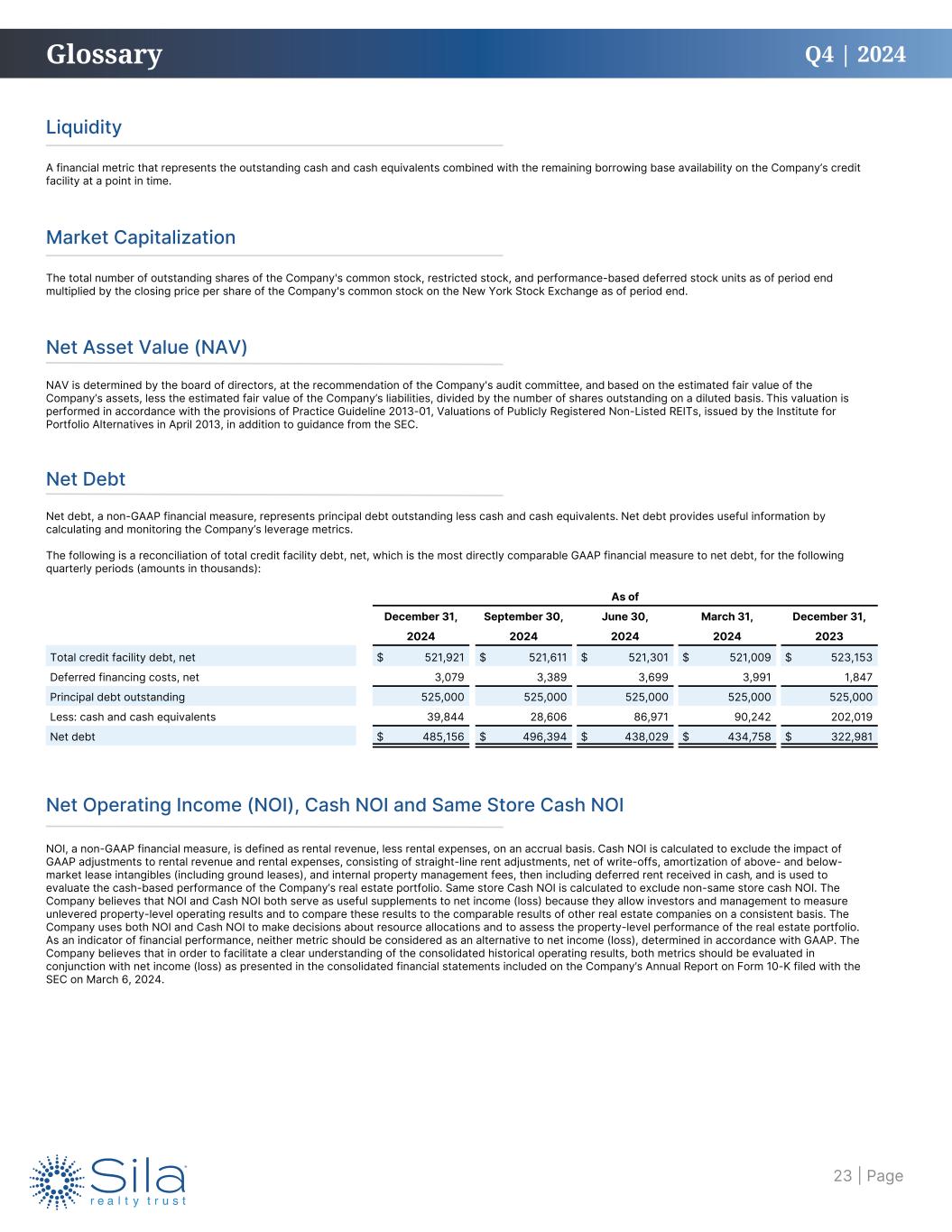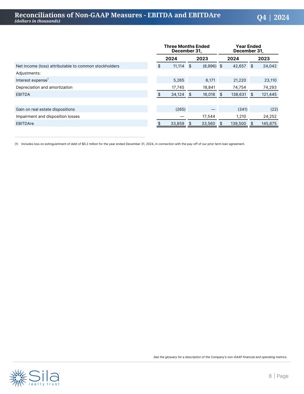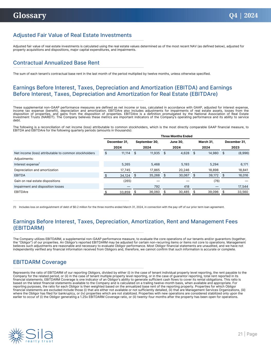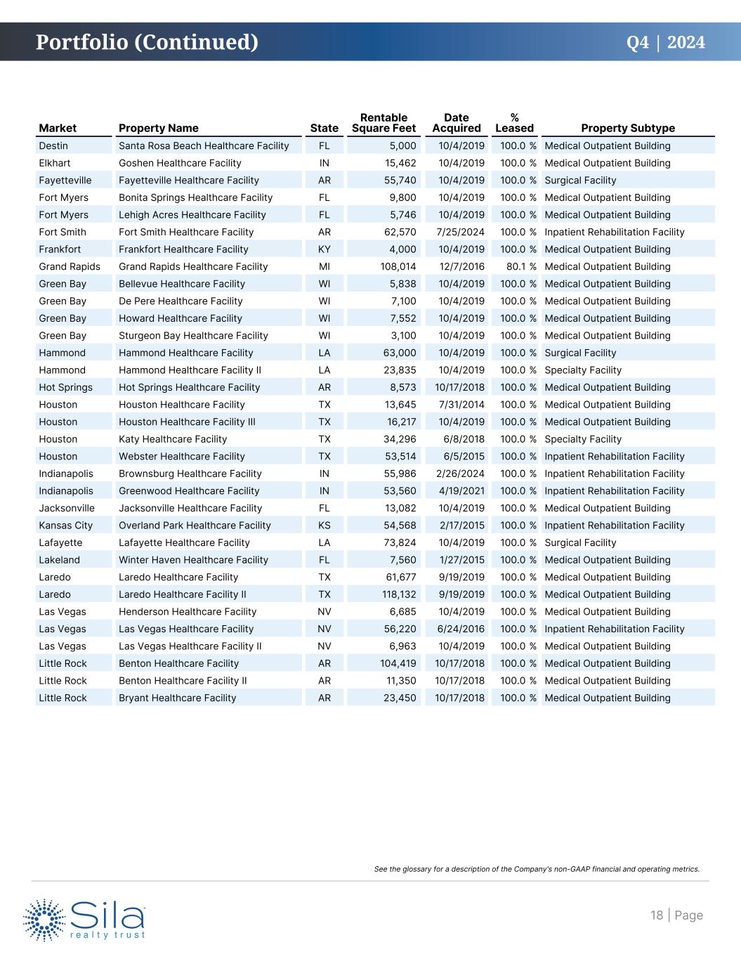 フロリダ州タンパシラ・リアルティ・トラスト・インク(NYSE: SILA)(以下「シラ」、「当社」、または「当社」)は、成長性と回復力のあるヘルスケア分野への投資に戦略的な重点を置くネットリース不動産投資信託(以下「REIT」)であり、本日、2024 年第 4 四半期および 12 月 31 日をもって終了した年度の営業成績を発表しました。