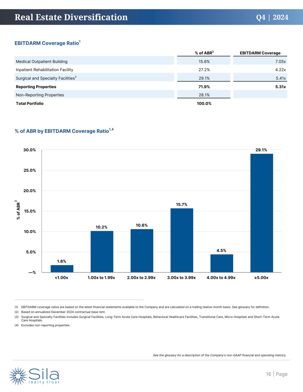 「買収に関しては、8物件を約1億6410万ドルで取得し、質の高いヘルスケア施設のポートフォリオが大幅に増加しました。さらに第4四半期には、入院リハビリテーション施設と行動医療施設の開発向けに、総額1,750万ドルのメザニンローン2件を実行しました。これらのローンは、開発期間中に強力なリスク調整後リターンをもたらすと同時に、各施設の竣工時にSilaに購入オプションを付与することで、将来のパイプライン機会を創出することが期待されています。