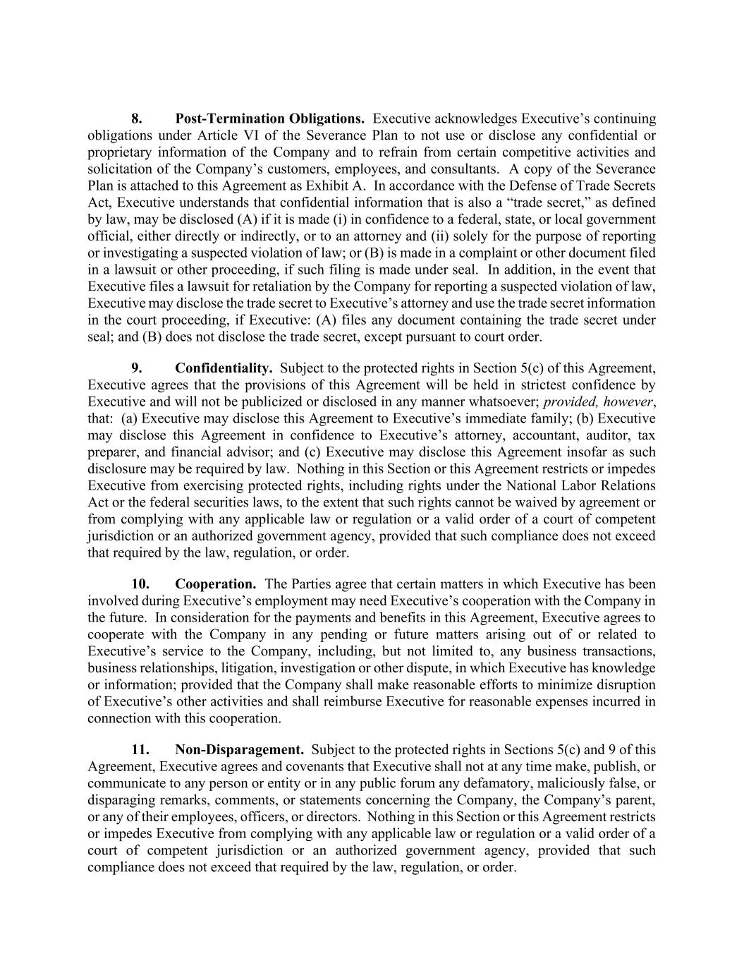 8. Post-Termination Obligations. Executive acknowledges Executive’s continuing obligations under Article VI of the Severance Plan to not use or disclose any confidential or proprietary information of the Company and to refrain from certain competitive activities and solicitation of the Company’s customers, employees, and consultants. A copy of the Severance Plan is attached to this Agreement as Exhibit A. In accordance with the Defense of Trade Secrets Act, Executive understands that confidential information that is also a “trade secret,” as defined by law, may be disclosed (A) if it is made (i) in confidence to a federal, state, or local government official, either directly or indirectly, or to an attorney and (ii) solely for the purpose of reporting or investigating a suspected violation of law; or (B) is made in a complaint or other document filed in a lawsuit or other proceeding, if such filing is made under seal. In addition, in the event that Executive files a lawsuit for retaliation by the Company for reporting a suspected violation of law, Executive may disclose the trade secret to Executive’s attorney and use the trade secret information in the court proceeding, if Executive: (A) files any document containing the trade secret under seal; and (B) does not disclose the trade secret, except pursuant to court order. 9. Confidentiality. Subject to the protected rights in Section 5(c) of this Agreement, Executive agrees that the provisions of this Agreement will be held in strictest confidence by Executive and will not be publicized or disclosed in any manner whatsoever; provided, however, that: (a) Executive may disclose this Agreement to Executive’s immediate family; (b) Executive may disclose this Agreement in confidence to Executive’s attorney, accountant, auditor, tax preparer, and financial advisor; and (c) Executive may disclose this Agreement insofar as such disclosure may be required by law. Nothing in this Section or this Agreement restricts or impedes Executive from exercising protected rights, including rights under the National Labor Relations Act or the federal securities laws, to the extent that such rights cannot be waived by agreement or from complying with any applicable law or regulation or a valid order of a court of competent jurisdiction or an authorized government agency, provided that such compliance does not exceed that required by the law, regulation, or order. 10. Cooperation. The Parties agree that certain matters in which Executive has been involved during Executive’s employment may need Executive’s cooperation with the Company in the future. In consideration for the payments and benefits in this Agreement, Executive agrees to cooperate with the Company in any pending or future matters arising out of or related to Executive’s service to the Company, including, but not limited to, any business transactions, business relationships, litigation, investigation or other dispute, in which Executive has knowledge or information; provided that the Company shall make reasonable efforts to minimize disruption of Executive’s other activities and shall reimburse Executive for reasonable expenses incurred in connection with this cooperation. 11. Non-Disparagement. Subject to the protected rights in Sections 5(c) and 9 of this Agreement, Executive agrees and covenants that Executive shall not at any time make, publish, or communicate to any person or entity or in any public forum any defamatory, maliciously false, or disparaging remarks, comments, or statements concerning the Company, the Company’s parent, or any of their employees, officers, or directors. Nothing in this Section or this Agreement restricts or impedes Executive from complying with any applicable law or regulation or a valid order of a court of competent jurisdiction or an authorized government agency, provided that such compliance does not exceed that required by the law, regulation, or order.