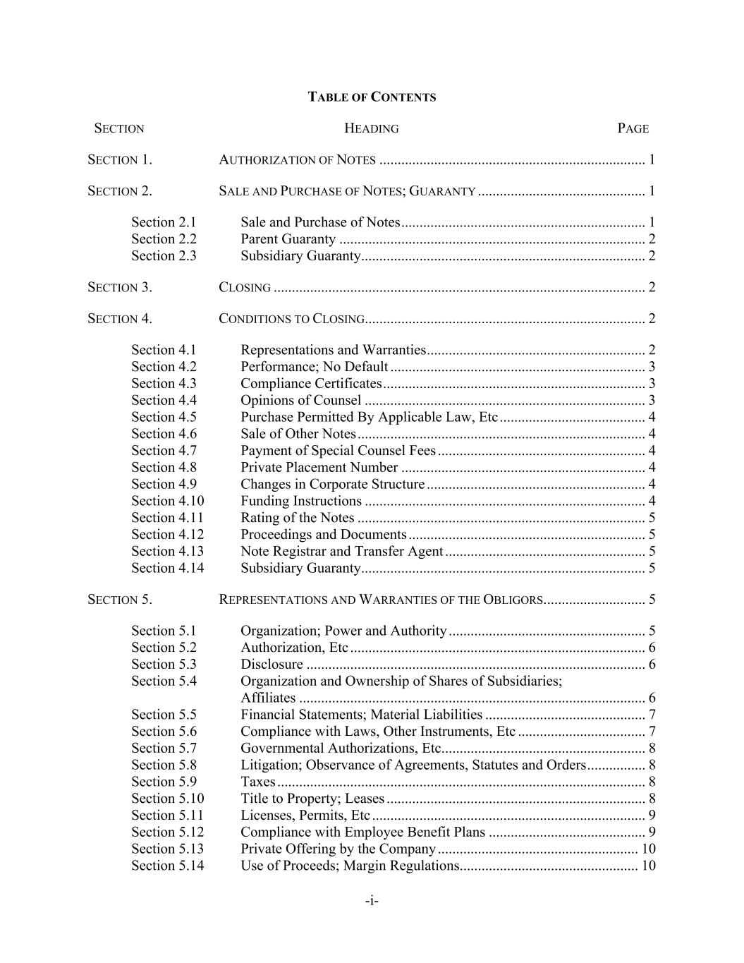 -i- TABLE OF CONTENTS SECTION HEADING PAGE SECTION 1. AUTHORIZATION OF NOTES ......................................................................... 1 SECTION 2. SALE AND PURCHASE OF NOTES; GUARANTY .............................................. 1 Section 2.1 Sale and Purchase of Notes ................................................................... 1 Section 2.2 Parent Guaranty .................................................................................... 2 Section 2.3 Subsidiary Guaranty.............................................................................. 2 SECTION 3. CLOSING ...................................................................................................... 2 SECTION 4. CONDITIONS TO CLOSING ............................................................................. 2 Section 4.1 Representations and Warranties ............................................................ 2 Section 4.2 Performance; No Default ...................................................................... 3 Section 4.3 Compliance Certificates ........................................................................ 3 Section 4.4 Opinions of Counsel ............................................................................. 3 Section 4.5 Purchase Permitted By Applicable Law, Etc ........................................ 4 Section 4.6 Sale of Other Notes ............................................................................... 4 Section 4.7 Payment of Special Counsel Fees ......................................................... 4 Section 4.8 Private Placement Number ................................................................... 4 Section 4.9 Changes in Corporate Structure ............................................................ 4 Section 4.10 Funding Instructions ............................................................................. 4 Section 4.11 Rating of the Notes ............................................................................... 5 Section 4.12 Proceedings and Documents ................................................................. 5 Section 4.13 Note Registrar and Transfer Agent ....................................................... 5 Section 4.14 Subsidiary Guaranty.............................................................................. 5 SECTION 5. REPRESENTATIONS AND WARRANTIES OF THE OBLIGORS. ........................... 5 Section 5.1 Organization; Power and Authority ...................................................... 5 Section 5.2 Authorization, Etc ................................................................................. 6 Section 5.3 Disclosure ............................................................................................. 6 Section 5.4 Organization and Ownership of Shares of Subsidiaries; Affiliates ............................................................................................... 6 Section 5.5 Financial Statements; Material Liabilities ............................................ 7 Section 5.6 Compliance with Laws, Other Instruments, Etc ................................... 7 Section 5.7 Governmental Authorizations, Etc ........................................................ 8 Section 5.8 Litigation; Observance of Agreements, Statutes and Orders ................ 8 Section 5.9 Taxes ..................................................................................................... 8 Section 5.10 Title to Property; Leases ....................................................................... 8 Section 5.11 Licenses, Permits, Etc ........................................................................... 9 Section 5.12 Compliance with Employee Benefit Plans ........................................... 9 Section 5.13 Private Offering by the Company ....................................................... 10 Section 5.14 Use of Proceeds; Margin Regulations................................................. 10