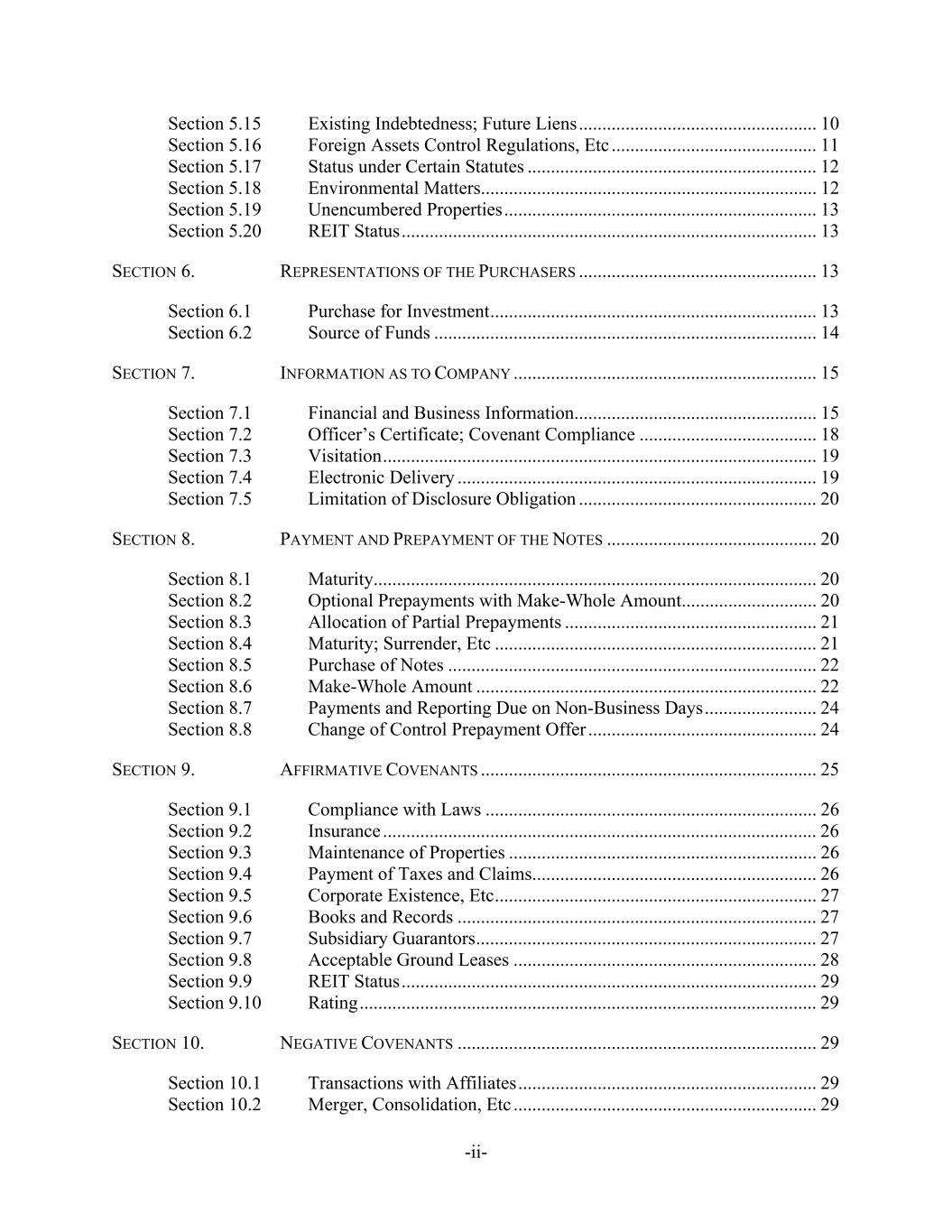 -ii- Section 5.15 Existing Indebtedness; Future Liens ................................................... 10 Section 5.16 Foreign Assets Control Regulations, Etc ............................................ 11 Section 5.17 Status under Certain Statutes .............................................................. 12 Section 5.18 Environmental Matters........................................................................ 12 Section 5.19 Unencumbered Properties ................................................................... 13 Section 5.20 REIT Status ......................................................................................... 13 SECTION 6. REPRESENTATIONS OF THE PURCHASERS ................................................... 13 Section 6.1 Purchase for Investment ...................................................................... 13 Section 6.2 Source of Funds .................................................................................. 14 SECTION 7. INFORMATION AS TO COMPANY ................................................................. 15 Section 7.1 Financial and Business Information.................................................... 15 Section 7.2 Officer’s Certificate; Covenant Compliance ...................................... 18 Section 7.3 Visitation ............................................................................................. 19 Section 7.4 Electronic Delivery ............................................................................. 19 Section 7.5 Limitation of Disclosure Obligation ................................................... 20 SECTION 8. PAYMENT AND PREPAYMENT OF THE NOTES ............................................. 20 Section 8.1 Maturity............................................................................................... 20 Section 8.2 Optional Prepayments with Make-Whole Amount ............................. 20 Section 8.3 Allocation of Partial Prepayments ...................................................... 21 Section 8.4 Maturity; Surrender, Etc ..................................................................... 21 Section 8.5 Purchase of Notes ............................................................................... 22 Section 8.6 Make-Whole Amount ......................................................................... 22 Section 8.7 Payments and Reporting Due on Non-Business Days ........................ 24 Section 8.8 Change of Control Prepayment Offer ................................................. 24 SECTION 9. AFFIRMATIVE COVENANTS ........................................................................ 25 Section 9.1 Compliance with Laws ....................................................................... 26 Section 9.2 Insurance ............................................................................................. 26 Section 9.3 Maintenance of Properties .................................................................. 26 Section 9.4 Payment of Taxes and Claims ............................................................. 26 Section 9.5 Corporate Existence, Etc ..................................................................... 27 Section 9.6 Books and Records ............................................................................. 27 Section 9.7 Subsidiary Guarantors ......................................................................... 27 Section 9.8 Acceptable Ground Leases ................................................................. 28 Section 9.9 REIT Status ......................................................................................... 29 Section 9.10 Rating .................................................................................................. 29 SECTION 10. NEGATIVE COVENANTS ............................................................................. 29 Section 10.1 Transactions with Affiliates ................................................................ 29 Section 10.2 Merger, Consolidation, Etc ................................................................. 29