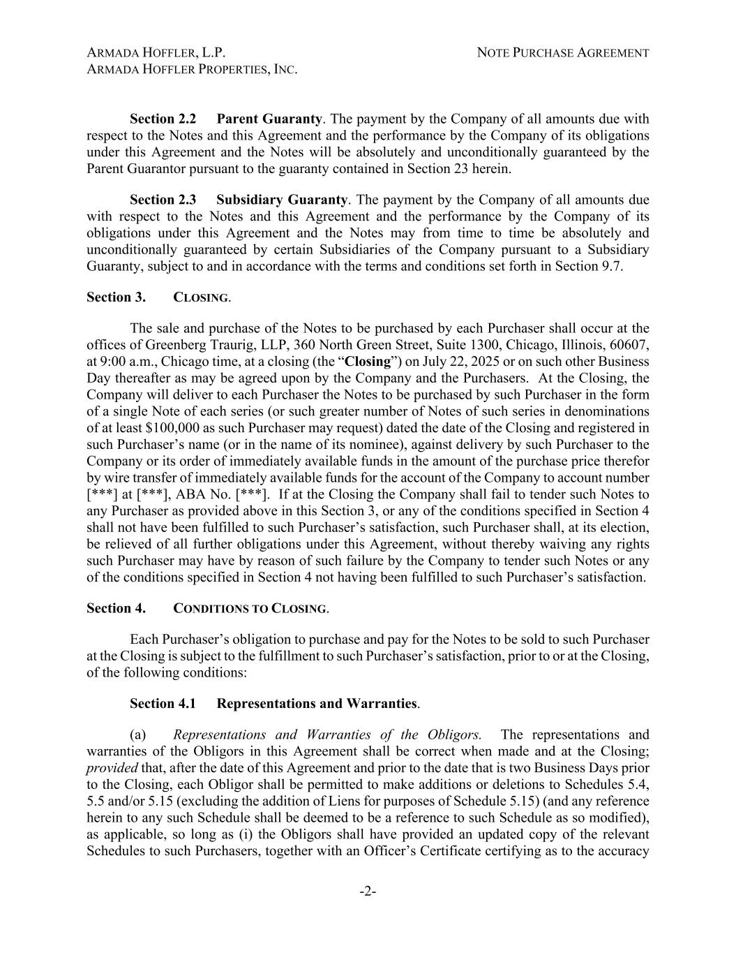 ARMADA HOFFLER, L.P. NOTE PURCHASE AGREEMENT ARMADA HOFFLER PROPERTIES, INC. -2- Section 2.2 Parent Guaranty. The payment by the Company of all amounts due with respect to the Notes and this Agreement and the performance by the Company of its obligations under this Agreement and the Notes will be absolutely and unconditionally guaranteed by the Parent Guarantor pursuant to the guaranty contained in Section 23 herein. Section 2.3 Subsidiary Guaranty. The payment by the Company of all amounts due with respect to the Notes and this Agreement and the performance by the Company of its obligations under this Agreement and the Notes may from time to time be absolutely and unconditionally guaranteed by certain Subsidiaries of the Company pursuant to a Subsidiary Guaranty, subject to and in accordance with the terms and conditions set forth in Section 9.7. Section 3. CLOSING. The sale and purchase of the Notes to be purchased by each Purchaser shall occur at the offices of Greenberg Traurig, LLP, 360 North Green Street, Suite 1300, Chicago, Illinois, 60607, at 9:00 a.m., Chicago time, at a closing (the “Closing”) on July 22, 2025 or on such other Business Day thereafter as may be agreed upon by the Company and the Purchasers. At the Closing, the Company will deliver to each Purchaser the Notes to be purchased by such Purchaser in the form of a single Note of each series (or such greater number of Notes of such series in denominations of at least $100,000 as such Purchaser may request) dated the date of the Closing and registered in such Purchaser’s name (or in the name of its nominee), against delivery by such Purchaser to the Company or its order of immediately available funds in the amount of the purchase price therefor by wire transfer of immediately available funds for the account of the Company to account number [***] at [***], ABA No. [***]. If at the Closing the Company shall fail to tender such Notes to any Purchaser as provided above in this Section 3, or any of the conditions specified in Section 4 shall not have been fulfilled to such Purchaser’s satisfaction, such Purchaser shall, at its election, be relieved of all further obligations under this Agreement, without thereby waiving any rights such Purchaser may have by reason of such failure by the Company to tender such Notes or any of the conditions specified in Section 4 not having been fulfilled to such Purchaser’s satisfaction. Section 4. CONDITIONS TO CLOSING. Each Purchaser’s obligation to purchase and pay for the Notes to be sold to such Purchaser at the Closing is subject to the fulfillment to such Purchaser’s satisfaction, prior to or at the Closing, of the following conditions: Section 4.1 Representations and Warranties. (a) Representations and Warranties of the Obligors. The representations and warranties of the Obligors in this Agreement shall be correct when made and at the Closing; provided that, after the date of this Agreement and prior to the date that is two Business Days prior to the Closing, each Obligor shall be permitted to make additions or deletions to Schedules 5.4, 5.5 and/or 5.15 (excluding the addition of Liens for purposes of Schedule 5.15) (and any reference herein to any such Schedule shall be deemed to be a reference to such Schedule as so modified), as applicable, so long as (i) the Obligors shall have provided an updated copy of the relevant Schedules to such Purchasers, together with an Officer’s Certificate certifying as to the accuracy
