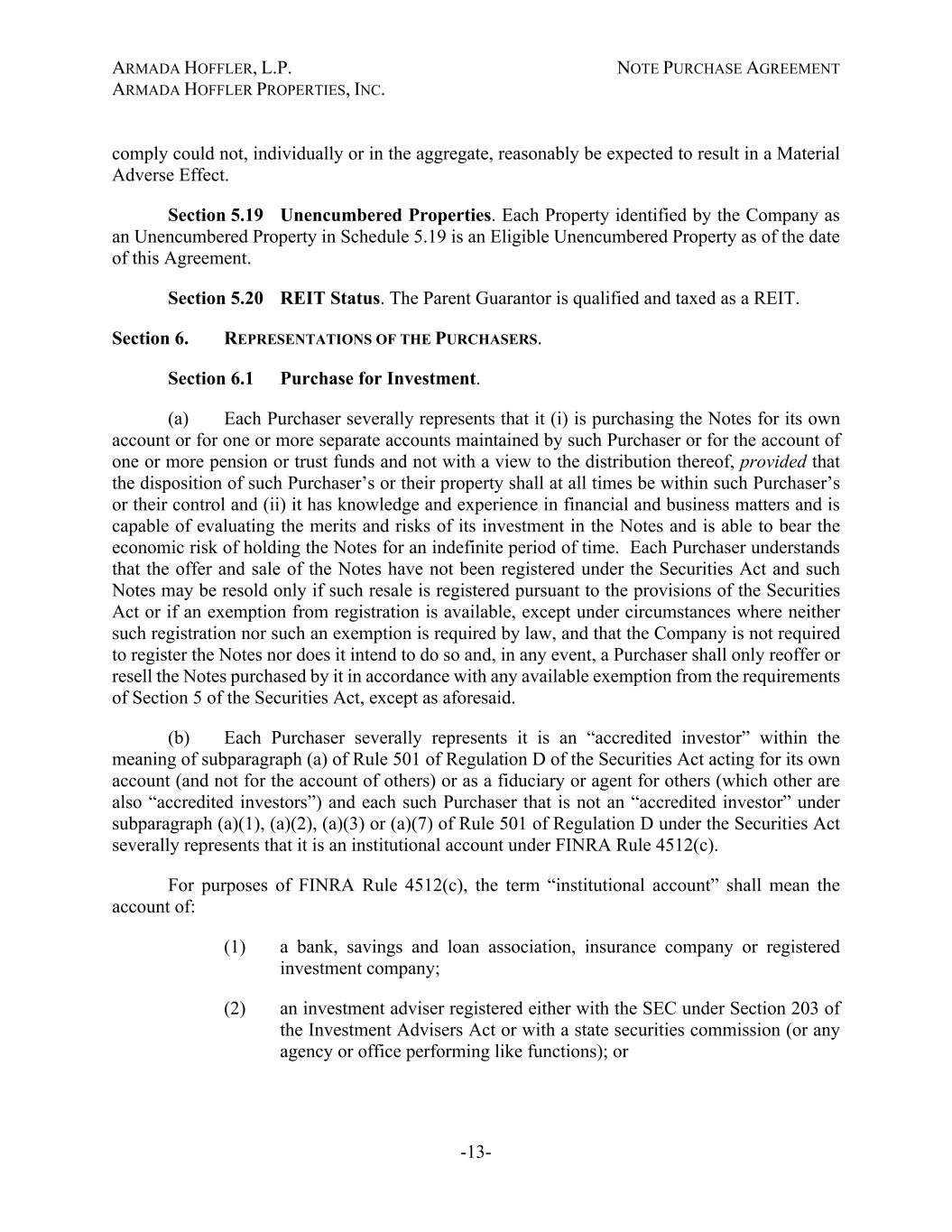 ARMADA HOFFLER, L.P. NOTE PURCHASE AGREEMENT ARMADA HOFFLER PROPERTIES, INC. -13- comply could not, individually or in the aggregate, reasonably be expected to result in a Material Adverse Effect. Section 5.19 Unencumbered Properties. Each Property identified by the Company as an Unencumbered Property in Schedule 5.19 is an Eligible Unencumbered Property as of the date of this Agreement. Section 5.20 REIT Status. The Parent Guarantor is qualified and taxed as a REIT. Section 6. REPRESENTATIONS OF THE PURCHASERS. Section 6.1 Purchase for Investment. (a) Each Purchaser severally represents that it (i) is purchasing the Notes for its own account or for one or more separate accounts maintained by such Purchaser or for the account of one or more pension or trust funds and not with a view to the distribution thereof, provided that the disposition of such Purchaser’s or their property shall at all times be within such Purchaser’s or their control and (ii) it has knowledge and experience in financial and business matters and is capable of evaluating the merits and risks of its investment in the Notes and is able to bear the economic risk of holding the Notes for an indefinite period of time. Each Purchaser understands that the offer and sale of the Notes have not been registered under the Securities Act and such Notes may be resold only if such resale is registered pursuant to the provisions of the Securities Act or if an exemption from registration is available, except under circumstances where neither such registration nor such an exemption is required by law, and that the Company is not required to register the Notes nor does it intend to do so and, in any event, a Purchaser shall only reoffer or resell the Notes purchased by it in accordance with any available exemption from the requirements of Section 5 of the Securities Act, except as aforesaid. (b) Each Purchaser severally represents it is an “accredited investor” within the meaning of subparagraph (a) of Rule 501 of Regulation D of the Securities Act acting for its own account (and not for the account of others) or as a fiduciary or agent for others (which other are also “accredited investors”) and each such Purchaser that is not an “accredited investor” under subparagraph (a)(1), (a)(2), (a)(3) or (a)(7) of Rule 501 of Regulation D under the Securities Act severally represents that it is an institutional account under FINRA Rule 4512(c). For purposes of FINRA Rule 4512(c), the term “institutional account” shall mean the account of: (1) a bank, savings and loan association, insurance company or registered investment company; (2) an investment adviser registered either with the SEC under Section 203 of the Investment Advisers Act or with a state securities commission (or any agency or office performing like functions); or