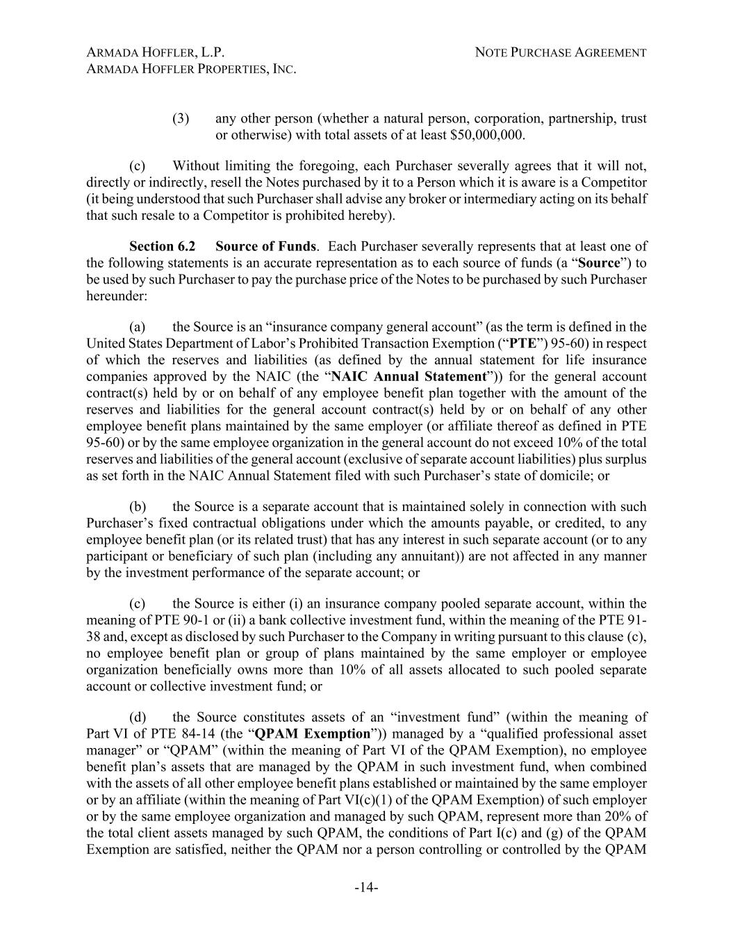 ARMADA HOFFLER, L.P. NOTE PURCHASE AGREEMENT ARMADA HOFFLER PROPERTIES, INC. -14- (3) any other person (whether a natural person, corporation, partnership, trust or otherwise) with total assets of at least $50,000,000. (c) Without limiting the foregoing, each Purchaser severally agrees that it will not, directly or indirectly, resell the Notes purchased by it to a Person which it is aware is a Competitor (it being understood that such Purchaser shall advise any broker or intermediary acting on its behalf that such resale to a Competitor is prohibited hereby). Section 6.2 Source of Funds. Each Purchaser severally represents that at least one of the following statements is an accurate representation as to each source of funds (a “Source”) to be used by such Purchaser to pay the purchase price of the Notes to be purchased by such Purchaser hereunder: (a) the Source is an “insurance company general account” (as the term is defined in the United States Department of Labor’s Prohibited Transaction Exemption (“PTE”) 95-60) in respect of which the reserves and liabilities (as defined by the annual statement for life insurance companies approved by the NAIC (the “NAIC Annual Statement”)) for the general account contract(s) held by or on behalf of any employee benefit plan together with the amount of the reserves and liabilities for the general account contract(s) held by or on behalf of any other employee benefit plans maintained by the same employer (or affiliate thereof as defined in PTE 95-60) or by the same employee organization in the general account do not exceed 10% of the total reserves and liabilities of the general account (exclusive of separate account liabilities) plus surplus as set forth in the NAIC Annual Statement filed with such Purchaser’s state of domicile; or (b) the Source is a separate account that is maintained solely in connection with such Purchaser’s fixed contractual obligations under which the amounts payable, or credited, to any employee benefit plan (or its related trust) that has any interest in such separate account (or to any participant or beneficiary of such plan (including any annuitant)) are not affected in any manner by the investment performance of the separate account; or (c) the Source is either (i) an insurance company pooled separate account, within the meaning of PTE 90-1 or (ii) a bank collective investment fund, within the meaning of the PTE 91- 38 and, except as disclosed by such Purchaser to the Company in writing pursuant to this clause (c), no employee benefit plan or group of plans maintained by the same employer or employee organization beneficially owns more than 10% of all assets allocated to such pooled separate account or collective investment fund; or (d) the Source constitutes assets of an “investment fund” (within the meaning of Part VI of PTE 84-14 (the “QPAM Exemption”)) managed by a “qualified professional asset manager” or “QPAM” (within the meaning of Part VI of the QPAM Exemption), no employee benefit plan’s assets that are managed by the QPAM in such investment fund, when combined with the assets of all other employee benefit plans established or maintained by the same employer or by an affiliate (within the meaning of Part VI(c)(1) of the QPAM Exemption) of such employer or by the same employee organization and managed by such QPAM, represent more than 20% of the total client assets managed by such QPAM, the conditions of Part I(c) and (g) of the QPAM Exemption are satisfied, neither the QPAM nor a person controlling or controlled by the QPAM