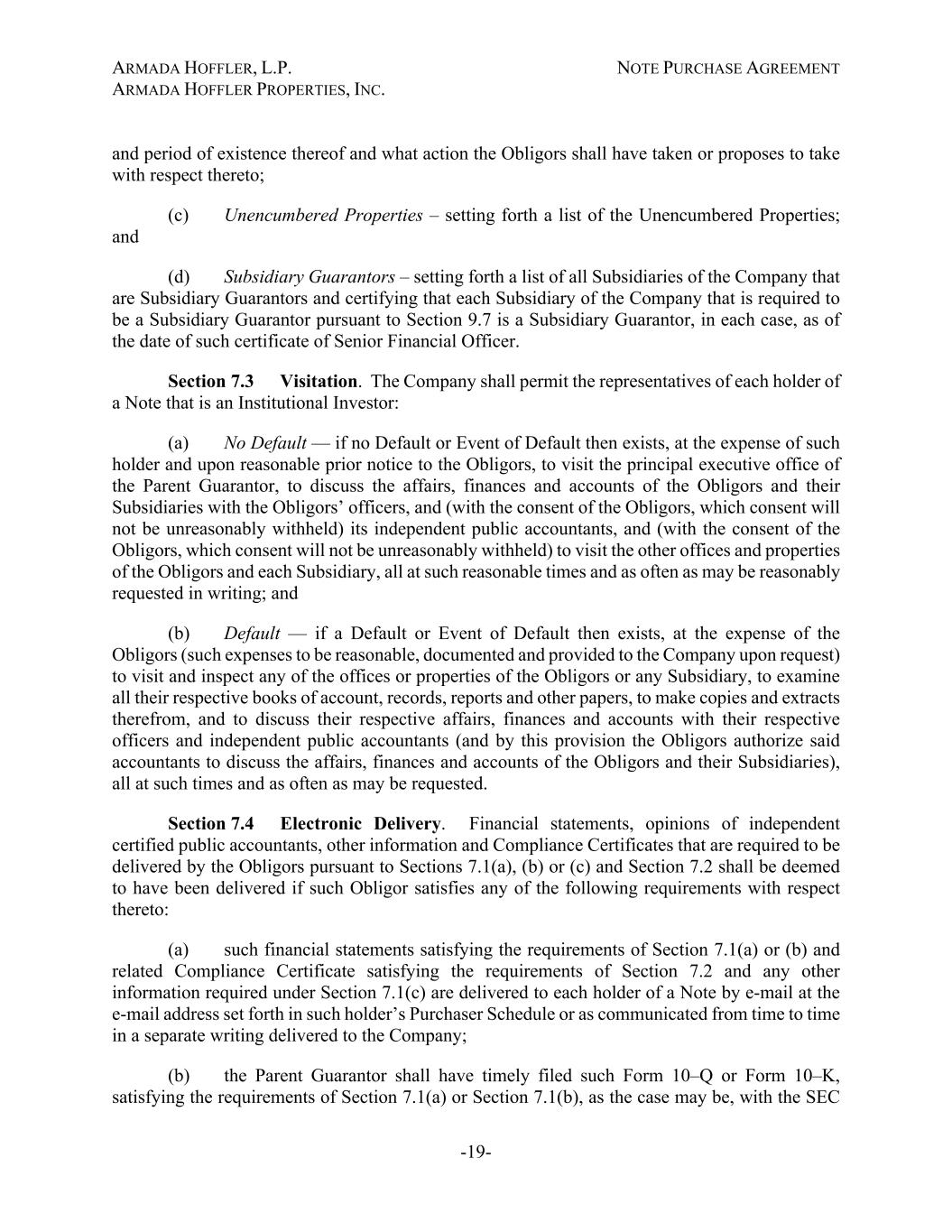 ARMADA HOFFLER, L.P. NOTE PURCHASE AGREEMENT ARMADA HOFFLER PROPERTIES, INC. -19- and period of existence thereof and what action the Obligors shall have taken or proposes to take with respect thereto; (c) Unencumbered Properties – setting forth a list of the Unencumbered Properties; and (d) Subsidiary Guarantors – setting forth a list of all Subsidiaries of the Company that are Subsidiary Guarantors and certifying that each Subsidiary of the Company that is required to be a Subsidiary Guarantor pursuant to Section 9.7 is a Subsidiary Guarantor, in each case, as of the date of such certificate of Senior Financial Officer. Section 7.3 Visitation. The Company shall permit the representatives of each holder of a Note that is an Institutional Investor: (a) No Default — if no Default or Event of Default then exists, at the expense of such holder and upon reasonable prior notice to the Obligors, to visit the principal executive office of the Parent Guarantor, to discuss the affairs, finances and accounts of the Obligors and their Subsidiaries with the Obligors’ officers, and (with the consent of the Obligors, which consent will not be unreasonably withheld) its independent public accountants, and (with the consent of the Obligors, which consent will not be unreasonably withheld) to visit the other offices and properties of the Obligors and each Subsidiary, all at such reasonable times and as often as may be reasonably requested in writing; and (b) Default — if a Default or Event of Default then exists, at the expense of the Obligors (such expenses to be reasonable, documented and provided to the Company upon request) to visit and inspect any of the offices or properties of the Obligors or any Subsidiary, to examine all their respective books of account, records, reports and other papers, to make copies and extracts therefrom, and to discuss their respective affairs, finances and accounts with their respective officers and independent public accountants (and by this provision the Obligors authorize said accountants to discuss the affairs, finances and accounts of the Obligors and their Subsidiaries), all at such times and as often as may be requested. Section 7.4 Electronic Delivery. Financial statements, opinions of independent certified public accountants, other information and Compliance Certificates that are required to be delivered by the Obligors pursuant to Sections 7.1(a), (b) or (c) and Section 7.2 shall be deemed to have been delivered if such Obligor satisfies any of the following requirements with respect thereto: (a) such financial statements satisfying the requirements of Section 7.1(a) or (b) and related Compliance Certificate satisfying the requirements of Section 7.2 and any other information required under Section 7.1(c) are delivered to each holder of a Note by e-mail at the e-mail address set forth in such holder’s Purchaser Schedule or as communicated from time to time in a separate writing delivered to the Company; (b) the Parent Guarantor shall have timely filed such Form 10–Q or Form 10–K, satisfying the requirements of Section 7.1(a) or Section 7.1(b), as the case may be, with the SEC