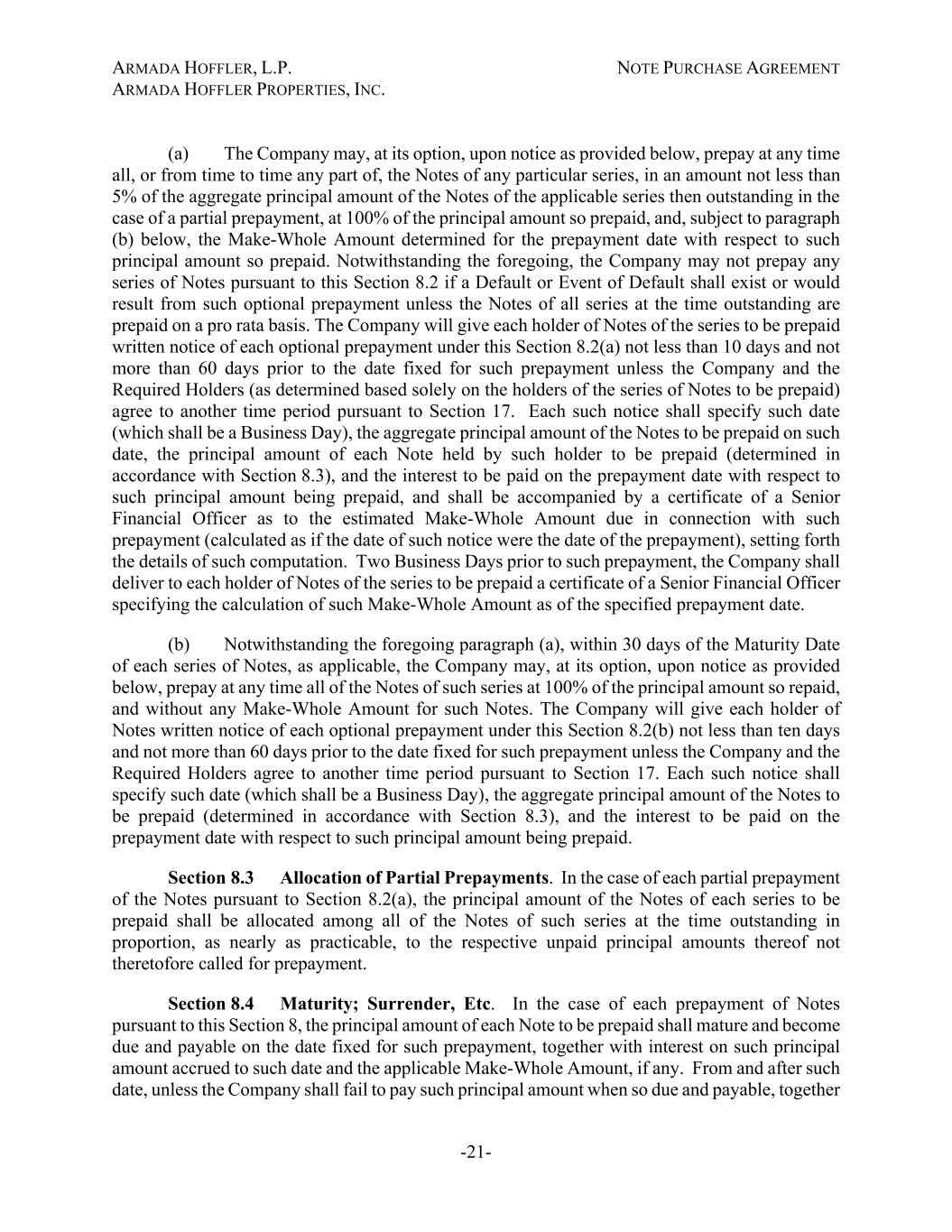 ARMADA HOFFLER, L.P. NOTE PURCHASE AGREEMENT ARMADA HOFFLER PROPERTIES, INC. -21- (a) The Company may, at its option, upon notice as provided below, prepay at any time all, or from time to time any part of, the Notes of any particular series, in an amount not less than 5% of the aggregate principal amount of the Notes of the applicable series then outstanding in the case of a partial prepayment, at 100% of the principal amount so prepaid, and, subject to paragraph (b) below, the Make-Whole Amount determined for the prepayment date with respect to such principal amount so prepaid. Notwithstanding the foregoing, the Company may not prepay any series of Notes pursuant to this Section 8.2 if a Default or Event of Default shall exist or would result from such optional prepayment unless the Notes of all series at the time outstanding are prepaid on a pro rata basis. The Company will give each holder of Notes of the series to be prepaid written notice of each optional prepayment under this Section 8.2(a) not less than 10 days and not more than 60 days prior to the date fixed for such prepayment unless the Company and the Required Holders (as determined based solely on the holders of the series of Notes to be prepaid) agree to another time period pursuant to Section 17. Each such notice shall specify such date (which shall be a Business Day), the aggregate principal amount of the Notes to be prepaid on such date, the principal amount of each Note held by such holder to be prepaid (determined in accordance with Section 8.3), and the interest to be paid on the prepayment date with respect to such principal amount being prepaid, and shall be accompanied by a certificate of a Senior Financial Officer as to the estimated Make-Whole Amount due in connection with such prepayment (calculated as if the date of such notice were the date of the prepayment), setting forth the details of such computation. Two Business Days prior to such prepayment, the Company shall deliver to each holder of Notes of the series to be prepaid a certificate of a Senior Financial Officer specifying the calculation of such Make-Whole Amount as of the specified prepayment date. (b) Notwithstanding the foregoing paragraph (a), within 30 days of the Maturity Date of each series of Notes, as applicable, the Company may, at its option, upon notice as provided below, prepay at any time all of the Notes of such series at 100% of the principal amount so repaid, and without any Make-Whole Amount for such Notes. The Company will give each holder of Notes written notice of each optional prepayment under this Section 8.2(b) not less than ten days and not more than 60 days prior to the date fixed for such prepayment unless the Company and the Required Holders agree to another time period pursuant to Section 17. Each such notice shall specify such date (which shall be a Business Day), the aggregate principal amount of the Notes to be prepaid (determined in accordance with Section 8.3), and the interest to be paid on the prepayment date with respect to such principal amount being prepaid. Section 8.3 Allocation of Partial Prepayments. In the case of each partial prepayment of the Notes pursuant to Section 8.2(a), the principal amount of the Notes of each series to be prepaid shall be allocated among all of the Notes of such series at the time outstanding in proportion, as nearly as practicable, to the respective unpaid principal amounts thereof not theretofore called for prepayment. Section 8.4 Maturity; Surrender, Etc. In the case of each prepayment of Notes pursuant to this Section 8, the principal amount of each Note to be prepaid shall mature and become due and payable on the date fixed for such prepayment, together with interest on such principal amount accrued to such date and the applicable Make-Whole Amount, if any. From and after such date, unless the Company shall fail to pay such principal amount when so due and payable, together