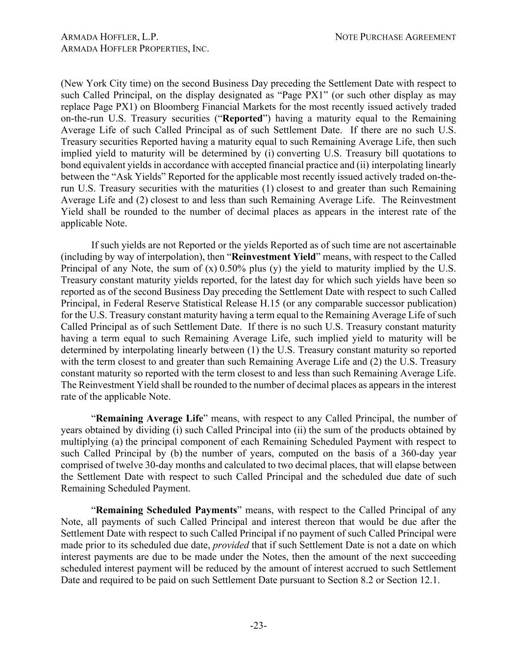 ARMADA HOFFLER, L.P. NOTE PURCHASE AGREEMENT ARMADA HOFFLER PROPERTIES, INC. -23- (New York City time) on the second Business Day preceding the Settlement Date with respect to such Called Principal, on the display designated as “Page PX1” (or such other display as may replace Page PX1) on Bloomberg Financial Markets for the most recently issued actively traded on-the-run U.S. Treasury securities (“Reported”) having a maturity equal to the Remaining Average Life of such Called Principal as of such Settlement Date. If there are no such U.S. Treasury securities Reported having a maturity equal to such Remaining Average Life, then such implied yield to maturity will be determined by (i) converting U.S. Treasury bill quotations to bond equivalent yields in accordance with accepted financial practice and (ii) interpolating linearly between the “Ask Yields” Reported for the applicable most recently issued actively traded on-the- run U.S. Treasury securities with the maturities (1) closest to and greater than such Remaining Average Life and (2) closest to and less than such Remaining Average Life. The Reinvestment Yield shall be rounded to the number of decimal places as appears in the interest rate of the applicable Note. If such yields are not Reported or the yields Reported as of such time are not ascertainable (including by way of interpolation), then “Reinvestment Yield” means, with respect to the Called Principal of any Note, the sum of (x) 0.50% plus (y) the yield to maturity implied by the U.S. Treasury constant maturity yields reported, for the latest day for which such yields have been so reported as of the second Business Day preceding the Settlement Date with respect to such Called Principal, in Federal Reserve Statistical Release H.15 (or any comparable successor publication) for the U.S. Treasury constant maturity having a term equal to the Remaining Average Life of such Called Principal as of such Settlement Date. If there is no such U.S. Treasury constant maturity having a term equal to such Remaining Average Life, such implied yield to maturity will be determined by interpolating linearly between (1) the U.S. Treasury constant maturity so reported with the term closest to and greater than such Remaining Average Life and (2) the U.S. Treasury constant maturity so reported with the term closest to and less than such Remaining Average Life. The Reinvestment Yield shall be rounded to the number of decimal places as appears in the interest rate of the applicable Note. “Remaining Average Life” means, with respect to any Called Principal, the number of years obtained by dividing (i) such Called Principal into (ii) the sum of the products obtained by multiplying (a) the principal component of each Remaining Scheduled Payment with respect to such Called Principal by (b) the number of years, computed on the basis of a 360-day year comprised of twelve 30-day months and calculated to two decimal places, that will elapse between the Settlement Date with respect to such Called Principal and the scheduled due date of such Remaining Scheduled Payment. “Remaining Scheduled Payments” means, with respect to the Called Principal of any Note, all payments of such Called Principal and interest thereon that would be due after the Settlement Date with respect to such Called Principal if no payment of such Called Principal were made prior to its scheduled due date, provided that if such Settlement Date is not a date on which interest payments are due to be made under the Notes, then the amount of the next succeeding scheduled interest payment will be reduced by the amount of interest accrued to such Settlement Date and required to be paid on such Settlement Date pursuant to Section 8.2 or Section 12.1.