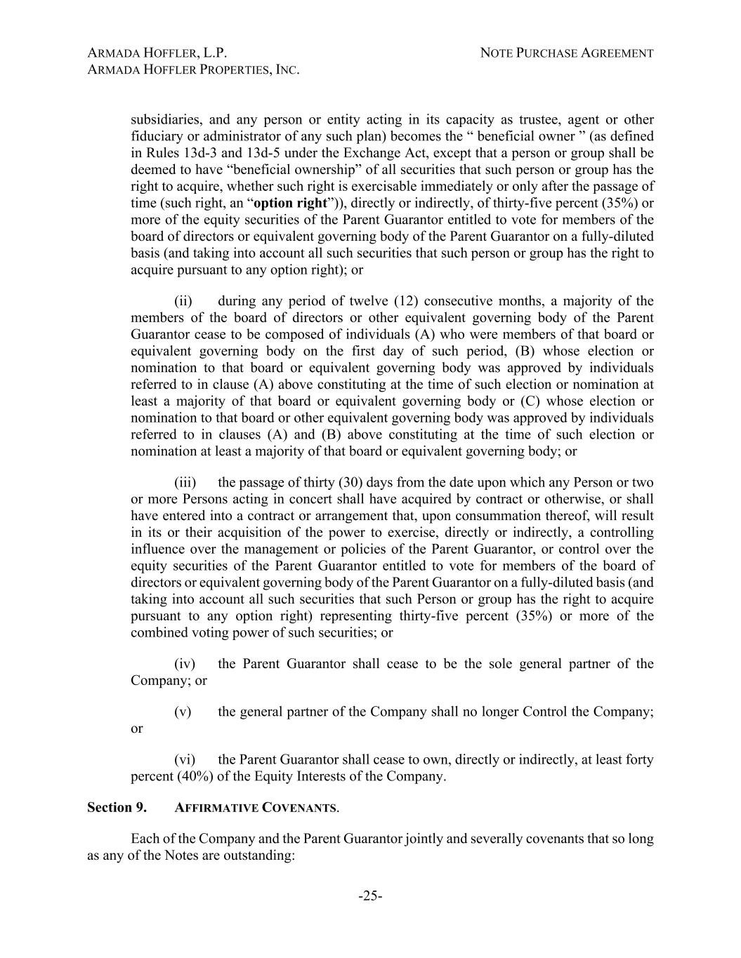 ARMADA HOFFLER, L.P. NOTE PURCHASE AGREEMENT ARMADA HOFFLER PROPERTIES, INC. -25- subsidiaries, and any person or entity acting in its capacity as trustee, agent or other fiduciary or administrator of any such plan) becomes the “ beneficial owner ” (as defined in Rules 13d-3 and 13d-5 under the Exchange Act, except that a person or group shall be deemed to have “beneficial ownership” of all securities that such person or group has the right to acquire, whether such right is exercisable immediately or only after the passage of time (such right, an “option right”)), directly or indirectly, of thirty-five percent (35%) or more of the equity securities of the Parent Guarantor entitled to vote for members of the board of directors or equivalent governing body of the Parent Guarantor on a fully-diluted basis (and taking into account all such securities that such person or group has the right to acquire pursuant to any option right); or (ii) during any period of twelve (12) consecutive months, a majority of the members of the board of directors or other equivalent governing body of the Parent Guarantor cease to be composed of individuals (A) who were members of that board or equivalent governing body on the first day of such period, (B) whose election or nomination to that board or equivalent governing body was approved by individuals referred to in clause (A) above constituting at the time of such election or nomination at least a majority of that board or equivalent governing body or (C) whose election or nomination to that board or other equivalent governing body was approved by individuals referred to in clauses (A) and (B) above constituting at the time of such election or nomination at least a majority of that board or equivalent governing body; or (iii) the passage of thirty (30) days from the date upon which any Person or two or more Persons acting in concert shall have acquired by contract or otherwise, or shall have entered into a contract or arrangement that, upon consummation thereof, will result in its or their acquisition of the power to exercise, directly or indirectly, a controlling influence over the management or policies of the Parent Guarantor, or control over the equity securities of the Parent Guarantor entitled to vote for members of the board of directors or equivalent governing body of the Parent Guarantor on a fully-diluted basis (and taking into account all such securities that such Person or group has the right to acquire pursuant to any option right) representing thirty-five percent (35%) or more of the combined voting power of such securities; or (iv) the Parent Guarantor shall cease to be the sole general partner of the Company; or (v) the general partner of the Company shall no longer Control the Company; or (vi) the Parent Guarantor shall cease to own, directly or indirectly, at least forty percent (40%) of the Equity Interests of the Company. Section 9. AFFIRMATIVE COVENANTS. Each of the Company and the Parent Guarantor jointly and severally covenants that so long as any of the Notes are outstanding:
