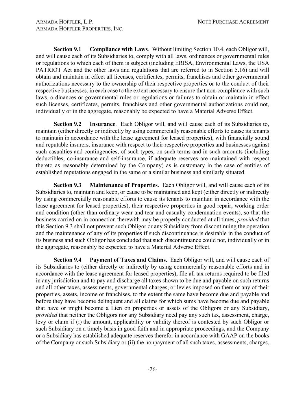 ARMADA HOFFLER, L.P. NOTE PURCHASE AGREEMENT ARMADA HOFFLER PROPERTIES, INC. -26- Section 9.1 Compliance with Laws. Without limiting Section 10.4, each Obligor will, and will cause each of its Subsidiaries to, comply with all laws, ordinances or governmental rules or regulations to which each of them is subject (including ERISA, Environmental Laws, the USA PATRIOT Act and the other laws and regulations that are referred to in Section 5.16) and will obtain and maintain in effect all licenses, certificates, permits, franchises and other governmental authorizations necessary to the ownership of their respective properties or to the conduct of their respective businesses, in each case to the extent necessary to ensure that non-compliance with such laws, ordinances or governmental rules or regulations or failures to obtain or maintain in effect such licenses, certificates, permits, franchises and other governmental authorizations could not, individually or in the aggregate, reasonably be expected to have a Material Adverse Effect. Section 9.2 Insurance. Each Obligor will, and will cause each of its Subsidiaries to, maintain (either directly or indirectly by using commercially reasonable efforts to cause its tenants to maintain in accordance with the lease agreement for leased properties), with financially sound and reputable insurers, insurance with respect to their respective properties and businesses against such casualties and contingencies, of such types, on such terms and in such amounts (including deductibles, co-insurance and self-insurance, if adequate reserves are maintained with respect thereto as reasonably determined by the Company) as is customary in the case of entities of established reputations engaged in the same or a similar business and similarly situated. Section 9.3 Maintenance of Properties. Each Obligor will, and will cause each of its Subsidiaries to, maintain and keep, or cause to be maintained and kept (either directly or indirectly by using commercially reasonable efforts to cause its tenants to maintain in accordance with the lease agreement for leased properties), their respective properties in good repair, working order and condition (other than ordinary wear and tear and casualty condemnation events), so that the business carried on in connection therewith may be properly conducted at all times, provided that this Section 9.3 shall not prevent such Obligor or any Subsidiary from discontinuing the operation and the maintenance of any of its properties if such discontinuance is desirable in the conduct of its business and such Obligor has concluded that such discontinuance could not, individually or in the aggregate, reasonably be expected to have a Material Adverse Effect. Section 9.4 Payment of Taxes and Claims. Each Obligor will, and will cause each of its Subsidiaries to (either directly or indirectly by using commercially reasonable efforts and in accordance with the lease agreement for leased properties), file all tax returns required to be filed in any jurisdiction and to pay and discharge all taxes shown to be due and payable on such returns and all other taxes, assessments, governmental charges, or levies imposed on them or any of their properties, assets, income or franchises, to the extent the same have become due and payable and before they have become delinquent and all claims for which sums have become due and payable that have or might become a Lien on properties or assets of the Obligors or any Subsidiary, provided that neither the Obligors nor any Subsidiary need pay any such tax, assessment, charge, levy or claim if (i) the amount, applicability or validity thereof is contested by such Obligor or such Subsidiary on a timely basis in good faith and in appropriate proceedings, and the Company or a Subsidiary has established adequate reserves therefor in accordance with GAAP on the books of the Company or such Subsidiary or (ii) the nonpayment of all such taxes, assessments, charges,
