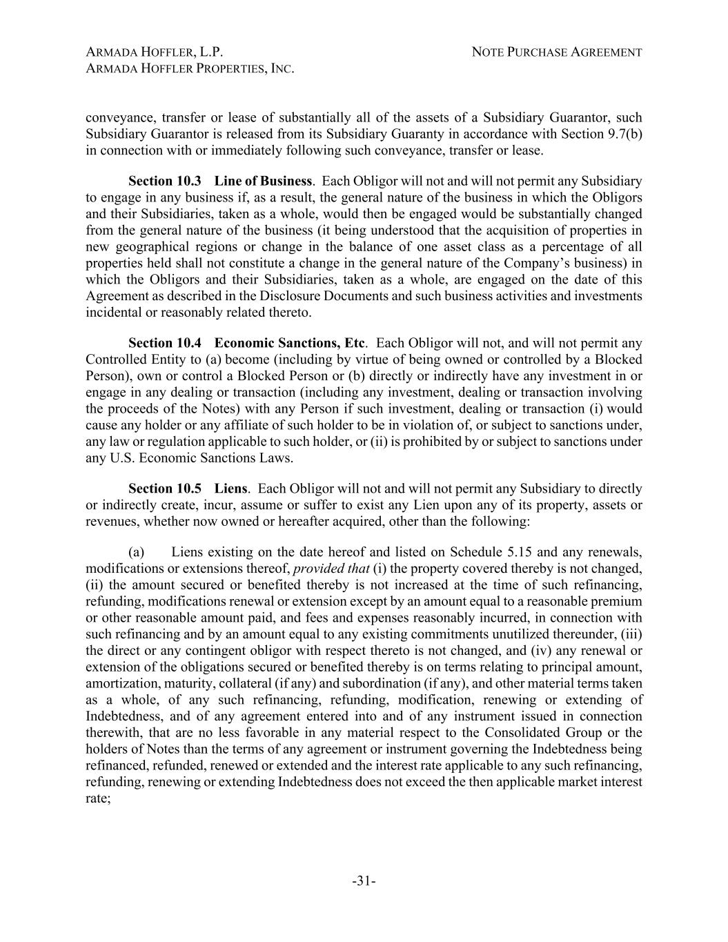 ARMADA HOFFLER, L.P. NOTE PURCHASE AGREEMENT ARMADA HOFFLER PROPERTIES, INC. -31- conveyance, transfer or lease of substantially all of the assets of a Subsidiary Guarantor, such Subsidiary Guarantor is released from its Subsidiary Guaranty in accordance with Section 9.7(b) in connection with or immediately following such conveyance, transfer or lease. Section 10.3 Line of Business. Each Obligor will not and will not permit any Subsidiary to engage in any business if, as a result, the general nature of the business in which the Obligors and their Subsidiaries, taken as a whole, would then be engaged would be substantially changed from the general nature of the business (it being understood that the acquisition of properties in new geographical regions or change in the balance of one asset class as a percentage of all properties held shall not constitute a change in the general nature of the Company’s business) in which the Obligors and their Subsidiaries, taken as a whole, are engaged on the date of this Agreement as described in the Disclosure Documents and such business activities and investments incidental or reasonably related thereto. Section 10.4 Economic Sanctions, Etc. Each Obligor will not, and will not permit any Controlled Entity to (a) become (including by virtue of being owned or controlled by a Blocked Person), own or control a Blocked Person or (b) directly or indirectly have any investment in or engage in any dealing or transaction (including any investment, dealing or transaction involving the proceeds of the Notes) with any Person if such investment, dealing or transaction (i) would cause any holder or any affiliate of such holder to be in violation of, or subject to sanctions under, any law or regulation applicable to such holder, or (ii) is prohibited by or subject to sanctions under any U.S. Economic Sanctions Laws. Section 10.5 Liens. Each Obligor will not and will not permit any Subsidiary to directly or indirectly create, incur, assume or suffer to exist any Lien upon any of its property, assets or revenues, whether now owned or hereafter acquired, other than the following: (a) Liens existing on the date hereof and listed on Schedule 5.15 and any renewals, modifications or extensions thereof, provided that (i) the property covered thereby is not changed, (ii) the amount secured or benefited thereby is not increased at the time of such refinancing, refunding, modifications renewal or extension except by an amount equal to a reasonable premium or other reasonable amount paid, and fees and expenses reasonably incurred, in connection with such refinancing and by an amount equal to any existing commitments unutilized thereunder, (iii) the direct or any contingent obligor with respect thereto is not changed, and (iv) any renewal or extension of the obligations secured or benefited thereby is on terms relating to principal amount, amortization, maturity, collateral (if any) and subordination (if any), and other material terms taken as a whole, of any such refinancing, refunding, modification, renewing or extending of Indebtedness, and of any agreement entered into and of any instrument issued in connection therewith, that are no less favorable in any material respect to the Consolidated Group or the holders of Notes than the terms of any agreement or instrument governing the Indebtedness being refinanced, refunded, renewed or extended and the interest rate applicable to any such refinancing, refunding, renewing or extending Indebtedness does not exceed the then applicable market interest rate;