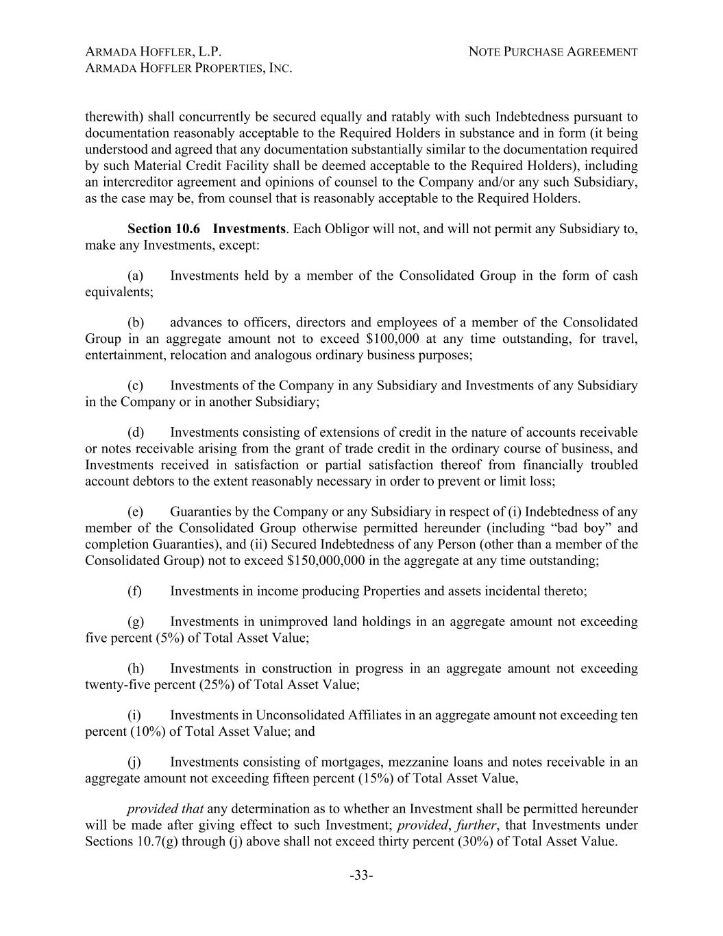 ARMADA HOFFLER, L.P. NOTE PURCHASE AGREEMENT ARMADA HOFFLER PROPERTIES, INC. -33- therewith) shall concurrently be secured equally and ratably with such Indebtedness pursuant to documentation reasonably acceptable to the Required Holders in substance and in form (it being understood and agreed that any documentation substantially similar to the documentation required by such Material Credit Facility shall be deemed acceptable to the Required Holders), including an intercreditor agreement and opinions of counsel to the Company and/or any such Subsidiary, as the case may be, from counsel that is reasonably acceptable to the Required Holders. Section 10.6 Investments. Each Obligor will not, and will not permit any Subsidiary to, make any Investments, except: (a) Investments held by a member of the Consolidated Group in the form of cash equivalents; (b) advances to officers, directors and employees of a member of the Consolidated Group in an aggregate amount not to exceed $100,000 at any time outstanding, for travel, entertainment, relocation and analogous ordinary business purposes; (c) Investments of the Company in any Subsidiary and Investments of any Subsidiary in the Company or in another Subsidiary; (d) Investments consisting of extensions of credit in the nature of accounts receivable or notes receivable arising from the grant of trade credit in the ordinary course of business, and Investments received in satisfaction or partial satisfaction thereof from financially troubled account debtors to the extent reasonably necessary in order to prevent or limit loss; (e) Guaranties by the Company or any Subsidiary in respect of (i) Indebtedness of any member of the Consolidated Group otherwise permitted hereunder (including “bad boy” and completion Guaranties), and (ii) Secured Indebtedness of any Person (other than a member of the Consolidated Group) not to exceed $150,000,000 in the aggregate at any time outstanding; (f) Investments in income producing Properties and assets incidental thereto; (g) Investments in unimproved land holdings in an aggregate amount not exceeding five percent (5%) of Total Asset Value; (h) Investments in construction in progress in an aggregate amount not exceeding twenty-five percent (25%) of Total Asset Value; (i) Investments in Unconsolidated Affiliates in an aggregate amount not exceeding ten percent (10%) of Total Asset Value; and (j) Investments consisting of mortgages, mezzanine loans and notes receivable in an aggregate amount not exceeding fifteen percent (15%) of Total Asset Value, provided that any determination as to whether an Investment shall be permitted hereunder will be made after giving effect to such Investment; provided, further, that Investments under Sections 10.7(g) through (j) above shall not exceed thirty percent (30%) of Total Asset Value.