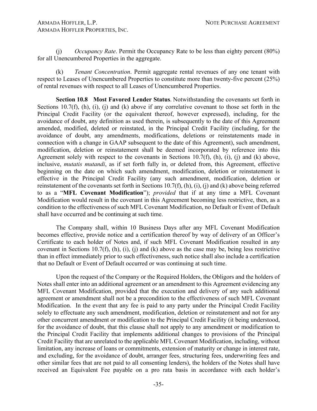 ARMADA HOFFLER, L.P. NOTE PURCHASE AGREEMENT ARMADA HOFFLER PROPERTIES, INC. -35- (j) Occupancy Rate. Permit the Occupancy Rate to be less than eighty percent (80%) for all Unencumbered Properties in the aggregate. (k) Tenant Concentration. Permit aggregate rental revenues of any one tenant with respect to Leases of Unencumbered Properties to constitute more than twenty-five percent (25%) of rental revenues with respect to all Leases of Unencumbered Properties. Section 10.8 Most Favored Lender Status. Notwithstanding the covenants set forth in Sections 10.7(f), (h), (i), (j) and (k) above if any correlative covenant to those set forth in the Principal Credit Facility (or the equivalent thereof, however expressed), including, for the avoidance of doubt, any definition as used therein, is subsequently to the date of this Agreement amended, modified, deleted or reinstated, in the Principal Credit Facility (including, for the avoidance of doubt, any amendments, modifications, deletions or reinstatements made in connection with a change in GAAP subsequent to the date of this Agreement), such amendment, modification, deletion or reinstatement shall be deemed incorporated by reference into this Agreement solely with respect to the covenants in Sections 10.7(f), (h), (i), (j) and (k) above, inclusive, mutatis mutandi, as if set forth fully in, or deleted from, this Agreement, effective beginning on the date on which such amendment, modification, deletion or reinstatement is effective in the Principal Credit Facility (any such amendment, modification, deletion or reinstatement of the covenants set forth in Sections 10.7(f), (h), (i), (j) and (k) above being referred to as a “MFL Covenant Modification”); provided that if at any time a MFL Covenant Modification would result in the covenant in this Agreement becoming less restrictive, then, as a condition to the effectiveness of such MFL Covenant Modification, no Default or Event of Default shall have occurred and be continuing at such time. The Company shall, within 10 Business Days after any MFL Covenant Modification becomes effective, provide notice and a certification thereof by way of delivery of an Officer’s Certificate to each holder of Notes and, if such MFL Covenant Modification resulted in any covenant in Sections 10.7(f), (h), (i), (j) and (k) above as the case may be, being less restrictive than in effect immediately prior to such effectiveness, such notice shall also include a certification that no Default or Event of Default occurred or was continuing at such time. Upon the request of the Company or the Required Holders, the Obligors and the holders of Notes shall enter into an additional agreement or an amendment to this Agreement evidencing any MFL Covenant Modification, provided that the execution and delivery of any such additional agreement or amendment shall not be a precondition to the effectiveness of such MFL Covenant Modification. In the event that any fee is paid to any party under the Principal Credit Facility solely to effectuate any such amendment, modification, deletion or reinstatement and not for any other concurrent amendment or modification to the Principal Credit Facility (it being understood, for the avoidance of doubt, that this clause shall not apply to any amendment or modification to the Principal Credit Facility that implements additional changes to provisions of the Principal Credit Facility that are unrelated to the applicable MFL Covenant Modification, including, without limitation, any increase of loans or commitments, extension of maturity or change in interest rate, and excluding, for the avoidance of doubt, arranger fees, structuring fees, underwriting fees and other similar fees that are not paid to all consenting lenders), the holders of the Notes shall have received an Equivalent Fee payable on a pro rata basis in accordance with each holder’s