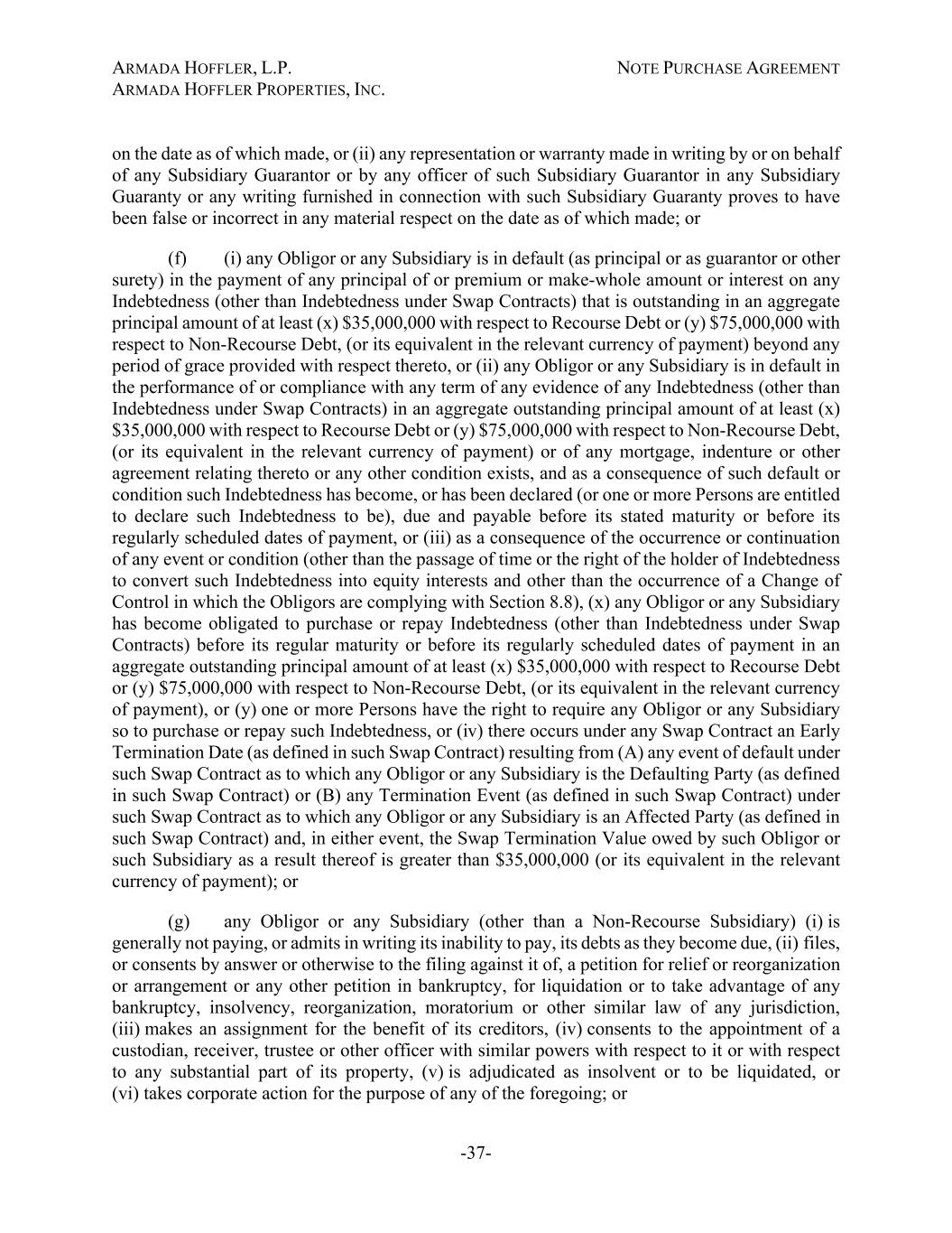 ARMADA HOFFLER, L.P. NOTE PURCHASE AGREEMENT ARMADA HOFFLER PROPERTIES, INC. -37- on the date as of which made, or (ii) any representation or warranty made in writing by or on behalf of any Subsidiary Guarantor or by any officer of such Subsidiary Guarantor in any Subsidiary Guaranty or any writing furnished in connection with such Subsidiary Guaranty proves to have been false or incorrect in any material respect on the date as of which made; or (f) (i) any Obligor or any Subsidiary is in default (as principal or as guarantor or other surety) in the payment of any principal of or premium or make-whole amount or interest on any Indebtedness (other than Indebtedness under Swap Contracts) that is outstanding in an aggregate principal amount of at least (x) $35,000,000 with respect to Recourse Debt or (y) $75,000,000 with respect to Non-Recourse Debt, (or its equivalent in the relevant currency of payment) beyond any period of grace provided with respect thereto, or (ii) any Obligor or any Subsidiary is in default in the performance of or compliance with any term of any evidence of any Indebtedness (other than Indebtedness under Swap Contracts) in an aggregate outstanding principal amount of at least (x) $35,000,000 with respect to Recourse Debt or (y) $75,000,000 with respect to Non-Recourse Debt, (or its equivalent in the relevant currency of payment) or of any mortgage, indenture or other agreement relating thereto or any other condition exists, and as a consequence of such default or condition such Indebtedness has become, or has been declared (or one or more Persons are entitled to declare such Indebtedness to be), due and payable before its stated maturity or before its regularly scheduled dates of payment, or (iii) as a consequence of the occurrence or continuation of any event or condition (other than the passage of time or the right of the holder of Indebtedness to convert such Indebtedness into equity interests and other than the occurrence of a Change of Control in which the Obligors are complying with Section 8.8), (x) any Obligor or any Subsidiary has become obligated to purchase or repay Indebtedness (other than Indebtedness under Swap Contracts) before its regular maturity or before its regularly scheduled dates of payment in an aggregate outstanding principal amount of at least (x) $35,000,000 with respect to Recourse Debt or (y) $75,000,000 with respect to Non-Recourse Debt, (or its equivalent in the relevant currency of payment), or (y) one or more Persons have the right to require any Obligor or any Subsidiary so to purchase or repay such Indebtedness, or (iv) there occurs under any Swap Contract an Early Termination Date (as defined in such Swap Contract) resulting from (A) any event of default under such Swap Contract as to which any Obligor or any Subsidiary is the Defaulting Party (as defined in such Swap Contract) or (B) any Termination Event (as defined in such Swap Contract) under such Swap Contract as to which any Obligor or any Subsidiary is an Affected Party (as defined in such Swap Contract) and, in either event, the Swap Termination Value owed by such Obligor or such Subsidiary as a result thereof is greater than $35,000,000 (or its equivalent in the relevant currency of payment); or (g) any Obligor or any Subsidiary (other than a Non-Recourse Subsidiary) (i) is generally not paying, or admits in writing its inability to pay, its debts as they become due, (ii) files, or consents by answer or otherwise to the filing against it of, a petition for relief or reorganization or arrangement or any other petition in bankruptcy, for liquidation or to take advantage of any bankruptcy, insolvency, reorganization, moratorium or other similar law of any jurisdiction, (iii) makes an assignment for the benefit of its creditors, (iv) consents to the appointment of a custodian, receiver, trustee or other officer with similar powers with respect to it or with respect to any substantial part of its property, (v) is adjudicated as insolvent or to be liquidated, or (vi) takes corporate action for the purpose of any of the foregoing; or