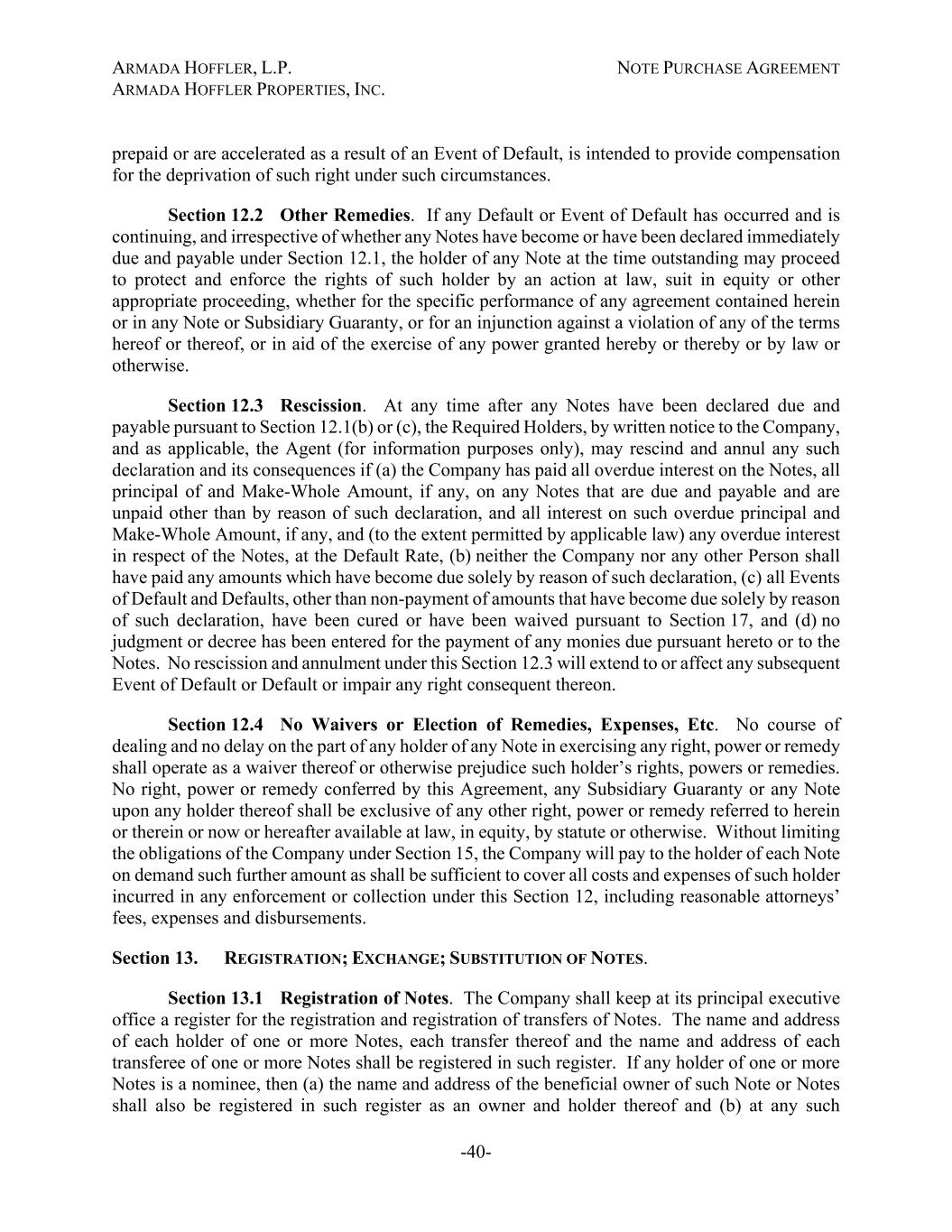 ARMADA HOFFLER, L.P. NOTE PURCHASE AGREEMENT ARMADA HOFFLER PROPERTIES, INC. -40- prepaid or are accelerated as a result of an Event of Default, is intended to provide compensation for the deprivation of such right under such circumstances. Section 12.2 Other Remedies. If any Default or Event of Default has occurred and is continuing, and irrespective of whether any Notes have become or have been declared immediately due and payable under Section 12.1, the holder of any Note at the time outstanding may proceed to protect and enforce the rights of such holder by an action at law, suit in equity or other appropriate proceeding, whether for the specific performance of any agreement contained herein or in any Note or Subsidiary Guaranty, or for an injunction against a violation of any of the terms hereof or thereof, or in aid of the exercise of any power granted hereby or thereby or by law or otherwise. Section 12.3 Rescission. At any time after any Notes have been declared due and payable pursuant to Section 12.1(b) or (c), the Required Holders, by written notice to the Company, and as applicable, the Agent (for information purposes only), may rescind and annul any such declaration and its consequences if (a) the Company has paid all overdue interest on the Notes, all principal of and Make-Whole Amount, if any, on any Notes that are due and payable and are unpaid other than by reason of such declaration, and all interest on such overdue principal and Make-Whole Amount, if any, and (to the extent permitted by applicable law) any overdue interest in respect of the Notes, at the Default Rate, (b) neither the Company nor any other Person shall have paid any amounts which have become due solely by reason of such declaration, (c) all Events of Default and Defaults, other than non-payment of amounts that have become due solely by reason of such declaration, have been cured or have been waived pursuant to Section 17, and (d) no judgment or decree has been entered for the payment of any monies due pursuant hereto or to the Notes. No rescission and annulment under this Section 12.3 will extend to or affect any subsequent Event of Default or Default or impair any right consequent thereon. Section 12.4 No Waivers or Election of Remedies, Expenses, Etc. No course of dealing and no delay on the part of any holder of any Note in exercising any right, power or remedy shall operate as a waiver thereof or otherwise prejudice such holder’s rights, powers or remedies. No right, power or remedy conferred by this Agreement, any Subsidiary Guaranty or any Note upon any holder thereof shall be exclusive of any other right, power or remedy referred to herein or therein or now or hereafter available at law, in equity, by statute or otherwise. Without limiting the obligations of the Company under Section 15, the Company will pay to the holder of each Note on demand such further amount as shall be sufficient to cover all costs and expenses of such holder incurred in any enforcement or collection under this Section 12, including reasonable attorneys’ fees, expenses and disbursements. Section 13. REGISTRATION; EXCHANGE; SUBSTITUTION OF NOTES. Section 13.1 Registration of Notes. The Company shall keep at its principal executive office a register for the registration and registration of transfers of Notes. The name and address of each holder of one or more Notes, each transfer thereof and the name and address of each transferee of one or more Notes shall be registered in such register. If any holder of one or more Notes is a nominee, then (a) the name and address of the beneficial owner of such Note or Notes shall also be registered in such register as an owner and holder thereof and (b) at any such