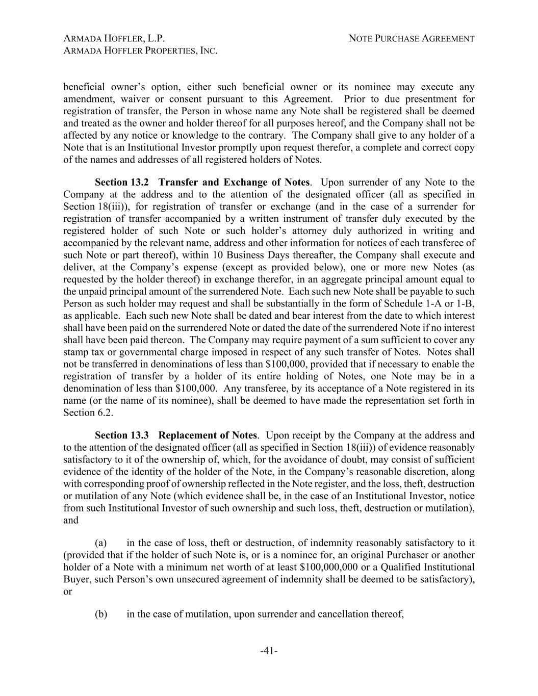 ARMADA HOFFLER, L.P. NOTE PURCHASE AGREEMENT ARMADA HOFFLER PROPERTIES, INC. -41- beneficial owner’s option, either such beneficial owner or its nominee may execute any amendment, waiver or consent pursuant to this Agreement. Prior to due presentment for registration of transfer, the Person in whose name any Note shall be registered shall be deemed and treated as the owner and holder thereof for all purposes hereof, and the Company shall not be affected by any notice or knowledge to the contrary. The Company shall give to any holder of a Note that is an Institutional Investor promptly upon request therefor, a complete and correct copy of the names and addresses of all registered holders of Notes. Section 13.2 Transfer and Exchange of Notes. Upon surrender of any Note to the Company at the address and to the attention of the designated officer (all as specified in Section 18(iii)), for registration of transfer or exchange (and in the case of a surrender for registration of transfer accompanied by a written instrument of transfer duly executed by the registered holder of such Note or such holder’s attorney duly authorized in writing and accompanied by the relevant name, address and other information for notices of each transferee of such Note or part thereof), within 10 Business Days thereafter, the Company shall execute and deliver, at the Company’s expense (except as provided below), one or more new Notes (as requested by the holder thereof) in exchange therefor, in an aggregate principal amount equal to the unpaid principal amount of the surrendered Note. Each such new Note shall be payable to such Person as such holder may request and shall be substantially in the form of Schedule 1-A or 1-B, as applicable. Each such new Note shall be dated and bear interest from the date to which interest shall have been paid on the surrendered Note or dated the date of the surrendered Note if no interest shall have been paid thereon. The Company may require payment of a sum sufficient to cover any stamp tax or governmental charge imposed in respect of any such transfer of Notes. Notes shall not be transferred in denominations of less than $100,000, provided that if necessary to enable the registration of transfer by a holder of its entire holding of Notes, one Note may be in a denomination of less than $100,000. Any transferee, by its acceptance of a Note registered in its name (or the name of its nominee), shall be deemed to have made the representation set forth in Section 6.2. Section 13.3 Replacement of Notes. Upon receipt by the Company at the address and to the attention of the designated officer (all as specified in Section 18(iii)) of evidence reasonably satisfactory to it of the ownership of, which, for the avoidance of doubt, may consist of sufficient evidence of the identity of the holder of the Note, in the Company’s reasonable discretion, along with corresponding proof of ownership reflected in the Note register, and the loss, theft, destruction or mutilation of any Note (which evidence shall be, in the case of an Institutional Investor, notice from such Institutional Investor of such ownership and such loss, theft, destruction or mutilation), and (a) in the case of loss, theft or destruction, of indemnity reasonably satisfactory to it (provided that if the holder of such Note is, or is a nominee for, an original Purchaser or another holder of a Note with a minimum net worth of at least $100,000,000 or a Qualified Institutional Buyer, such Person’s own unsecured agreement of indemnity shall be deemed to be satisfactory), or (b) in the case of mutilation, upon surrender and cancellation thereof,