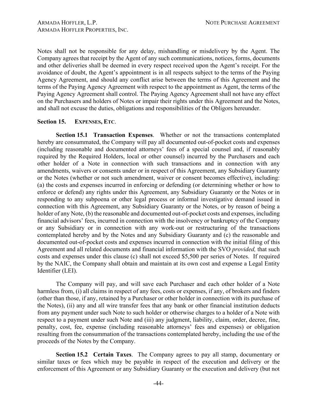 ARMADA HOFFLER, L.P. NOTE PURCHASE AGREEMENT ARMADA HOFFLER PROPERTIES, INC. -44- Notes shall not be responsible for any delay, mishandling or misdelivery by the Agent. The Company agrees that receipt by the Agent of any such communications, notices, forms, documents and other deliveries shall be deemed in every respect received upon the Agent’s receipt. For the avoidance of doubt, the Agent’s appointment is in all respects subject to the terms of the Paying Agency Agreement, and should any conflict arise between the terms of this Agreement and the terms of the Paying Agency Agreement with respect to the appointment as Agent, the terms of the Paying Agency Agreement shall control. The Paying Agency Agreement shall not have any effect on the Purchasers and holders of Notes or impair their rights under this Agreement and the Notes, and shall not excuse the duties, obligations and responsibilities of the Obligors hereunder. Section 15. EXPENSES, ETC. Section 15.1 Transaction Expenses. Whether or not the transactions contemplated hereby are consummated, the Company will pay all documented out-of-pocket costs and expenses (including reasonable and documented attorneys’ fees of a special counsel and, if reasonably required by the Required Holders, local or other counsel) incurred by the Purchasers and each other holder of a Note in connection with such transactions and in connection with any amendments, waivers or consents under or in respect of this Agreement, any Subsidiary Guaranty or the Notes (whether or not such amendment, waiver or consent becomes effective), including: (a) the costs and expenses incurred in enforcing or defending (or determining whether or how to enforce or defend) any rights under this Agreement, any Subsidiary Guaranty or the Notes or in responding to any subpoena or other legal process or informal investigative demand issued in connection with this Agreement, any Subsidiary Guaranty or the Notes, or by reason of being a holder of any Note, (b) the reasonable and documented out-of-pocket costs and expenses, including financial advisors’ fees, incurred in connection with the insolvency or bankruptcy of the Company or any Subsidiary or in connection with any work-out or restructuring of the transactions contemplated hereby and by the Notes and any Subsidiary Guaranty and (c) the reasonable and documented out-of-pocket costs and expenses incurred in connection with the initial filing of this Agreement and all related documents and financial information with the SVO provided, that such costs and expenses under this clause (c) shall not exceed $5,500 per series of Notes. If required by the NAIC, the Company shall obtain and maintain at its own cost and expense a Legal Entity Identifier (LEI). The Company will pay, and will save each Purchaser and each other holder of a Note harmless from, (i) all claims in respect of any fees, costs or expenses, if any, of brokers and finders (other than those, if any, retained by a Purchaser or other holder in connection with its purchase of the Notes), (ii) any and all wire transfer fees that any bank or other financial institution deducts from any payment under such Note to such holder or otherwise charges to a holder of a Note with respect to a payment under such Note and (iii) any judgment, liability, claim, order, decree, fine, penalty, cost, fee, expense (including reasonable attorneys’ fees and expenses) or obligation resulting from the consummation of the transactions contemplated hereby, including the use of the proceeds of the Notes by the Company. Section 15.2 Certain Taxes. The Company agrees to pay all stamp, documentary or similar taxes or fees which may be payable in respect of the execution and delivery or the enforcement of this Agreement or any Subsidiary Guaranty or the execution and delivery (but not