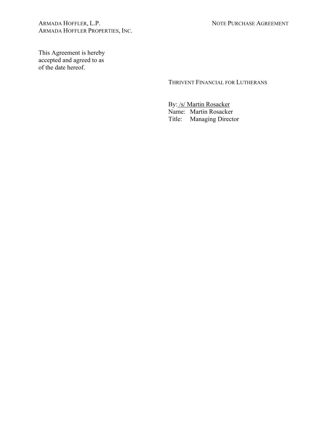 ARMADA HOFFLER, L.P. NOTE PURCHASE AGREEMENT ARMADA HOFFLER PROPERTIES, INC. This Agreement is hereby accepted and agreed to as of the date hereof. THRIVENT FINANCIAL FOR LUTHERANS By: /s/ Martin Rosacker Name: Martin Rosacker Title: Managing Director