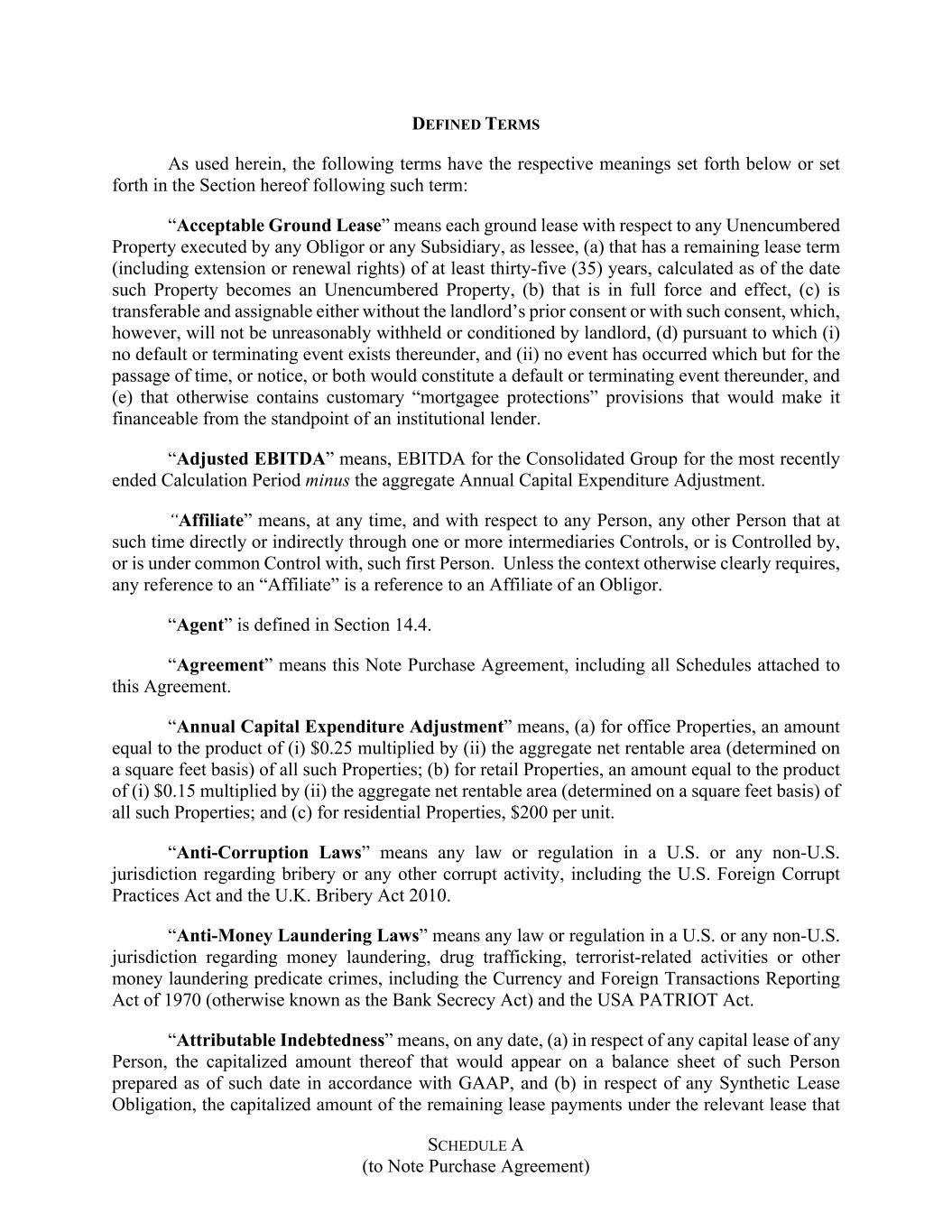 SCHEDULE A (to Note Purchase Agreement) DEFINED TERMS As used herein, the following terms have the respective meanings set forth below or set forth in the Section hereof following such term: “Acceptable Ground Lease” means each ground lease with respect to any Unencumbered Property executed by any Obligor or any Subsidiary, as lessee, (a) that has a remaining lease term (including extension or renewal rights) of at least thirty-five (35) years, calculated as of the date such Property becomes an Unencumbered Property, (b) that is in full force and effect, (c) is transferable and assignable either without the landlord’s prior consent or with such consent, which, however, will not be unreasonably withheld or conditioned by landlord, (d) pursuant to which (i) no default or terminating event exists thereunder, and (ii) no event has occurred which but for the passage of time, or notice, or both would constitute a default or terminating event thereunder, and (e) that otherwise contains customary “mortgagee protections” provisions that would make it financeable from the standpoint of an institutional lender. “Adjusted EBITDA” means, EBITDA for the Consolidated Group for the most recently ended Calculation Period minus the aggregate Annual Capital Expenditure Adjustment. “Affiliate” means, at any time, and with respect to any Person, any other Person that at such time directly or indirectly through one or more intermediaries Controls, or is Controlled by, or is under common Control with, such first Person. Unless the context otherwise clearly requires, any reference to an “Affiliate” is a reference to an Affiliate of an Obligor. “Agent” is defined in Section 14.4. “Agreement” means this Note Purchase Agreement, including all Schedules attached to this Agreement. “Annual Capital Expenditure Adjustment” means, (a) for office Properties, an amount equal to the product of (i) $0.25 multiplied by (ii) the aggregate net rentable area (determined on a square feet basis) of all such Properties; (b) for retail Properties, an amount equal to the product of (i) $0.15 multiplied by (ii) the aggregate net rentable area (determined on a square feet basis) of all such Properties; and (c) for residential Properties, $200 per unit. “Anti-Corruption Laws” means any law or regulation in a U.S. or any non-U.S. jurisdiction regarding bribery or any other corrupt activity, including the U.S. Foreign Corrupt Practices Act and the U.K. Bribery Act 2010. “Anti-Money Laundering Laws” means any law or regulation in a U.S. or any non-U.S. jurisdiction regarding money laundering, drug trafficking, terrorist-related activities or other money laundering predicate crimes, including the Currency and Foreign Transactions Reporting Act of 1970 (otherwise known as the Bank Secrecy Act) and the USA PATRIOT Act. “Attributable Indebtedness” means, on any date, (a) in respect of any capital lease of any Person, the capitalized amount thereof that would appear on a balance sheet of such Person prepared as of such date in accordance with GAAP, and (b) in respect of any Synthetic Lease Obligation, the capitalized amount of the remaining lease payments under the relevant lease that