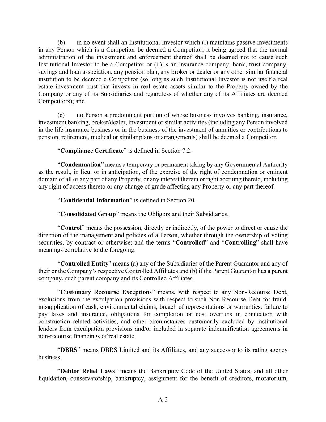 A-3 (b) in no event shall an Institutional Investor which (i) maintains passive investments in any Person which is a Competitor be deemed a Competitor, it being agreed that the normal administration of the investment and enforcement thereof shall be deemed not to cause such Institutional Investor to be a Competitor or (ii) is an insurance company, bank, trust company, savings and loan association, any pension plan, any broker or dealer or any other similar financial institution to be deemed a Competitor (so long as such Institutional Investor is not itself a real estate investment trust that invests in real estate assets similar to the Property owned by the Company or any of its Subsidiaries and regardless of whether any of its Affiliates are deemed Competitors); and (c) no Person a predominant portion of whose business involves banking, insurance, investment banking, broker/dealer, investment or similar activities (including any Person involved in the life insurance business or in the business of the investment of annuities or contributions to pension, retirement, medical or similar plans or arrangements) shall be deemed a Competitor. “Compliance Certificate” is defined in Section 7.2. “Condemnation” means a temporary or permanent taking by any Governmental Authority as the result, in lieu, or in anticipation, of the exercise of the right of condemnation or eminent domain of all or any part of any Property, or any interest therein or right accruing thereto, including any right of access thereto or any change of grade affecting any Property or any part thereof. “Confidential Information” is defined in Section 20. “Consolidated Group” means the Obligors and their Subsidiaries. “Control” means the possession, directly or indirectly, of the power to direct or cause the direction of the management and policies of a Person, whether through the ownership of voting securities, by contract or otherwise; and the terms “Controlled” and “Controlling” shall have meanings correlative to the foregoing. “Controlled Entity” means (a) any of the Subsidiaries of the Parent Guarantor and any of their or the Company’s respective Controlled Affiliates and (b) if the Parent Guarantor has a parent company, such parent company and its Controlled Affiliates. “Customary Recourse Exceptions” means, with respect to any Non-Recourse Debt, exclusions from the exculpation provisions with respect to such Non-Recourse Debt for fraud, misapplication of cash, environmental claims, breach of representations or warranties, failure to pay taxes and insurance, obligations for completion or cost overruns in connection with construction related activities, and other circumstances customarily excluded by institutional lenders from exculpation provisions and/or included in separate indemnification agreements in non-recourse financings of real estate. “DBRS” means DBRS Limited and its Affiliates, and any successor to its rating agency business. “Debtor Relief Laws” means the Bankruptcy Code of the United States, and all other liquidation, conservatorship, bankruptcy, assignment for the benefit of creditors, moratorium,