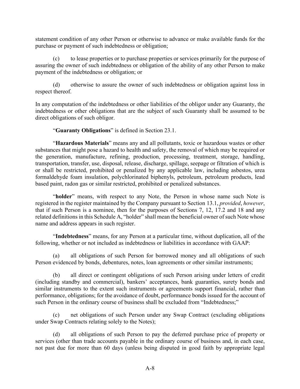 A-8 statement condition of any other Person or otherwise to advance or make available funds for the purchase or payment of such indebtedness or obligation; (c) to lease properties or to purchase properties or services primarily for the purpose of assuring the owner of such indebtedness or obligation of the ability of any other Person to make payment of the indebtedness or obligation; or (d) otherwise to assure the owner of such indebtedness or obligation against loss in respect thereof. In any computation of the indebtedness or other liabilities of the obligor under any Guaranty, the indebtedness or other obligations that are the subject of such Guaranty shall be assumed to be direct obligations of such obligor. “Guaranty Obligations” is defined in Section 23.1. “Hazardous Materials” means any and all pollutants, toxic or hazardous wastes or other substances that might pose a hazard to health and safety, the removal of which may be required or the generation, manufacture, refining, production, processing, treatment, storage, handling, transportation, transfer, use, disposal, release, discharge, spillage, seepage or filtration of which is or shall be restricted, prohibited or penalized by any applicable law, including asbestos, urea formaldehyde foam insulation, polychlorinated biphenyls, petroleum, petroleum products, lead based paint, radon gas or similar restricted, prohibited or penalized substances. “holder” means, with respect to any Note, the Person in whose name such Note is registered in the register maintained by the Company pursuant to Section 13.1, provided, however, that if such Person is a nominee, then for the purposes of Sections 7, 12, 17.2 and 18 and any related definitions in this Schedule A, “holder” shall mean the beneficial owner of such Note whose name and address appears in such register. “Indebtedness” means, for any Person at a particular time, without duplication, all of the following, whether or not included as indebtedness or liabilities in accordance with GAAP: (a) all obligations of such Person for borrowed money and all obligations of such Person evidenced by bonds, debentures, notes, loan agreements or other similar instruments; (b) all direct or contingent obligations of such Person arising under letters of credit (including standby and commercial), bankers’ acceptances, bank guaranties, surety bonds and similar instruments to the extent such instruments or agreements support financial, rather than performance, obligations; for the avoidance of doubt, performance bonds issued for the account of such Person in the ordinary course of business shall be excluded from “Indebtedness;” (c) net obligations of such Person under any Swap Contract (excluding obligations under Swap Contracts relating solely to the Notes); (d) all obligations of such Person to pay the deferred purchase price of property or services (other than trade accounts payable in the ordinary course of business and, in each case, not past due for more than 60 days (unless being disputed in good faith by appropriate legal