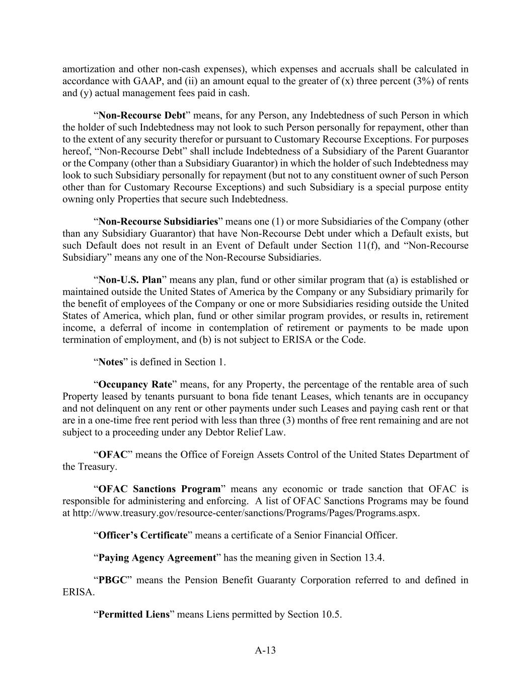 A-13 amortization and other non-cash expenses), which expenses and accruals shall be calculated in accordance with GAAP, and (ii) an amount equal to the greater of (x) three percent (3%) of rents and (y) actual management fees paid in cash. “Non-Recourse Debt” means, for any Person, any Indebtedness of such Person in which the holder of such Indebtedness may not look to such Person personally for repayment, other than to the extent of any security therefor or pursuant to Customary Recourse Exceptions. For purposes hereof, “Non-Recourse Debt” shall include Indebtedness of a Subsidiary of the Parent Guarantor or the Company (other than a Subsidiary Guarantor) in which the holder of such Indebtedness may look to such Subsidiary personally for repayment (but not to any constituent owner of such Person other than for Customary Recourse Exceptions) and such Subsidiary is a special purpose entity owning only Properties that secure such Indebtedness. “Non-Recourse Subsidiaries” means one (1) or more Subsidiaries of the Company (other than any Subsidiary Guarantor) that have Non-Recourse Debt under which a Default exists, but such Default does not result in an Event of Default under Section 11(f), and “Non-Recourse Subsidiary” means any one of the Non-Recourse Subsidiaries. “Non-U.S. Plan” means any plan, fund or other similar program that (a) is established or maintained outside the United States of America by the Company or any Subsidiary primarily for the benefit of employees of the Company or one or more Subsidiaries residing outside the United States of America, which plan, fund or other similar program provides, or results in, retirement income, a deferral of income in contemplation of retirement or payments to be made upon termination of employment, and (b) is not subject to ERISA or the Code. “Notes” is defined in Section 1. “Occupancy Rate” means, for any Property, the percentage of the rentable area of such Property leased by tenants pursuant to bona fide tenant Leases, which tenants are in occupancy and not delinquent on any rent or other payments under such Leases and paying cash rent or that are in a one-time free rent period with less than three (3) months of free rent remaining and are not subject to a proceeding under any Debtor Relief Law. “OFAC” means the Office of Foreign Assets Control of the United States Department of the Treasury. “OFAC Sanctions Program” means any economic or trade sanction that OFAC is responsible for administering and enforcing. A list of OFAC Sanctions Programs may be found at http://www.treasury.gov/resource-center/sanctions/Programs/Pages/Programs.aspx. “Officer’s Certificate” means a certificate of a Senior Financial Officer. “Paying Agency Agreement” has the meaning given in Section 13.4. “PBGC” means the Pension Benefit Guaranty Corporation referred to and defined in ERISA. “Permitted Liens” means Liens permitted by Section 10.5.