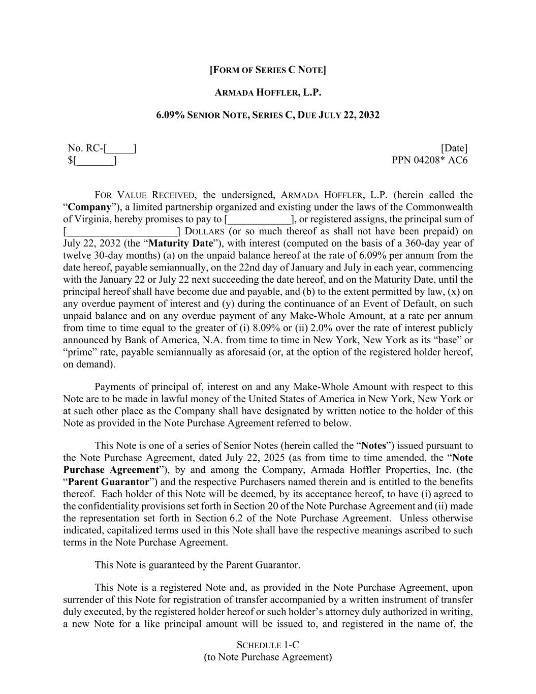 SCHEDULE 1-C (to Note Purchase Agreement) [FORM OF SERIES C NOTE] ARMADA HOFFLER, L.P. 6.09% SENIOR NOTE, SERIES C, DUE JULY 22, 2032 No. RC-[_____] [Date] $[_______] PPN 04208* AC6 FOR VALUE RECEIVED, the undersigned, ARMADA HOFFLER, L.P. (herein called the “Company”), a limited partnership organized and existing under the laws of the Commonwealth of Virginia, hereby promises to pay to [____________], or registered assigns, the principal sum of [_____________________] DOLLARS (or so much thereof as shall not have been prepaid) on July 22, 2032 (the “Maturity Date”), with interest (computed on the basis of a 360-day year of twelve 30-day months) (a) on the unpaid balance hereof at the rate of 6.09% per annum from the date hereof, payable semiannually, on the 22nd day of January and July in each year, commencing with the January 22 or July 22 next succeeding the date hereof, and on the Maturity Date, until the principal hereof shall have become due and payable, and (b) to the extent permitted by law, (x) on any overdue payment of interest and (y) during the continuance of an Event of Default, on such unpaid balance and on any overdue payment of any Make-Whole Amount, at a rate per annum from time to time equal to the greater of (i) 8.09% or (ii) 2.0% over the rate of interest publicly announced by Bank of America, N.A. from time to time in New York, New York as its “base” or “prime” rate, payable semiannually as aforesaid (or, at the option of the registered holder hereof, on demand). Payments of principal of, interest on and any Make-Whole Amount with respect to this Note are to be made in lawful money of the United States of America in New York, New York or at such other place as the Company shall have designated by written notice to the holder of this Note as provided in the Note Purchase Agreement referred to below. This Note is one of a series of Senior Notes (herein called the “Notes”) issued pursuant to the Note Purchase Agreement, dated July 22, 2025 (as from time to time amended, the “Note Purchase Agreement”), by and among the Company, Armada Hoffler Properties, Inc. (the “Parent Guarantor”) and the respective Purchasers named therein and is entitled to the benefits thereof. Each holder of this Note will be deemed, by its acceptance hereof, to have (i) agreed to the confidentiality provisions set forth in Section 20 of the Note Purchase Agreement and (ii) made the representation set forth in Section 6.2 of the Note Purchase Agreement. Unless otherwise indicated, capitalized terms used in this Note shall have the respective meanings ascribed to such terms in the Note Purchase Agreement. This Note is guaranteed by the Parent Guarantor. This Note is a registered Note and, as provided in the Note Purchase Agreement, upon surrender of this Note for registration of transfer accompanied by a written instrument of transfer duly executed, by the registered holder hereof or such holder’s attorney duly authorized in writing, a new Note for a like principal amount will be issued to, and registered in the name of, the